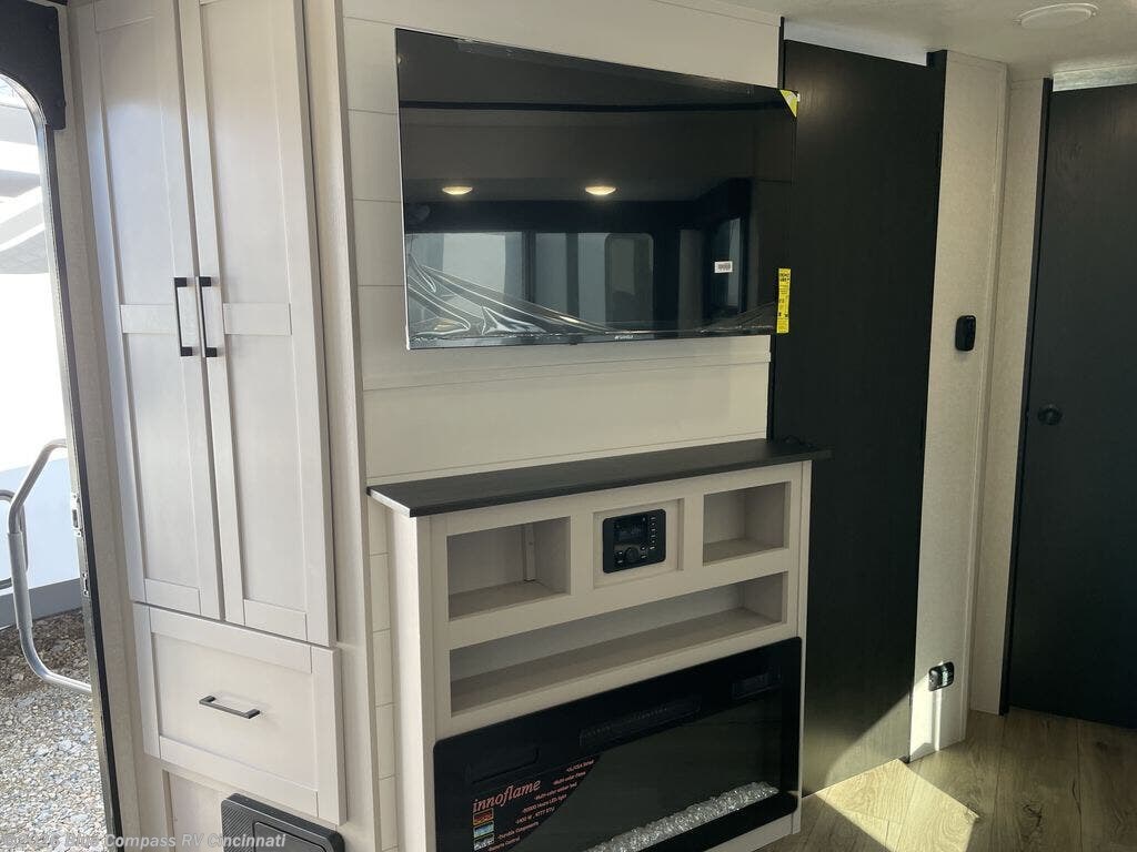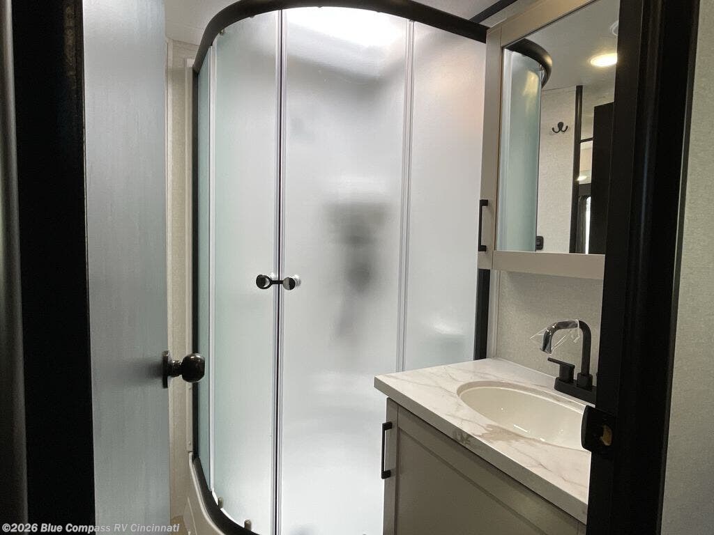 Step inside this spacious travel trailer through the front entry and you find the front kitchen that spans the width of the unit, providing plenty of counter space for meal prep. The kitchen is fully equipped with a stainless-steel sink, a decorative backsplash, a 3-burner cooktop, and an 11-cu. ft. 12V refrigerator, perfect for storing all your groceries. Overhead shelves offer convenient storage, and a pantry adds extra space for essentials. Next to the kitchen, you’ll find 60" theater seating, ideal for enjoying meals or watching your favorite shows on the LED Smart TV. As you move down the hall, you’ll come to a full bathroom featuring a radius shower and two entry doors for easy access. At the rear of the trailer, the comfortable bedroom features a 60" x 80" Queen bed, a sliding mirror door closet for added storage, and a second entry door to the exterior.