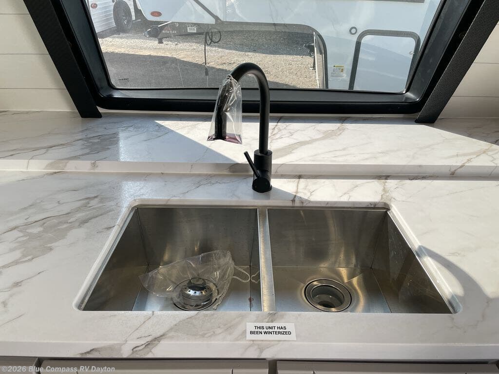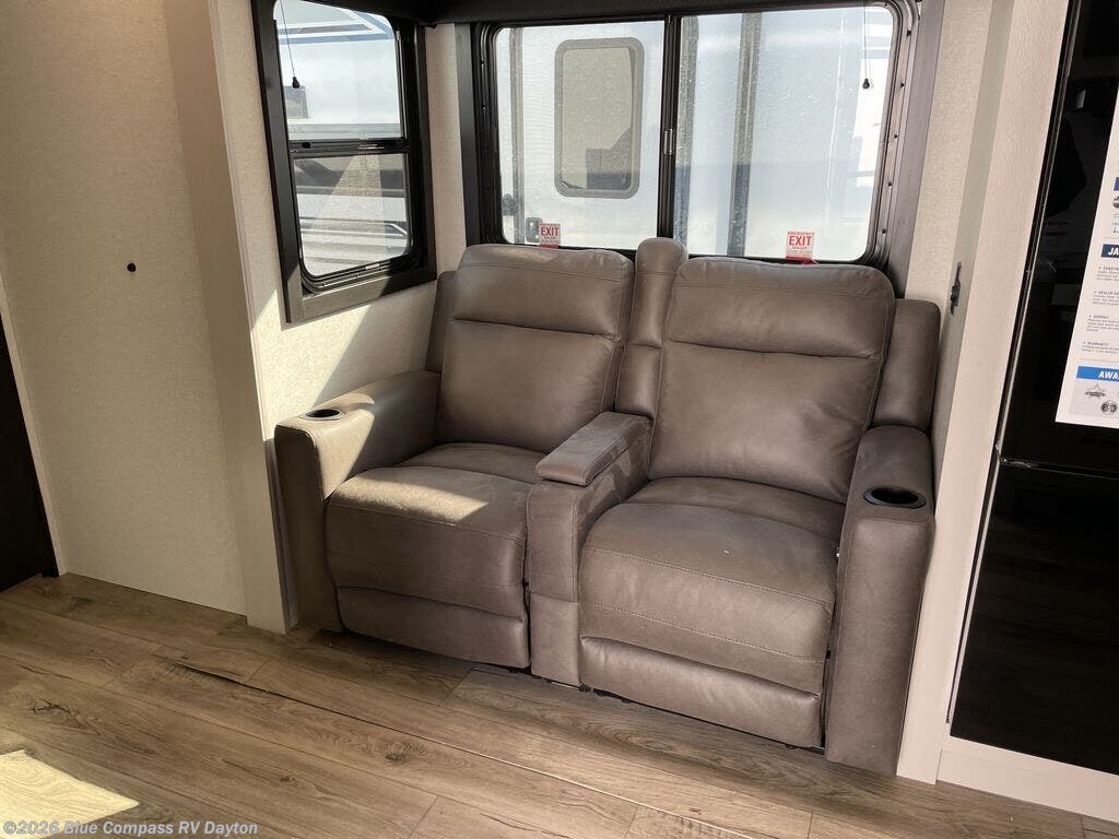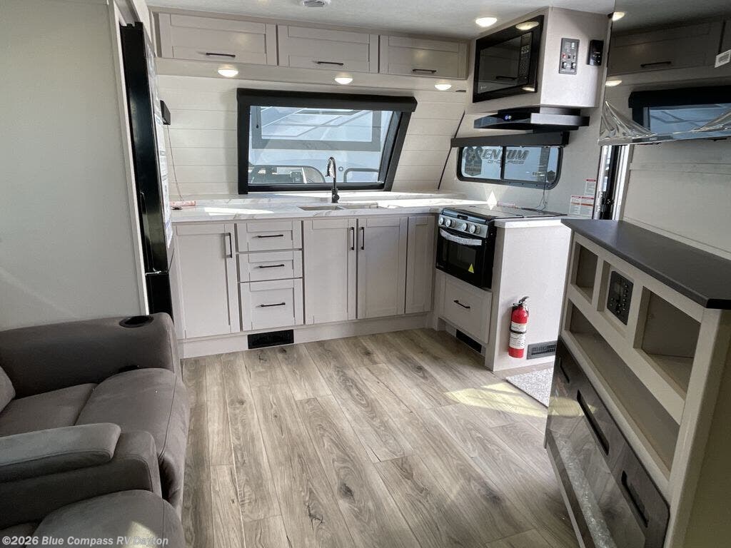 Step inside this spacious travel trailer through the front entry and you find the front kitchen that spans the width of the unit, providing plenty of counter space for meal prep. The kitchen is fully equipped with a stainless-steel sink, a decorative backsplash, a 3-burner cooktop, and an 11-cu. ft. 12V refrigerator, perfect for storing all your groceries. Overhead shelves offer convenient storage, and a pantry adds extra space for essentials. Next to the kitchen, you’ll find 60" theater seating, ideal for enjoying meals or watching your favorite shows on the LED Smart TV. As you move down the hall, you’ll come to a full bathroom featuring a radius shower and two entry doors for easy access. At the rear of the trailer, the comfortable bedroom features a 60" x 80" Queen bed, a sliding mirror door closet for added storage, and a second entry door to the exterior.
