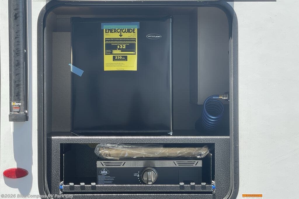 This travel trailer with a full rear bath is sure to bring you comfort wherever you camp. The front private bedroom with queen bed and dual wardrobes will have you feeling right at home. You can enjoy home cooked meals while at the campsite thanks to the three burner cooktop and 11 cu. ft. 12V refrigerator, plus there is a walk-in pantry to store all of your favorite snacks. The tri-fold sofa and booth dinette within the slide out offer comfortable places to relax. You can even cook breakfast outdoors using the outside kitchen and stay protected from the elements by the 19' power awning!
