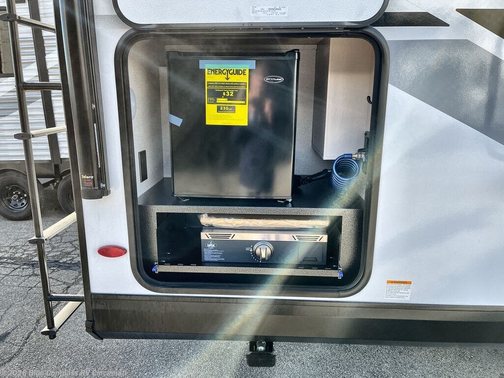 This travel trailer with a full rear bath is sure to bring you comfort wherever you camp. The front private bedroom with queen bed and dual wardrobes will have you feeling right at home. You can enjoy home cooked meals while at the campsite thanks to the three-burner cooktop and 11 cu. ft. 12V refrigerator, plus there is a walk-in pantry to store all of your favorite snacks along with a stainless-steel sink. The tri-fold sofa and booth dinette within the slide out offer comfortable places to relax and dine, both of them acting as extra sleeping space if needed. You can even cook breakfast outdoors using the outside kitchen and stay protected from the elements by the 19' power awning!