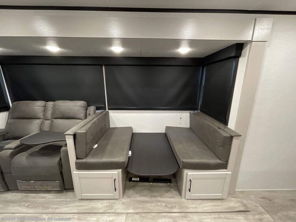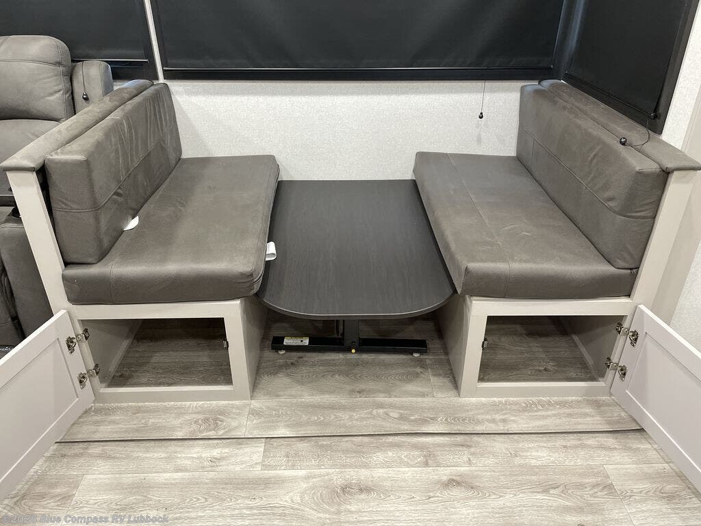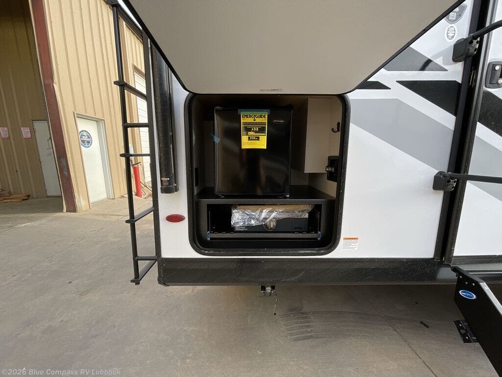 This travel trailer with a full rear bath is sure to bring you comfort wherever you camp. The front private bedroom with queen bed and dual wardrobes will have you feeling right at home. You can enjoy home cooked meals while at the campsite thanks to the three-burner cooktop and 11 cu. ft. 12V refrigerator, plus there is a walk-in pantry to store all of your favorite snacks along with a stainless-steel sink. The tri-fold sofa and booth dinette within the slide out offer comfortable places to relax and dine, both of them acting as extra sleeping space if needed. You can even cook breakfast outdoors using the outside kitchen and stay protected from the elements by the 19' power awning!
