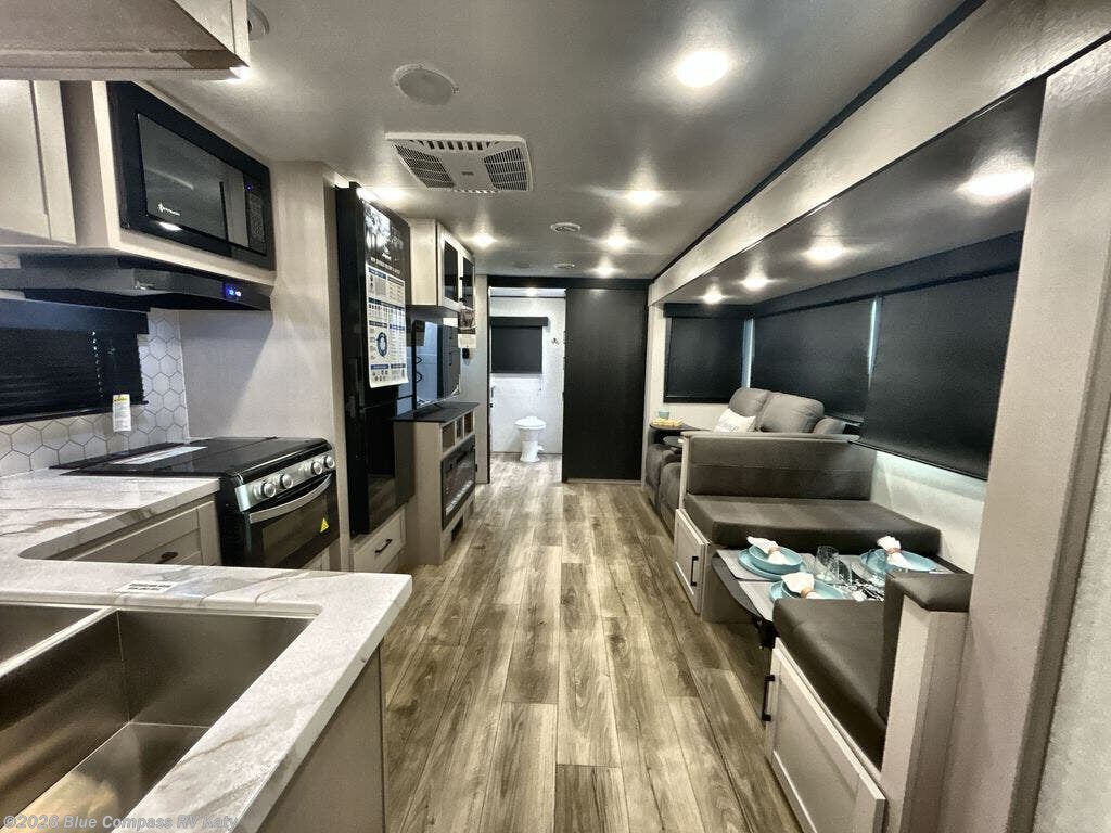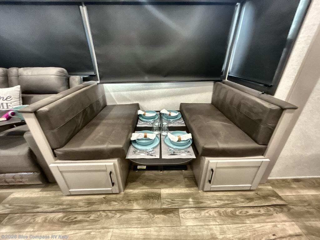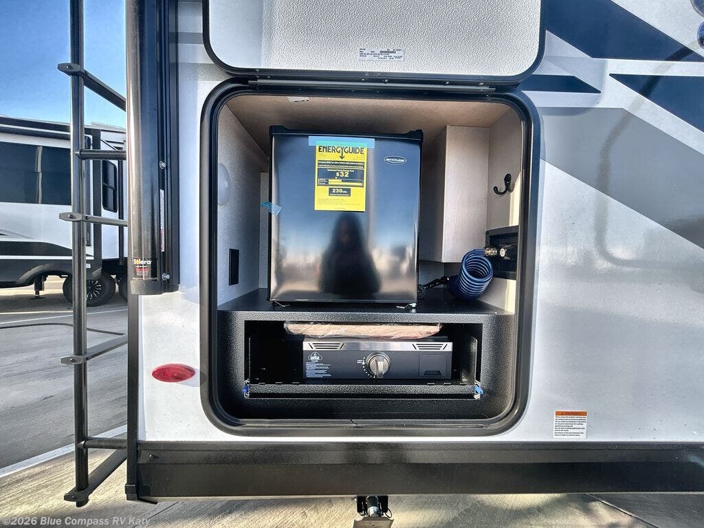 This travel trailer with a full rear bath is sure to bring you comfort wherever you camp. The front private bedroom with queen bed and dual wardrobes will have you feeling right at home. You can enjoy home cooked meals while at the campsite thanks to the three-burner cooktop and 11 cu. ft. 12V refrigerator, plus there is a walk-in pantry to store all of your favorite snacks along with a stainless-steel sink. The tri-fold sofa and booth dinette within the slide out offer comfortable places to relax and dine, both of them acting as extra sleeping space if needed. You can even cook breakfast outdoors using the outside kitchen and stay protected from the elements by the 19' power awning!