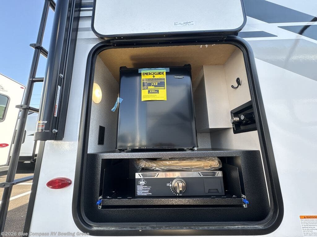 This travel trailer with a full rear bath is sure to bring you comfort wherever you camp. The front private bedroom with queen bed and dual wardrobes will have you feeling right at home. You can enjoy home cooked meals while at the campsite thanks to the three-burner cooktop and 11 cu. ft. 12V refrigerator, plus there is a walk-in pantry to store all of your favorite snacks along with a stainless-steel sink. The tri-fold sofa and booth dinette within the slide out offer comfortable places to relax and dine, both of them acting as extra sleeping space if needed. You can even cook breakfast outdoors using the outside kitchen and stay protected from the elements by the 19' power awning!