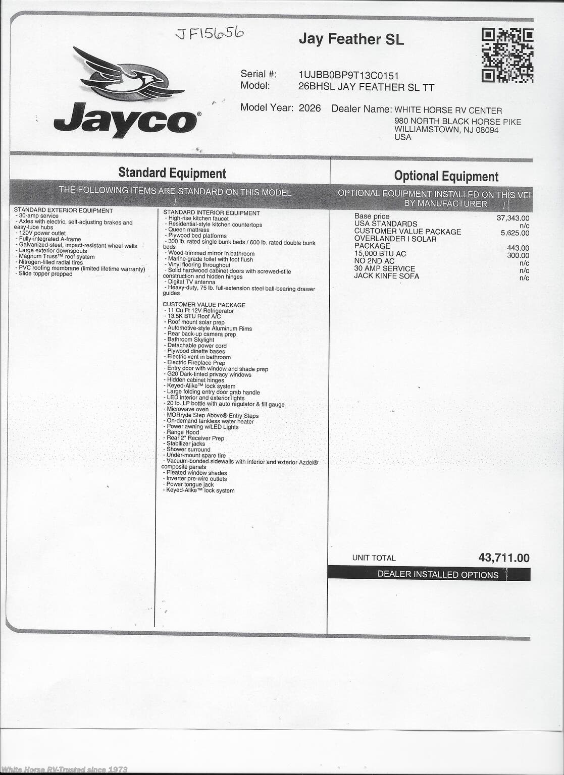 This incoming Stock #JF15656 also has the following factory options included: Interior Decor Dune Gray Overlander I Solar Package & 15,000 BTU AC all backed by Jayco’s 2+3-year warranty! MSRP $43,711.