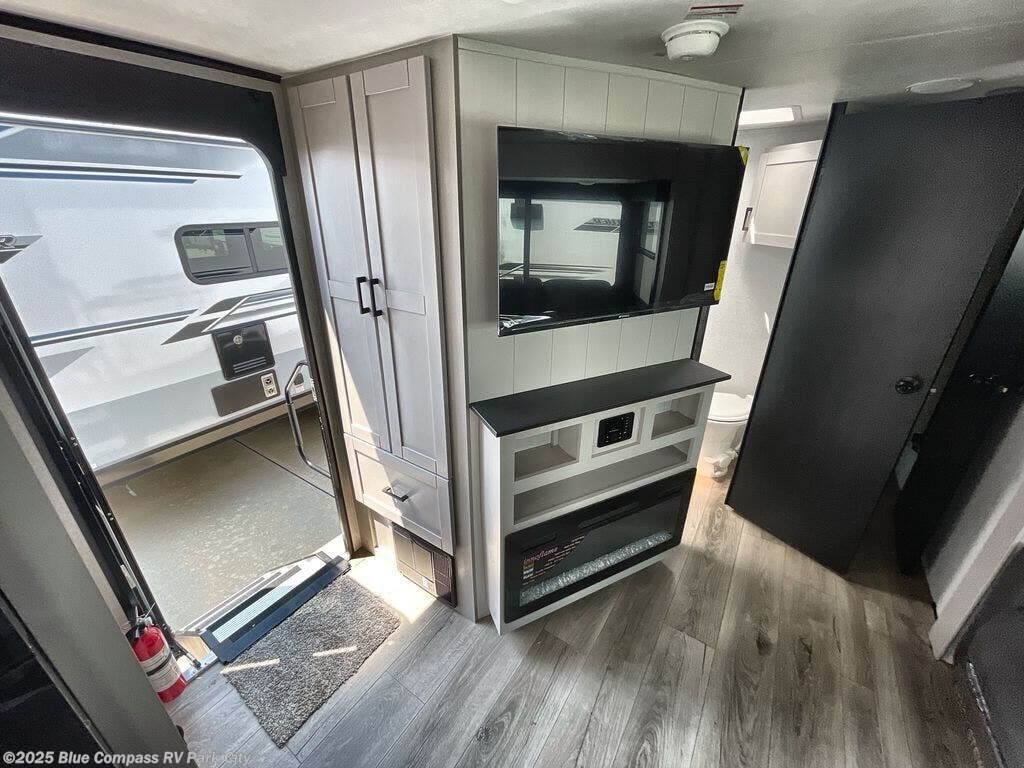 This front kitchen travel trailer will be perfect for camping trips to the lake or woods! The chef will appreciate ample counter space to prep meals plus an 11 cu. ft. 12V refrigerator to store leftovers. Your crew can dine at the booth dinette, then play a game after dinner is cleaned up. There is also a theater seat across from the entertainment center with an LED Smart TV to make it a movie night. A rear private bedroom is sure to make you feel right at home with a queen bed, dual wardrobes, and a dresser to keep your things organized. You'll also find one of the dual entry doors here for convenience!