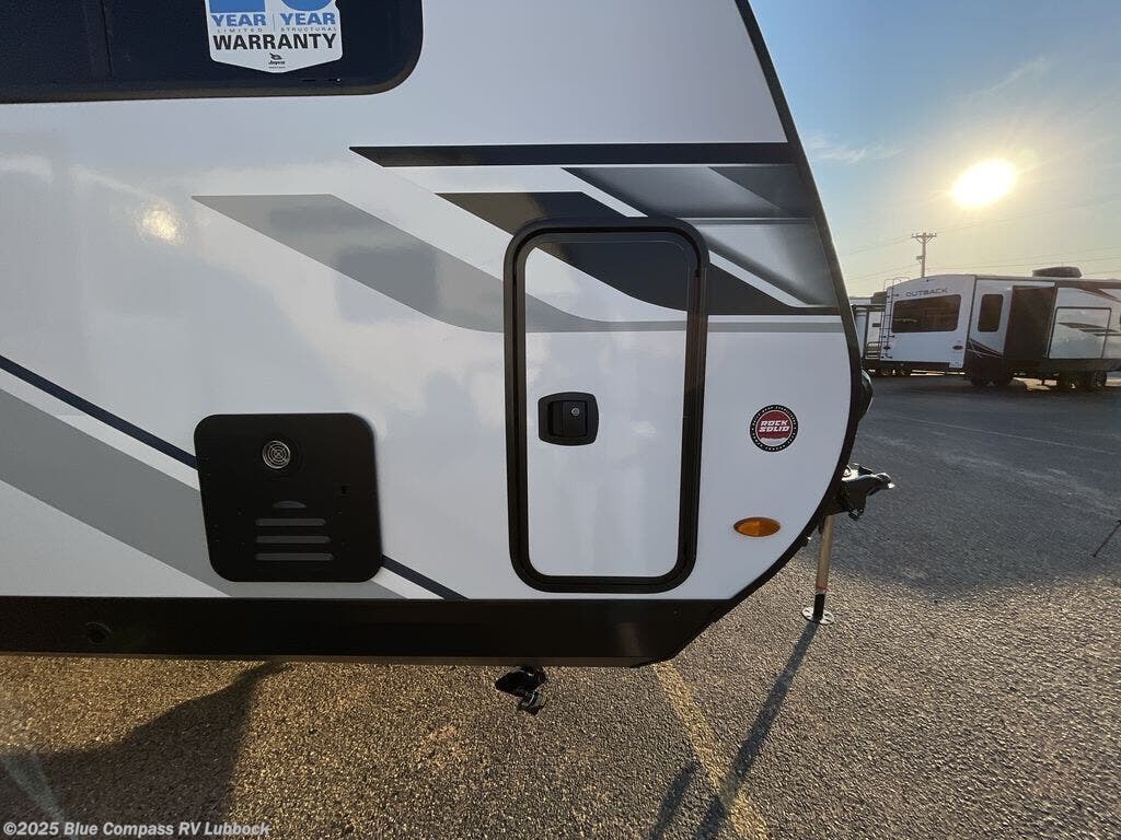 With any Jay Feather travel trailer by Jayco, you will enjoy lightweight towing, convenient exterior amenities, and at-home comforts inside! The Overlander 1 Solar Package included within the Jay Sport Package comes with a 200W solar panel and a 30-amp digital controller so you can enjoy some off-grid camping. There is also a modern graphics package with a dual-colored sidewall, LCI Solid Step fold-down aluminum tread steps on the main entry door, and Climate Shield 0 -100° F tested weather insulation package that will allow you to camp in all sorts of climates. The Customer Value Package will make time outdoors easier than ever with a power tongue jack and a Rock Solid stabilizer system, plus American-made nitro-filled Goodyear tires with self-adjusting electric brakes. More exterior features include a Keyed-Alike locking system, marine grade exterior speakers, a Magnum Truss roof system, and the list goes on! And we haven't even touched on the interior comforts, like the residential style seamless countertops and vinyl flooring throughout, decorative backsplash, handcrafted hardwood door/drawer fronts, and multiple USB charging ports to keep you going!