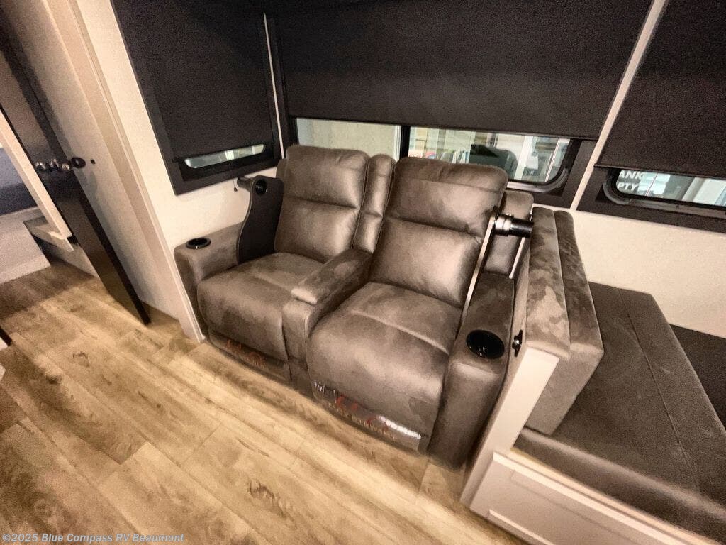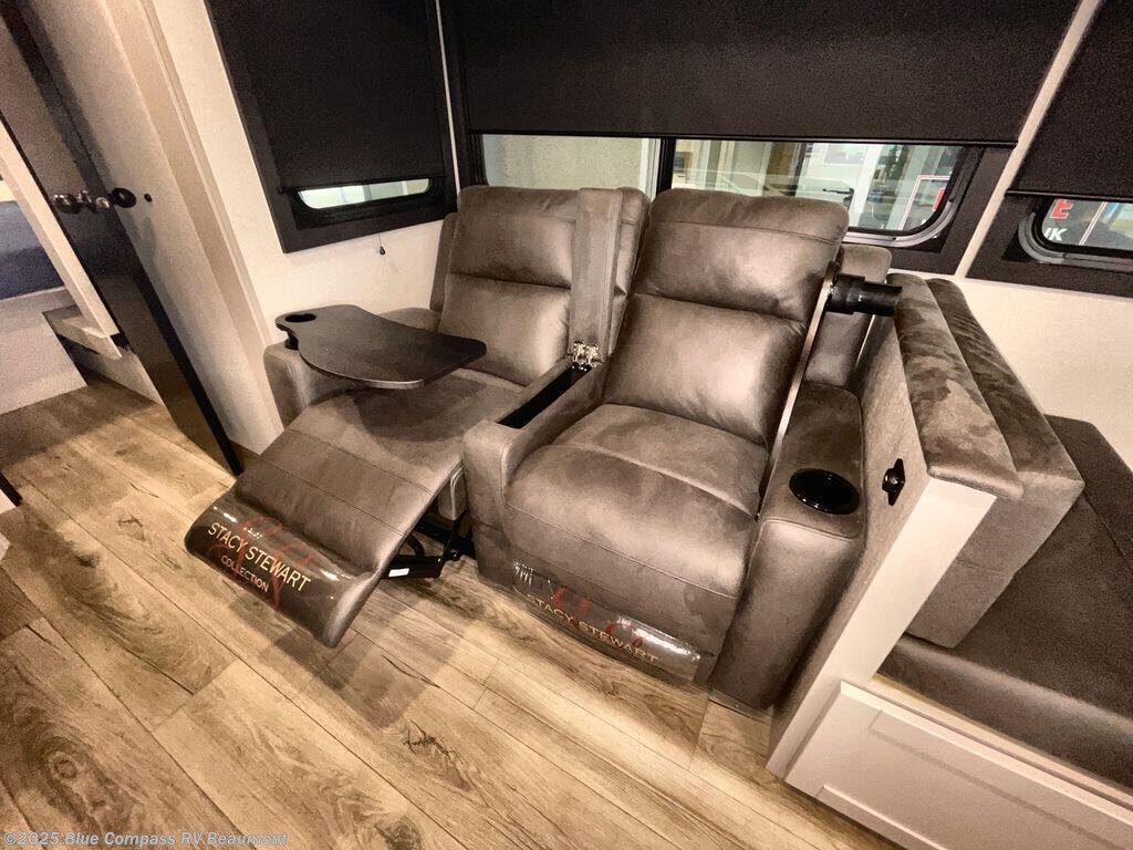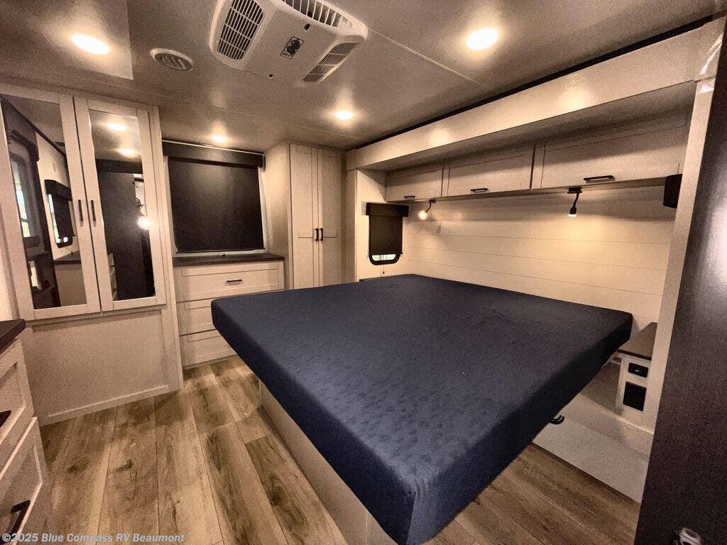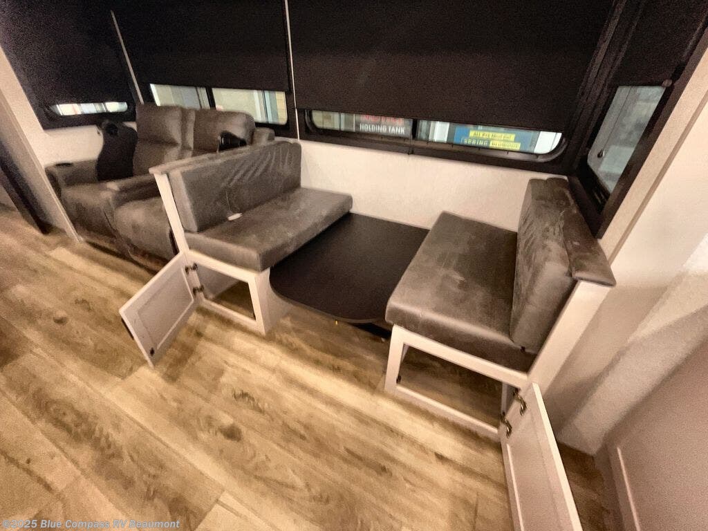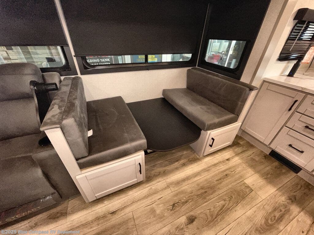 This front kitchen travel trailer will be perfect for camping trips to the lake or woods! The chef will appreciate ample counter space to prep meals plus an 11 cu. ft. 12V refrigerator to store leftovers. Your crew can dine at the booth dinette, then play a game after dinner is cleaned up. There is also a theater seat across from the entertainment center with an LED Smart TV to make it a movie night. A rear private bedroom is sure to make you feel right at home with a queen bed, dual wardrobes, and a dresser to keep your things organized. You'll also find one of the dual entry doors here for convenience!