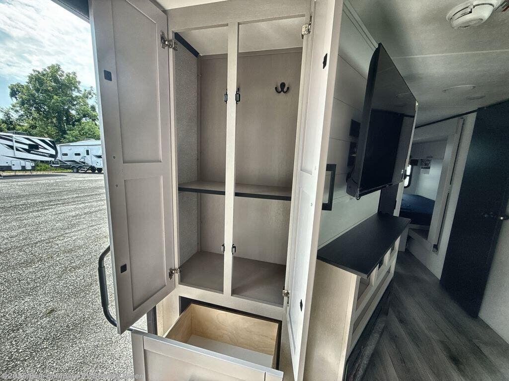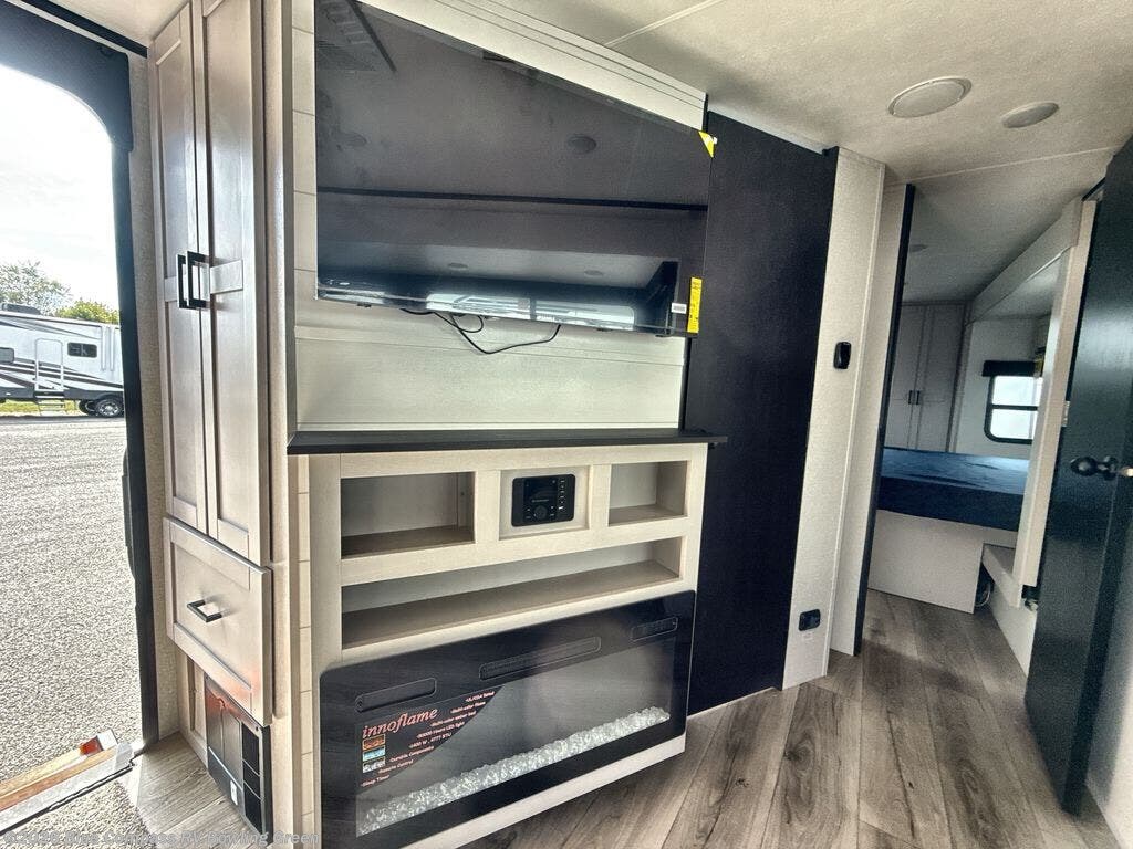 This front kitchen travel trailer will be perfect for camping trips to the lake or woods! The chef will appreciate ample counter space to prep meals plus an 11 cu. ft. 12V refrigerator to store leftovers. Your crew can dine at the booth dinette, then play a game after dinner is cleaned up. There is also a theater seat across from the entertainment center with an LED Smart TV to make it a movie night. A rear private bedroom is sure to make you feel right at home with a queen bed, dual wardrobes, and a dresser to keep your things organized. You'll also find one of the dual entry doors here for convenience!