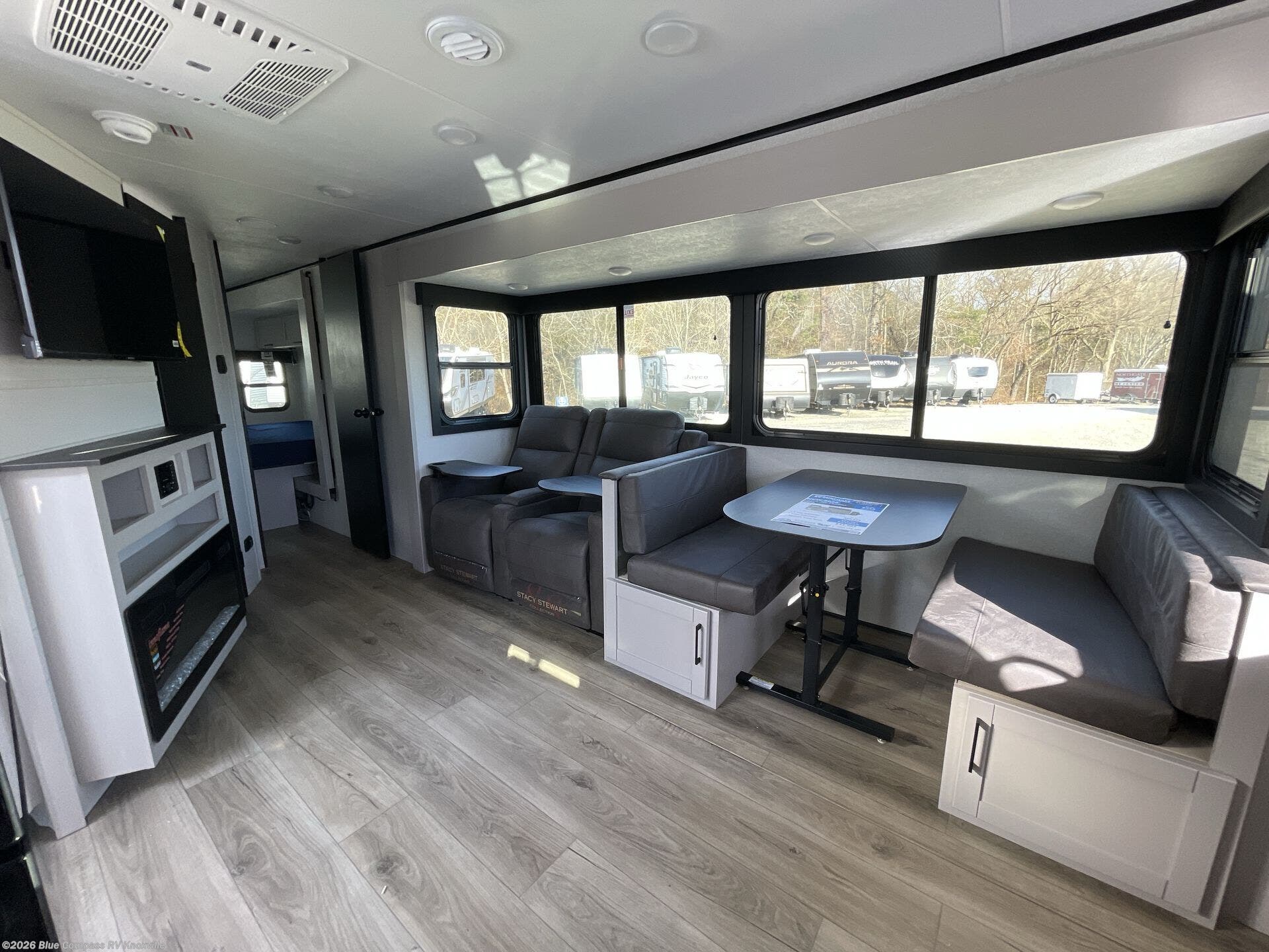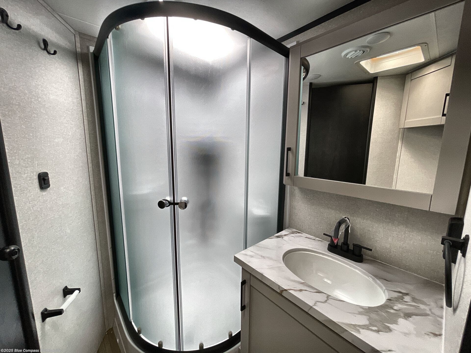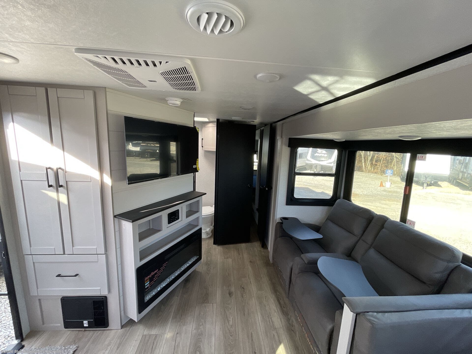 This front kitchen travel trailer will be perfect for camping trips to the lake or woods! The chef will appreciate ample counter space to prep meals plus an 11 cu. ft. 12V refrigerator to store leftovers, the front kitchen also has overhead cabinets and a pantry for storing your snacks and dry goods without worrying about space. Your crew can dine at the booth dinette, then play a game after dinner is cleaned up, this also works as a sleeping space if needed. There is also a theater seat across from the entertainment center with an LED Smart TV to make it a movie night. The bathroom has two entry doors for comfort and easy access along with a radial shower and medicine cabinet. A rear private bedroom is sure to make you feel right at home with a 60" x 80" queen bed, dual wardrobes, and a dresser to keep your things organized. You'll also find one of the dual entry doors here for convenience!