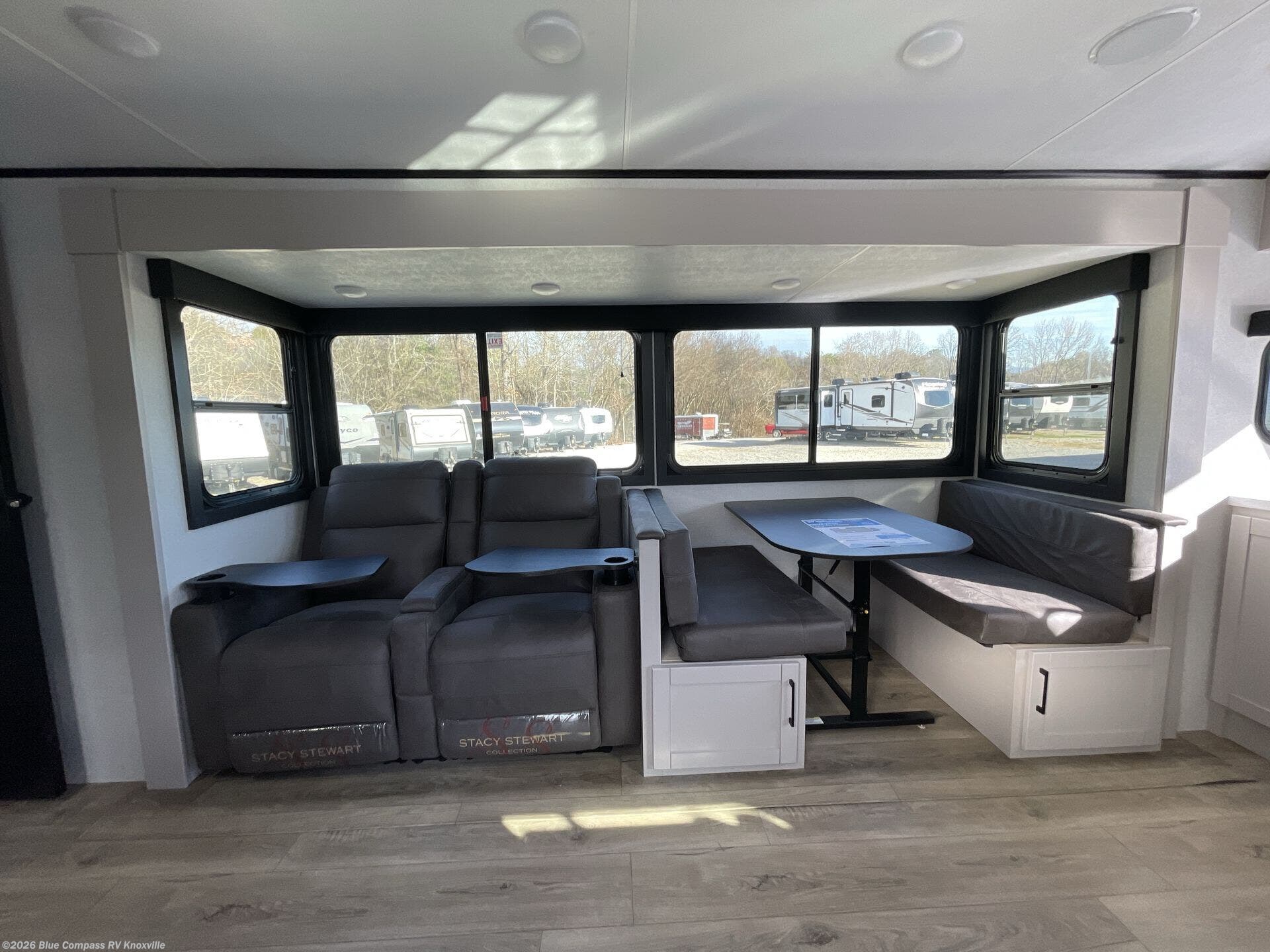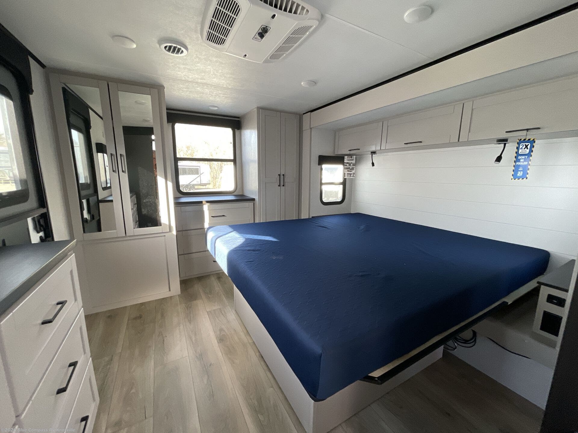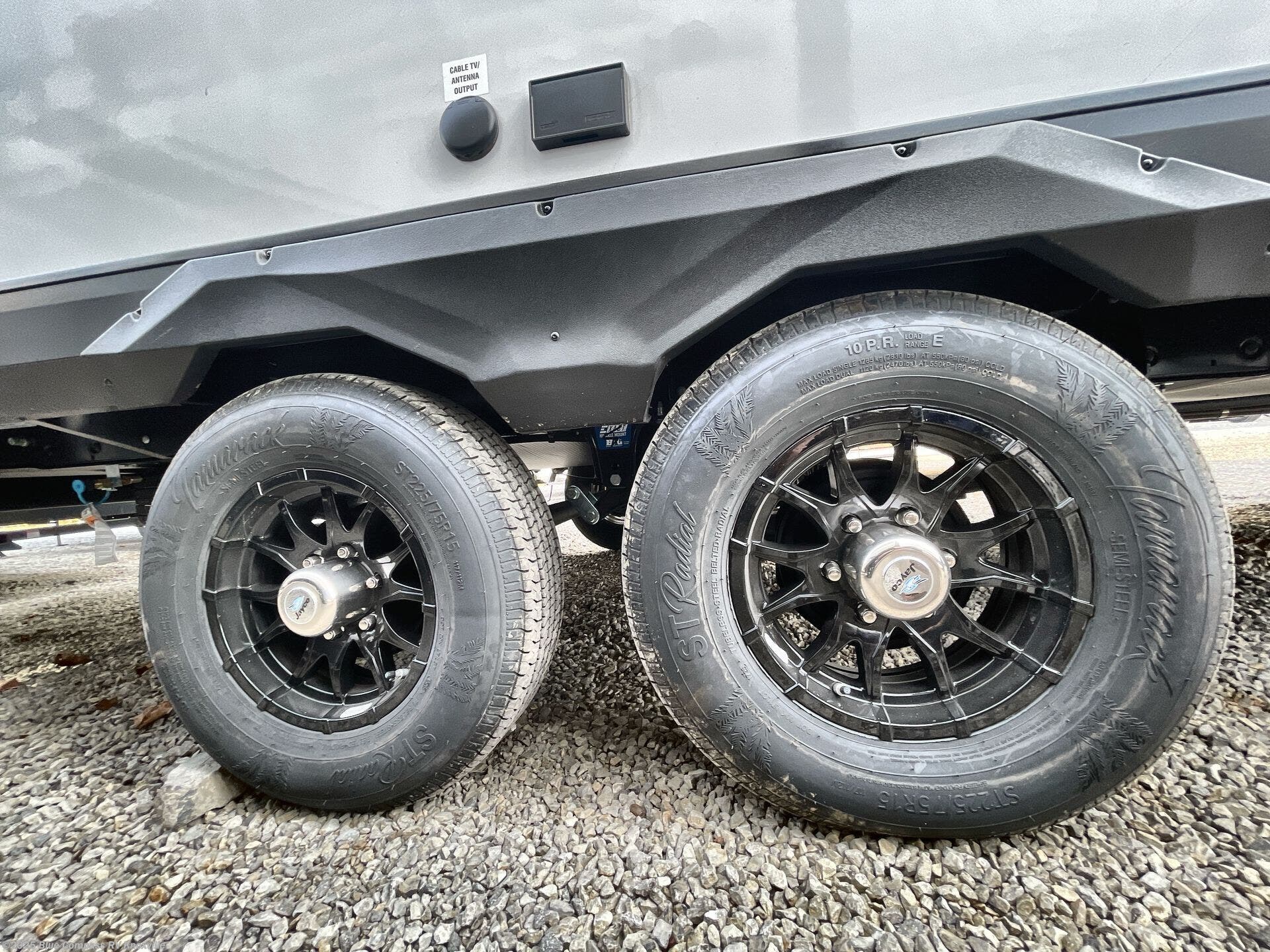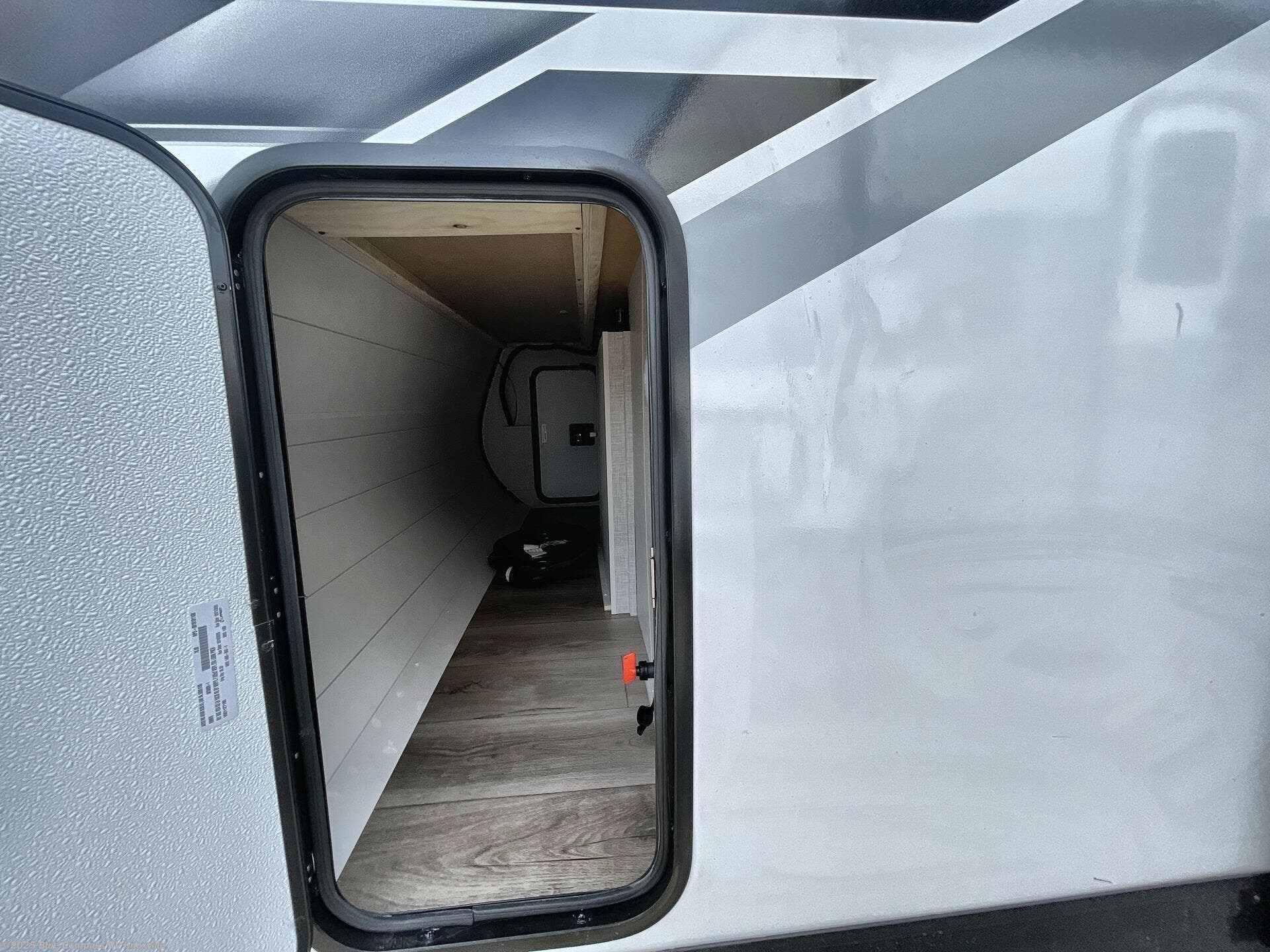 This front kitchen travel trailer will be perfect for camping trips to the lake or woods! The chef will appreciate ample counter space to prep meals plus an 11 cu. ft. 12V refrigerator to store leftovers, the front kitchen also has overhead cabinets and a pantry for storing your snacks and dry goods without worrying about space. Your crew can dine at the booth dinette, then play a game after dinner is cleaned up, this also works as a sleeping space if needed. There is also a theater seat across from the entertainment center with an LED Smart TV to make it a movie night. The bathroom has two entry doors for comfort and easy access along with a radial shower and medicine cabinet. A rear private bedroom is sure to make you feel right at home with a 60" x 80" queen bed, dual wardrobes, and a dresser to keep your things organized. You'll also find one of the dual entry doors here for convenience!