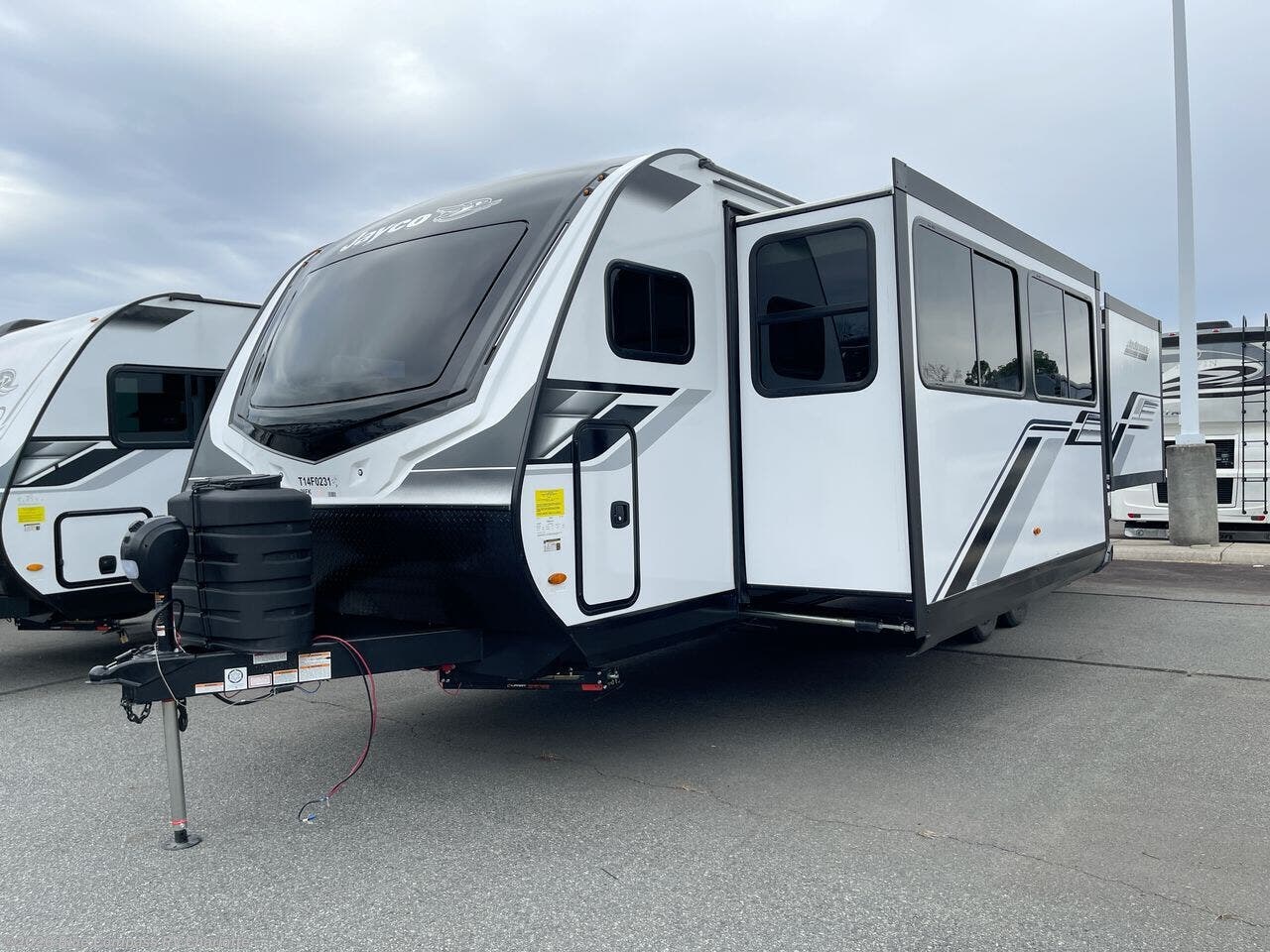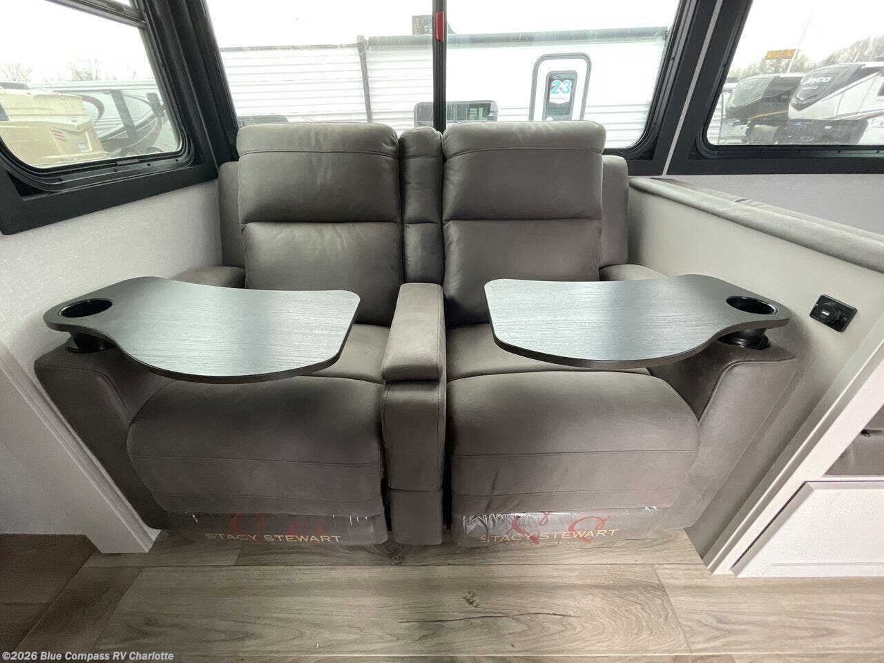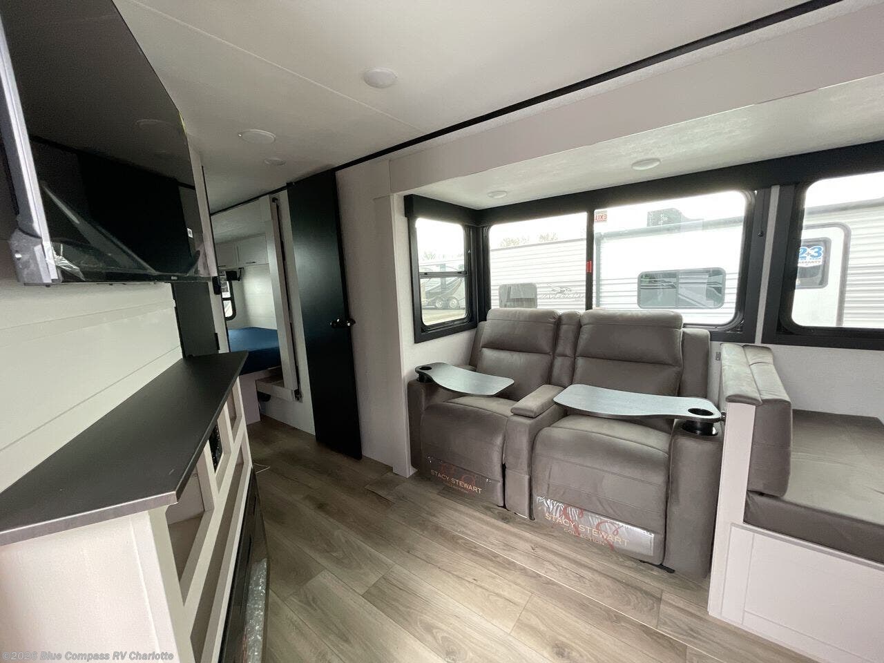 This front kitchen travel trailer will be perfect for camping trips to the lake or woods! The chef will appreciate ample counter space to prep meals plus an 11 cu. ft. 12V refrigerator to store leftovers, the front kitchen also has overhead cabinets and a pantry for storing your snacks and dry goods without worrying about space. Your crew can dine at the booth dinette, then play a game after dinner is cleaned up, this also works as a sleeping space if needed. There is also a theater seat across from the entertainment center with an LED Smart TV to make it a movie night. The bathroom has two entry doors for comfort and easy access along with a radial shower and medicine cabinet. A rear private bedroom is sure to make you feel right at home with a 60" x 80" queen bed, dual wardrobes, and a dresser to keep your things organized. You'll also find one of the dual entry doors here for convenience!