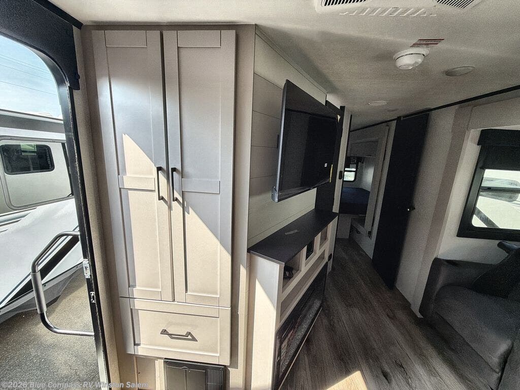 This front kitchen travel trailer will be perfect for camping trips to the lake or woods! The chef will appreciate ample counter space to prep meals plus an 11 cu. ft. 12V refrigerator to store leftovers, the front kitchen also has overhead cabinets and a pantry for storing your snacks and dry goods without worrying about space. Your crew can dine at the booth dinette, then play a game after dinner is cleaned up, this also works as a sleeping space if needed. There is also a theater seat across from the entertainment center with an LED Smart TV to make it a movie night. The bathroom has two entry doors for comfort and easy access along with a radial shower and medicine cabinet. A rear private bedroom is sure to make you feel right at home with a 60" x 80" queen bed, dual wardrobes, and a dresser to keep your things organized. You'll also find one of the dual entry doors here for convenience!