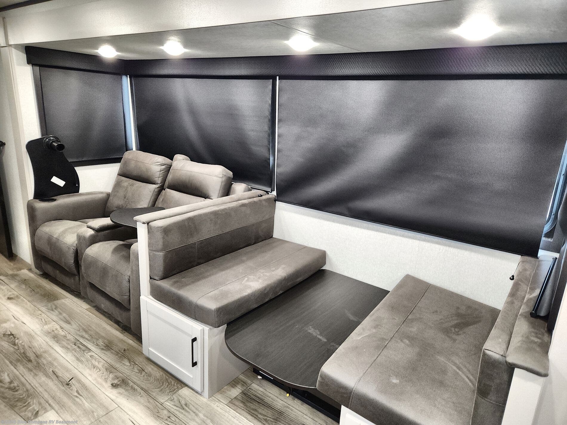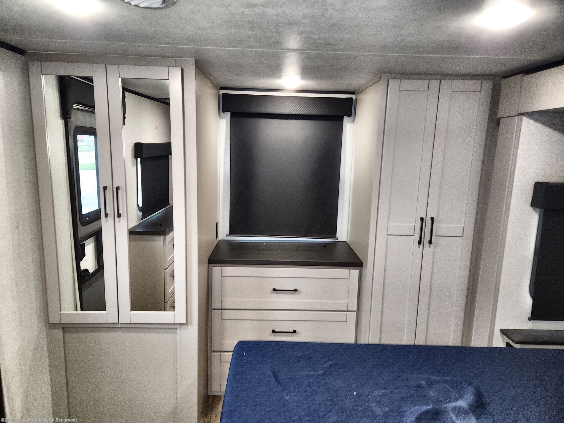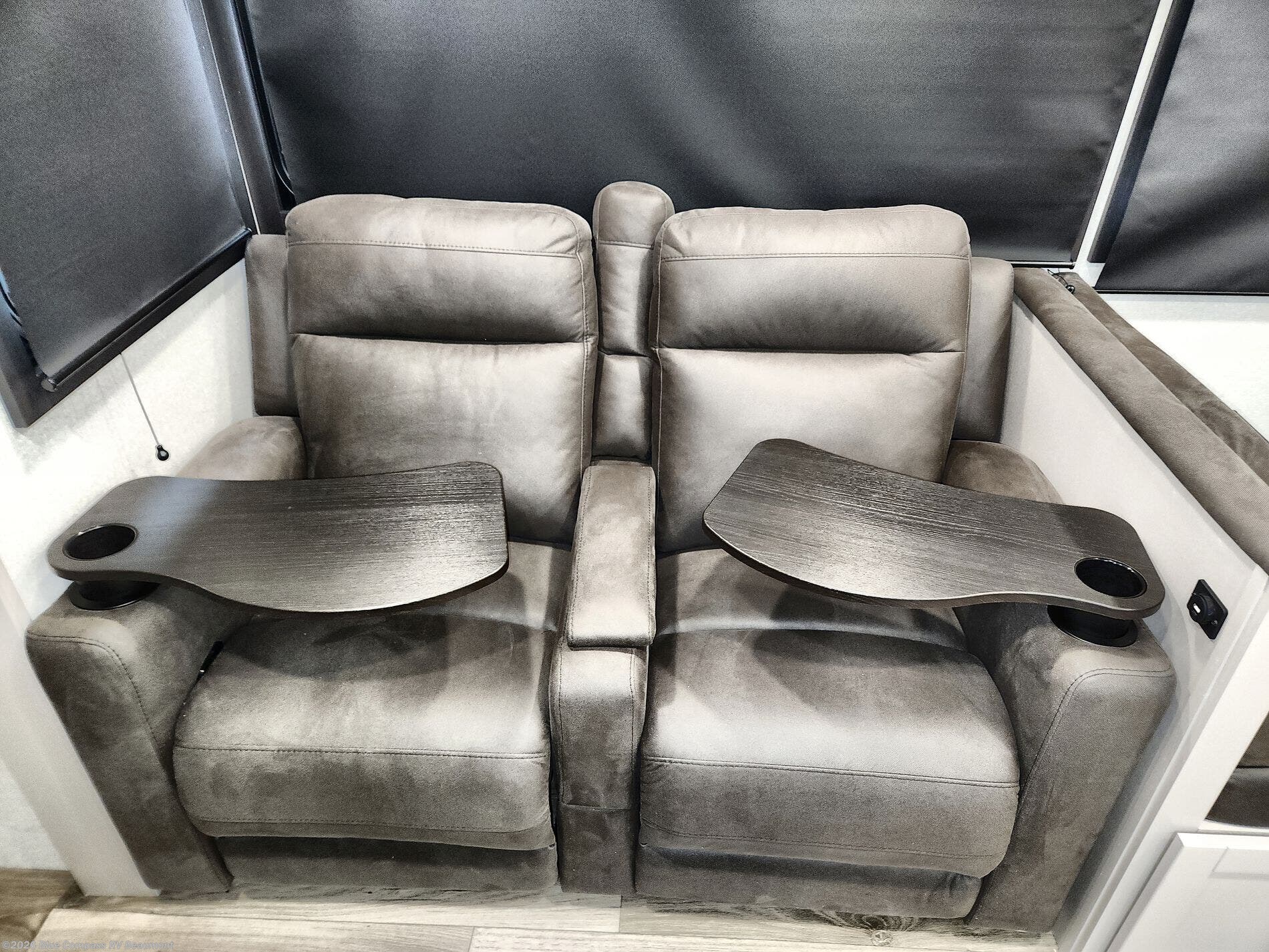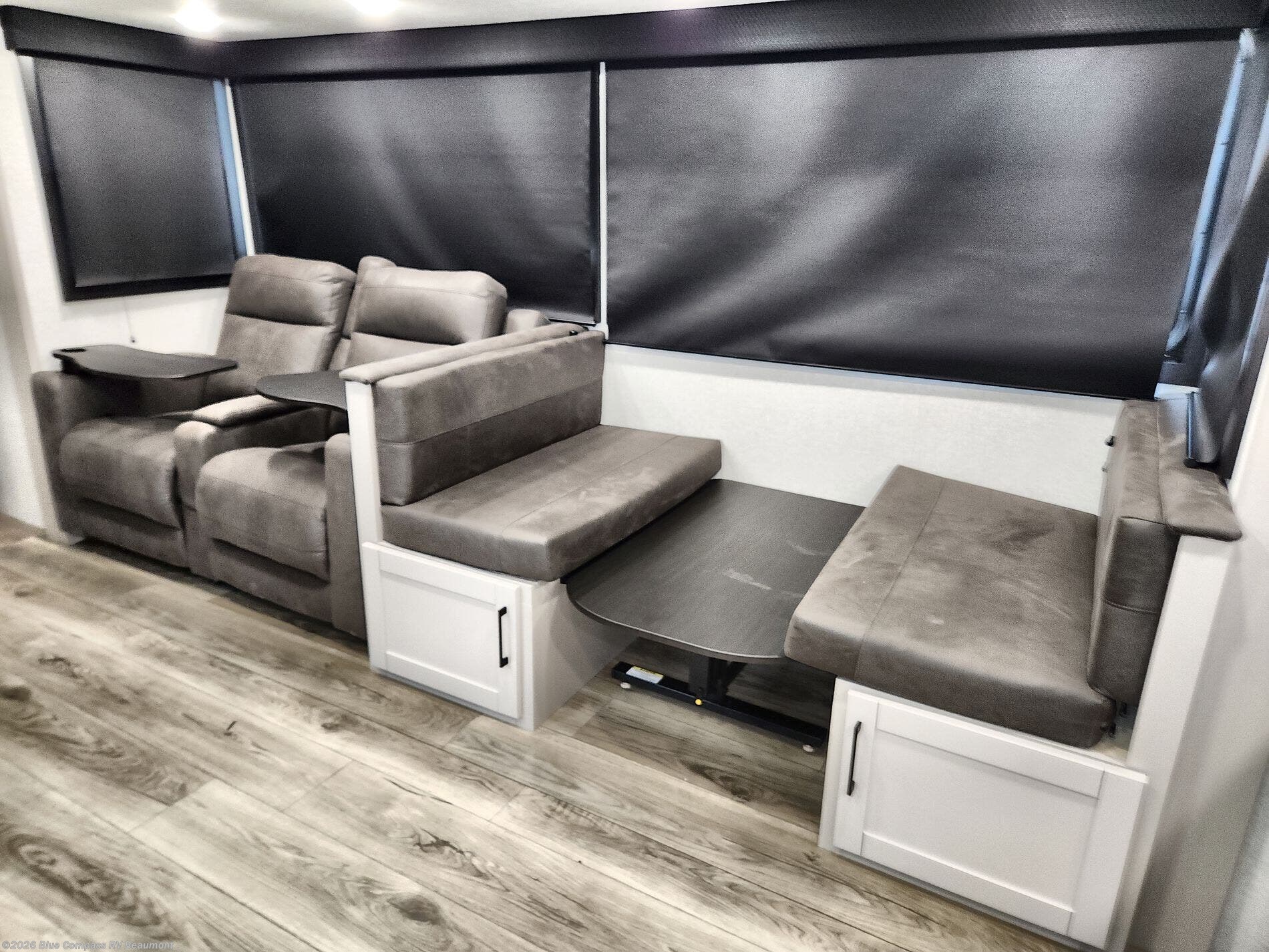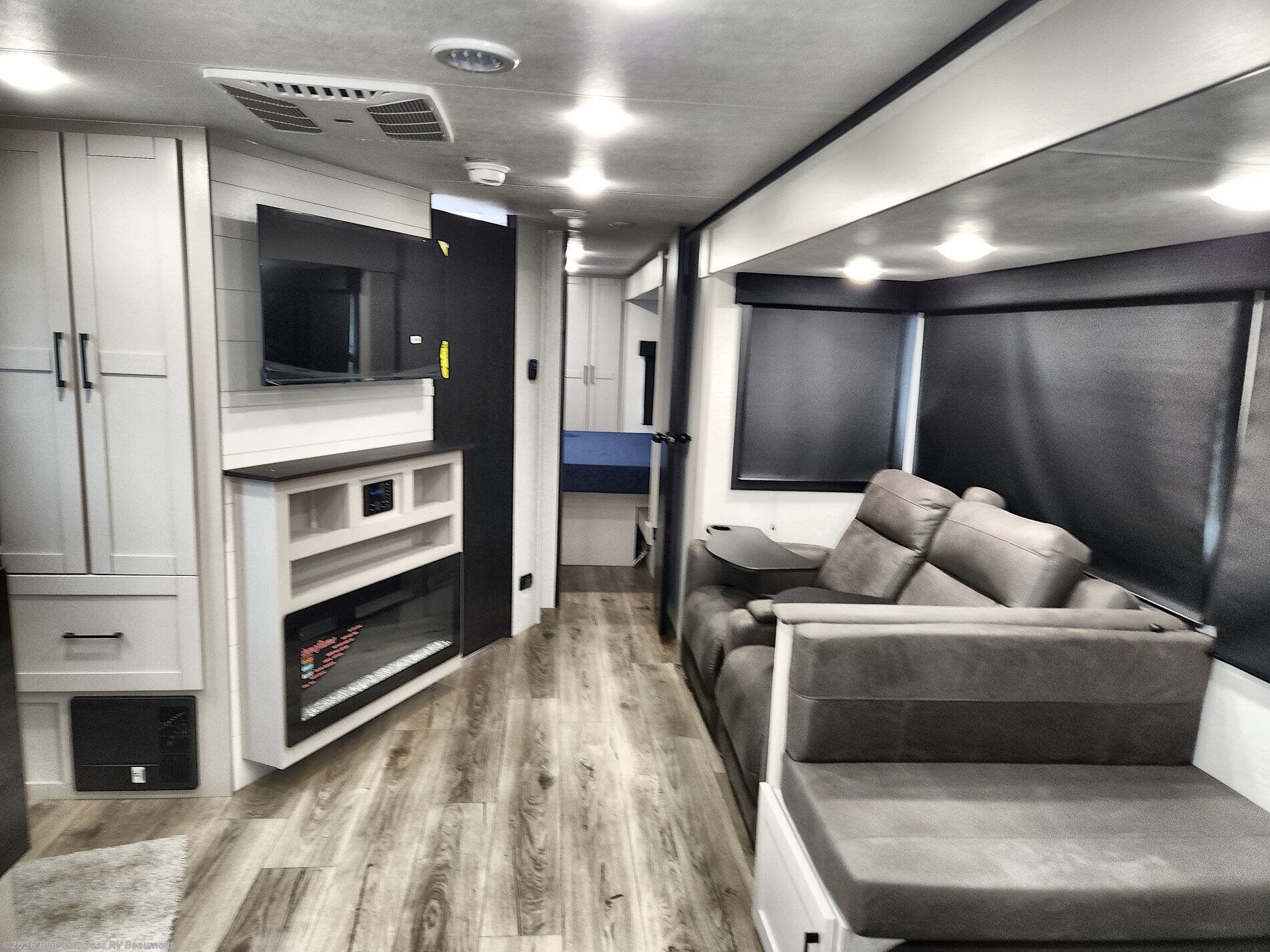 This front kitchen travel trailer will be perfect for camping trips to the lake or woods! The chef will appreciate ample counter space to prep meals plus an 11 cu. ft. 12V refrigerator to store leftovers, the front kitchen also has overhead cabinets and a pantry for storing your snacks and dry goods without worrying about space. Your crew can dine at the booth dinette, then play a game after dinner is cleaned up, this also works as a sleeping space if needed. There is also a theater seat across from the entertainment center with an LED Smart TV to make it a movie night. The bathroom has two entry doors for comfort and easy access along with a radial shower and medicine cabinet. A rear private bedroom is sure to make you feel right at home with a 60" x 80" queen bed, dual wardrobes, and a dresser to keep your things organized. You'll also find one of the dual entry doors here for convenience!