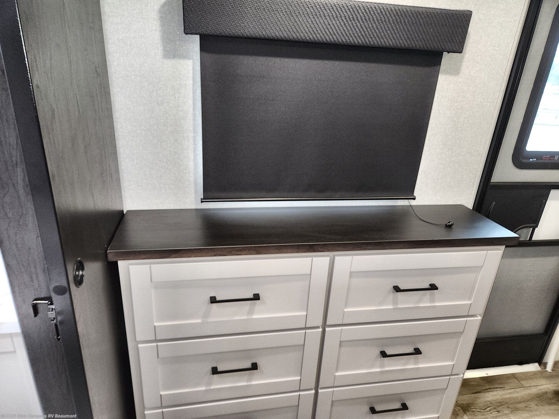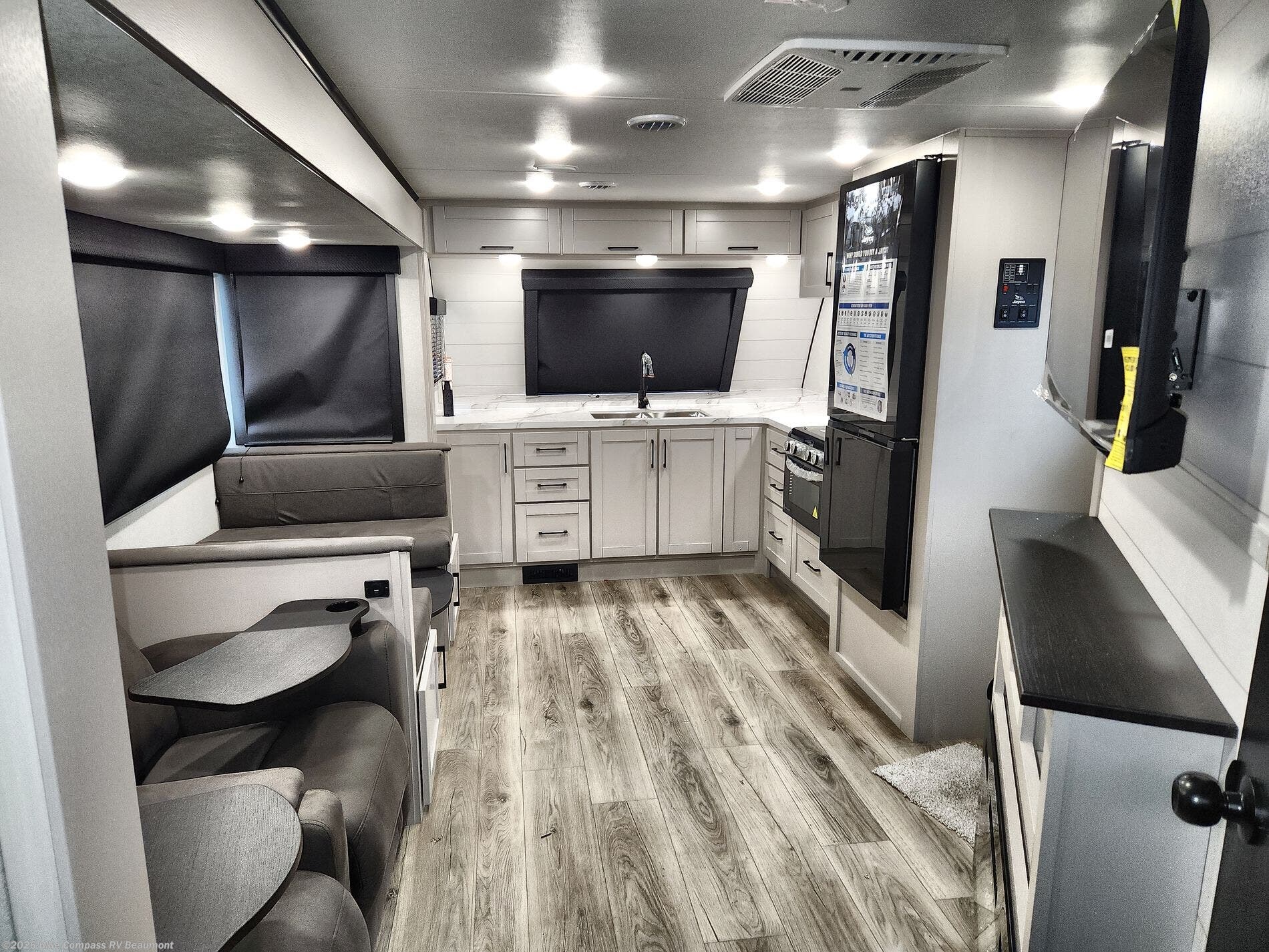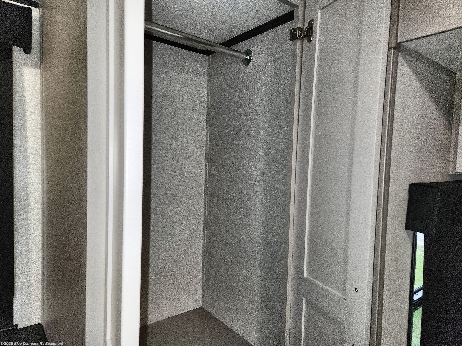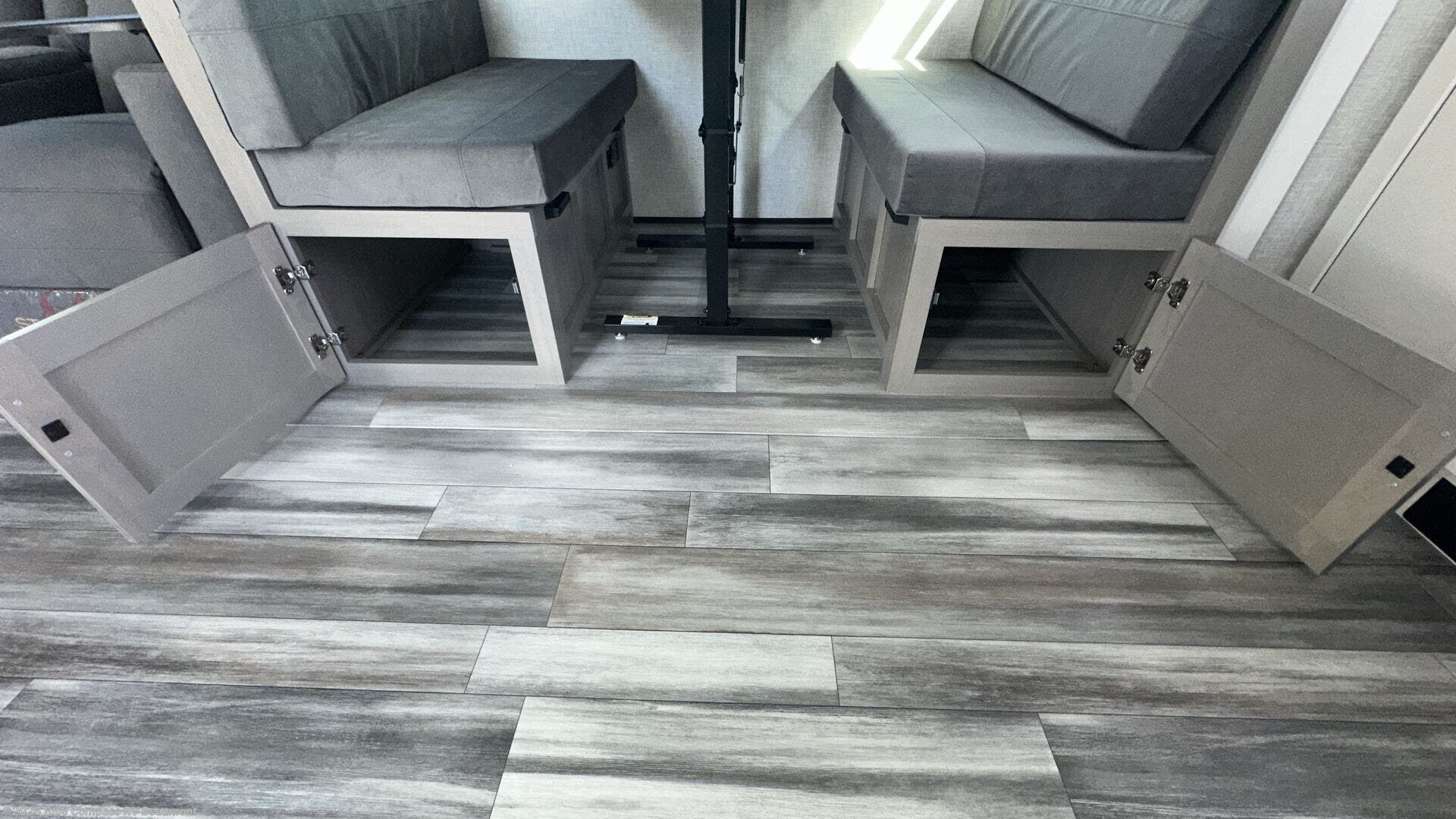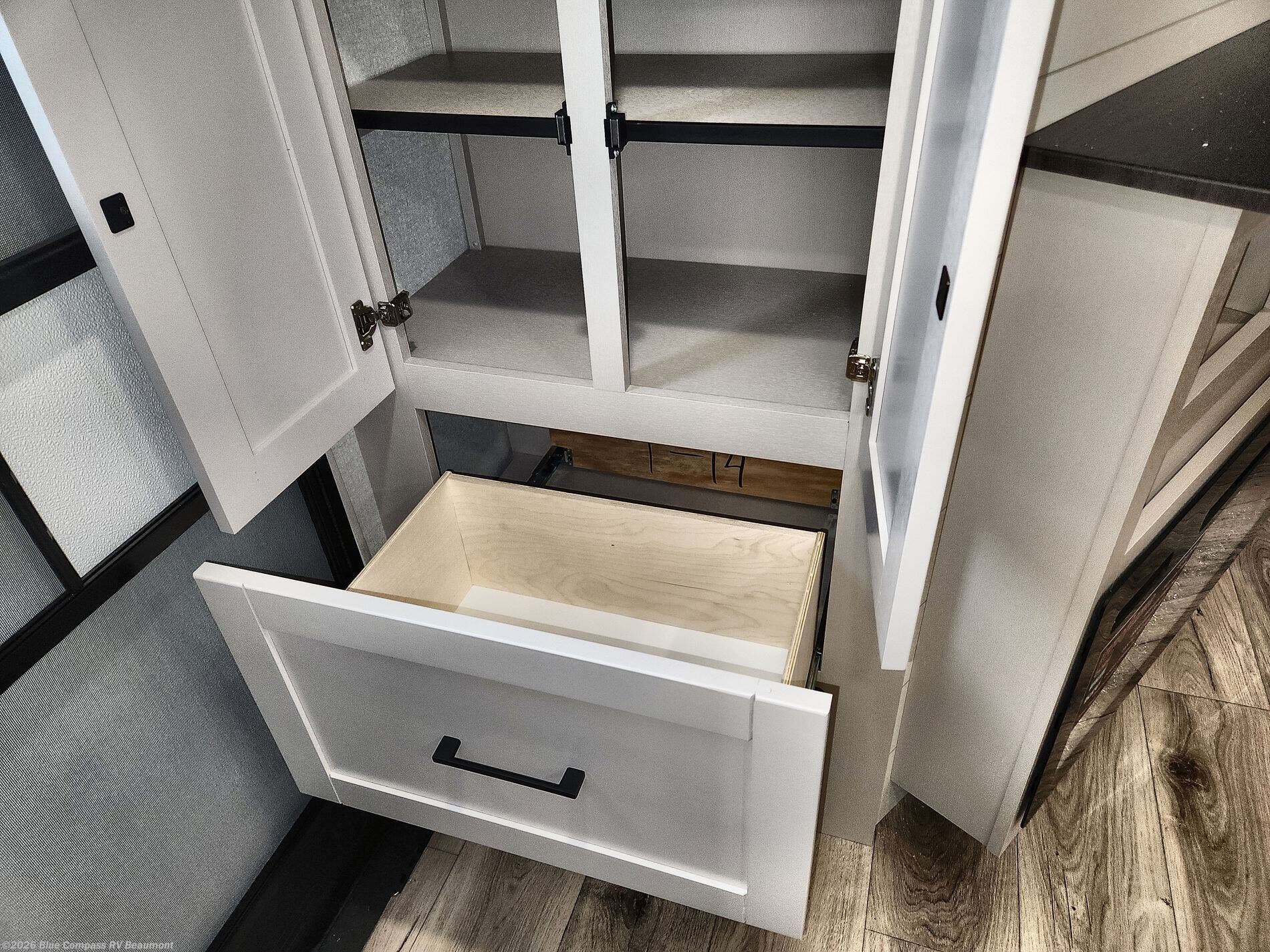 This front kitchen travel trailer will be perfect for camping trips to the lake or woods! The chef will appreciate ample counter space to prep meals plus an 11 cu. ft. 12V refrigerator to store leftovers, the front kitchen also has overhead cabinets and a pantry for storing your snacks and dry goods without worrying about space. Your crew can dine at the booth dinette, then play a game after dinner is cleaned up, this also works as a sleeping space if needed. There is also a theater seat across from the entertainment center with an LED Smart TV to make it a movie night. The bathroom has two entry doors for comfort and easy access along with a radial shower and medicine cabinet. A rear private bedroom is sure to make you feel right at home with a 60" x 80" queen bed, dual wardrobes, and a dresser to keep your things organized. You'll also find one of the dual entry doors here for convenience!
