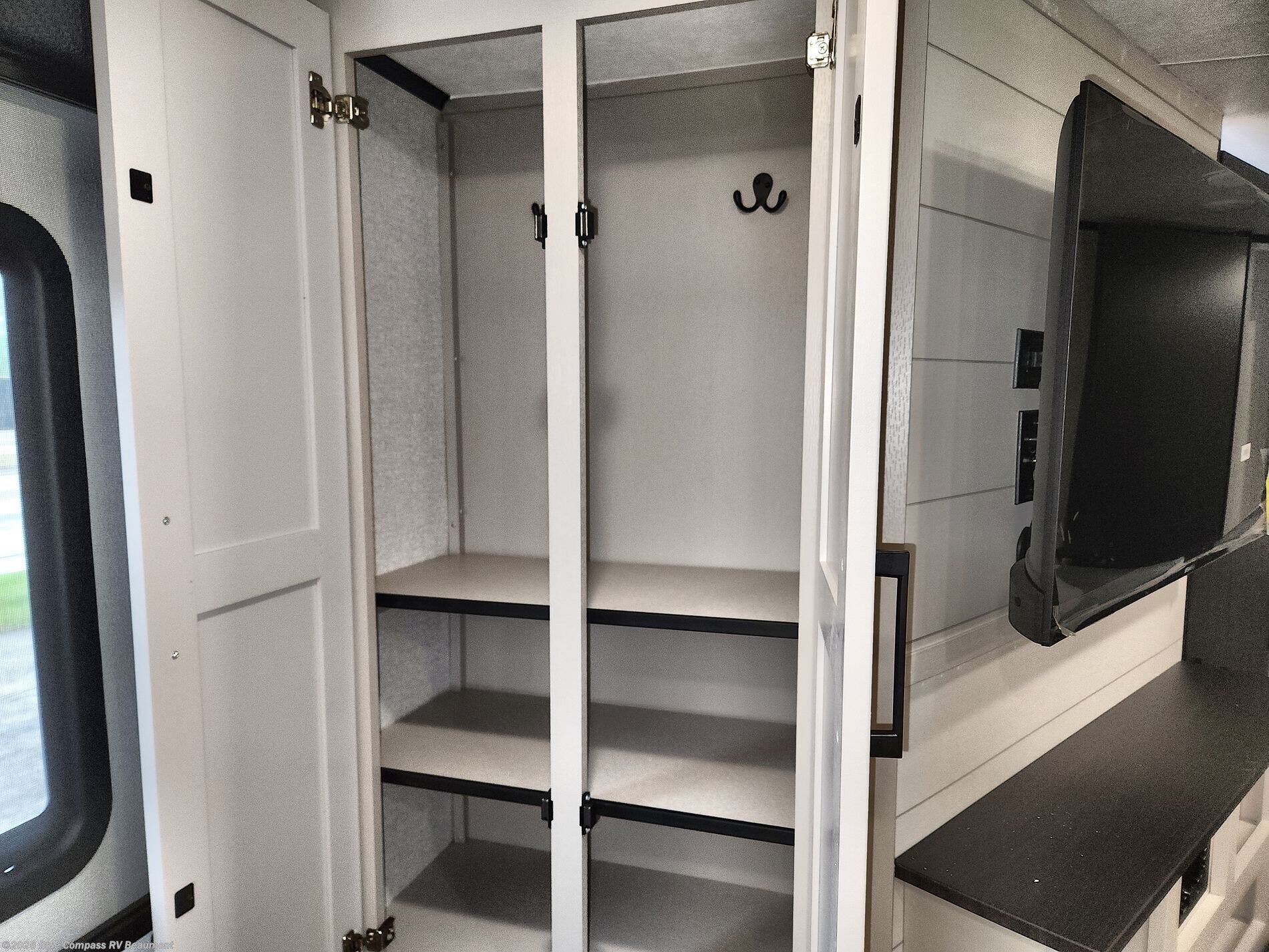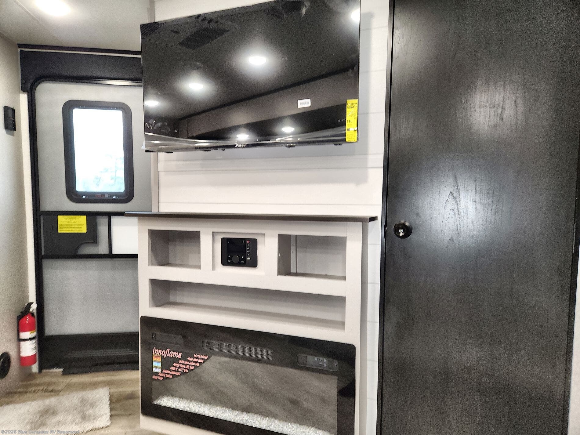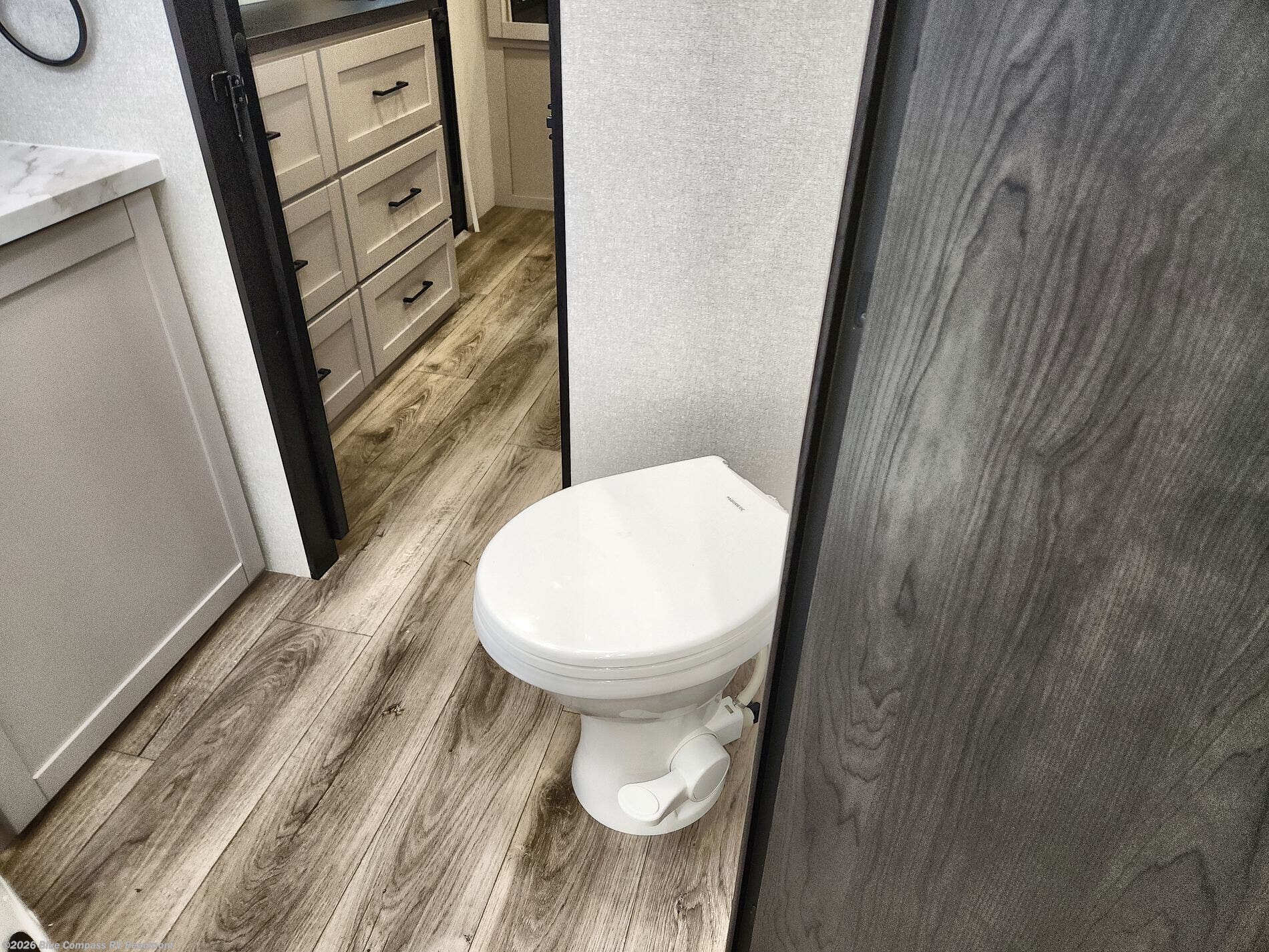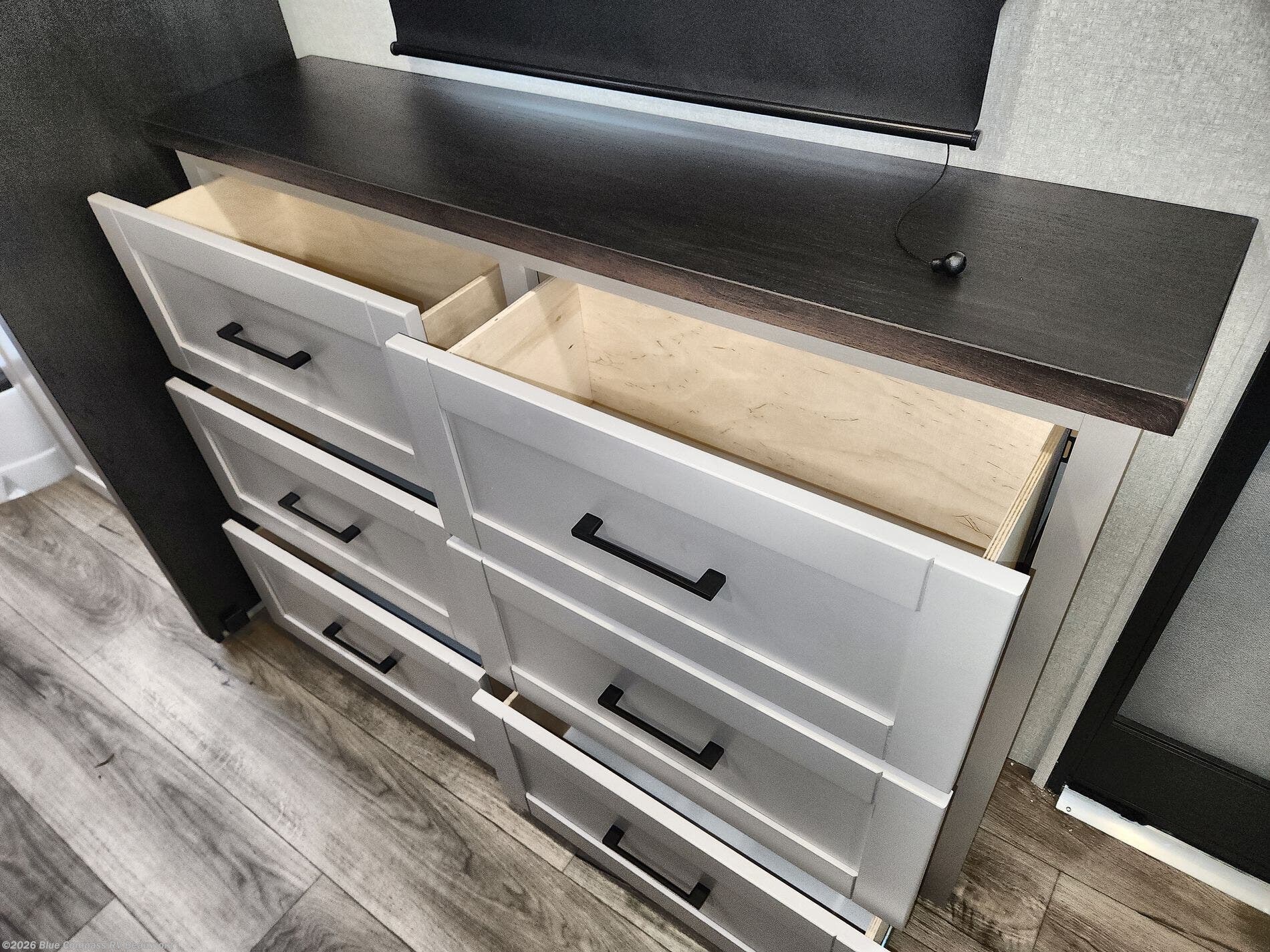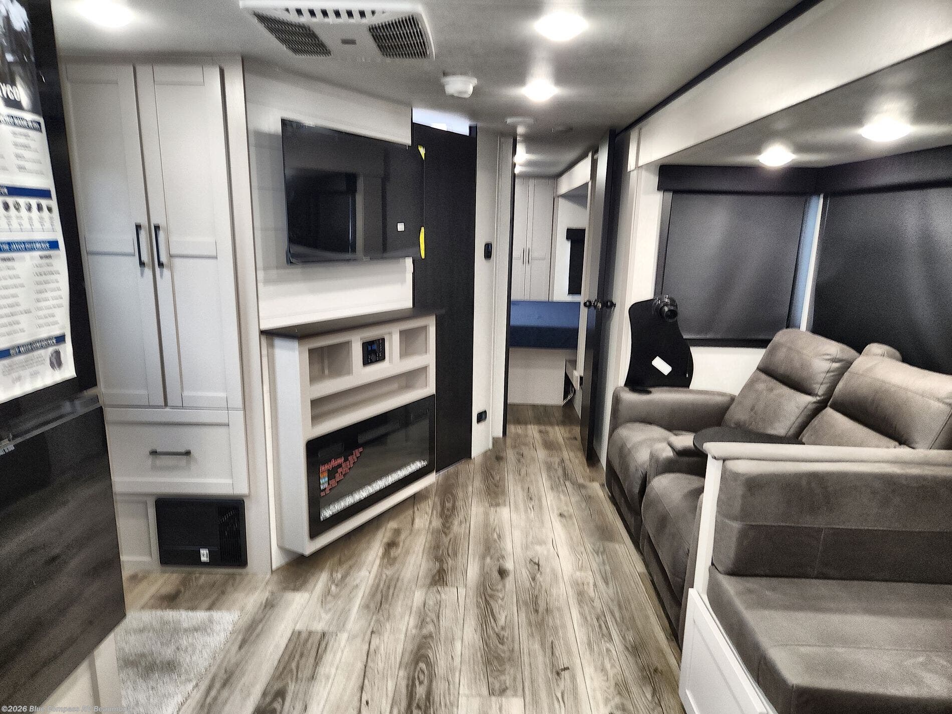 This front kitchen travel trailer will be perfect for camping trips to the lake or woods! The chef will appreciate ample counter space to prep meals plus an 11 cu. ft. 12V refrigerator to store leftovers, the front kitchen also has overhead cabinets and a pantry for storing your snacks and dry goods without worrying about space. Your crew can dine at the booth dinette, then play a game after dinner is cleaned up, this also works as a sleeping space if needed. There is also a theater seat across from the entertainment center with an LED Smart TV to make it a movie night. The bathroom has two entry doors for comfort and easy access along with a radial shower and medicine cabinet. A rear private bedroom is sure to make you feel right at home with a 60" x 80" queen bed, dual wardrobes, and a dresser to keep your things organized. You'll also find one of the dual entry doors here for convenience!