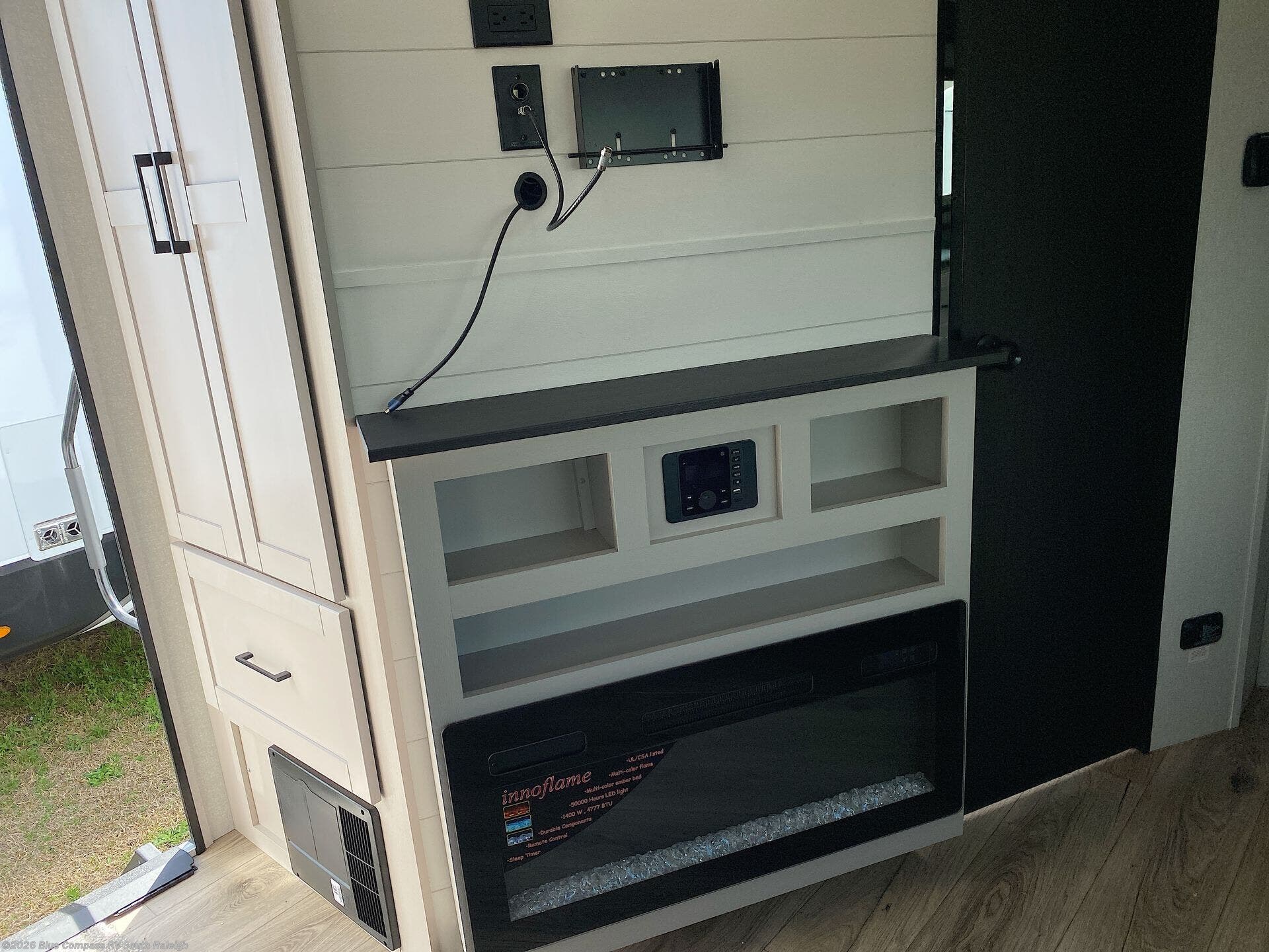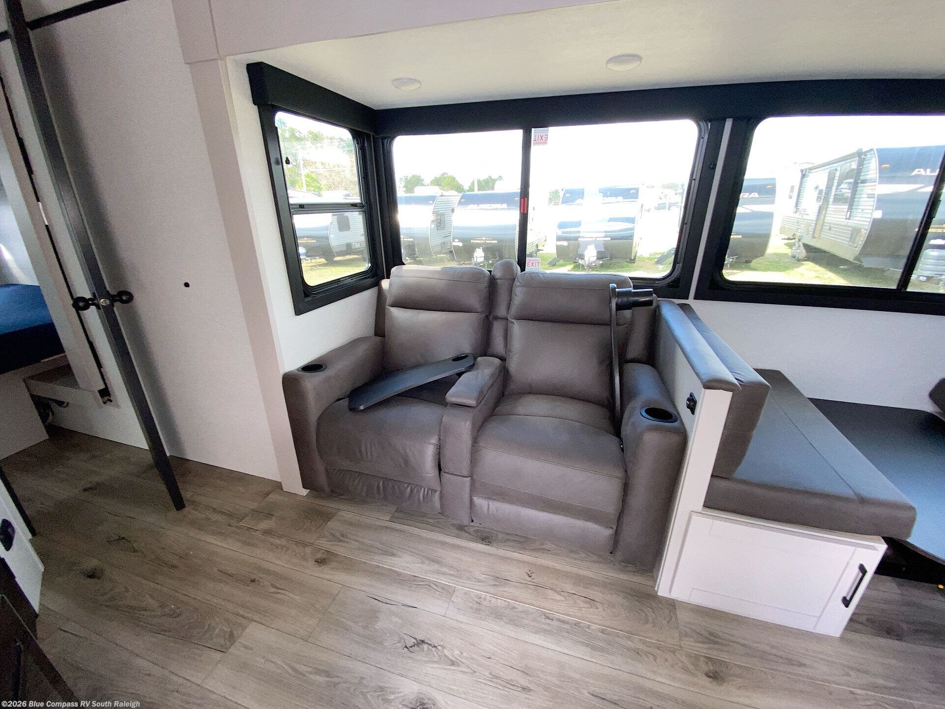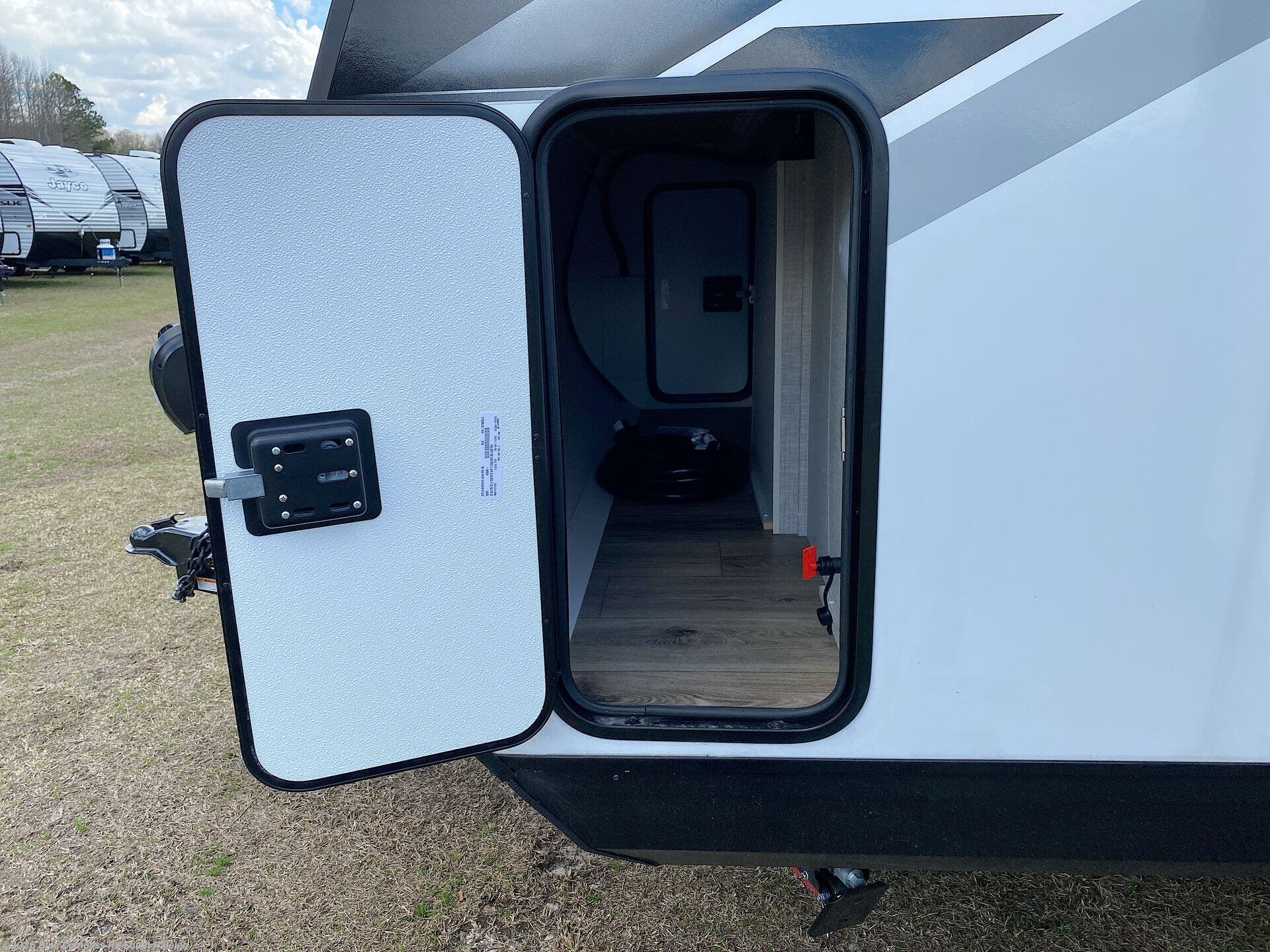 This front kitchen travel trailer will be perfect for camping trips to the lake or woods! The chef will appreciate ample counter space to prep meals plus an 11 cu. ft. 12V refrigerator to store leftovers, the front kitchen also has overhead cabinets and a pantry for storing your snacks and dry goods without worrying about space. Your crew can dine at the booth dinette, then play a game after dinner is cleaned up, this also works as a sleeping space if needed. There is also a theater seat across from the entertainment center with an LED Smart TV to make it a movie night. The bathroom has two entry doors for comfort and easy access along with a radial shower and medicine cabinet. A rear private bedroom is sure to make you feel right at home with a 60" x 80" queen bed, dual wardrobes, and a dresser to keep your things organized. You'll also find one of the dual entry doors here for convenience!