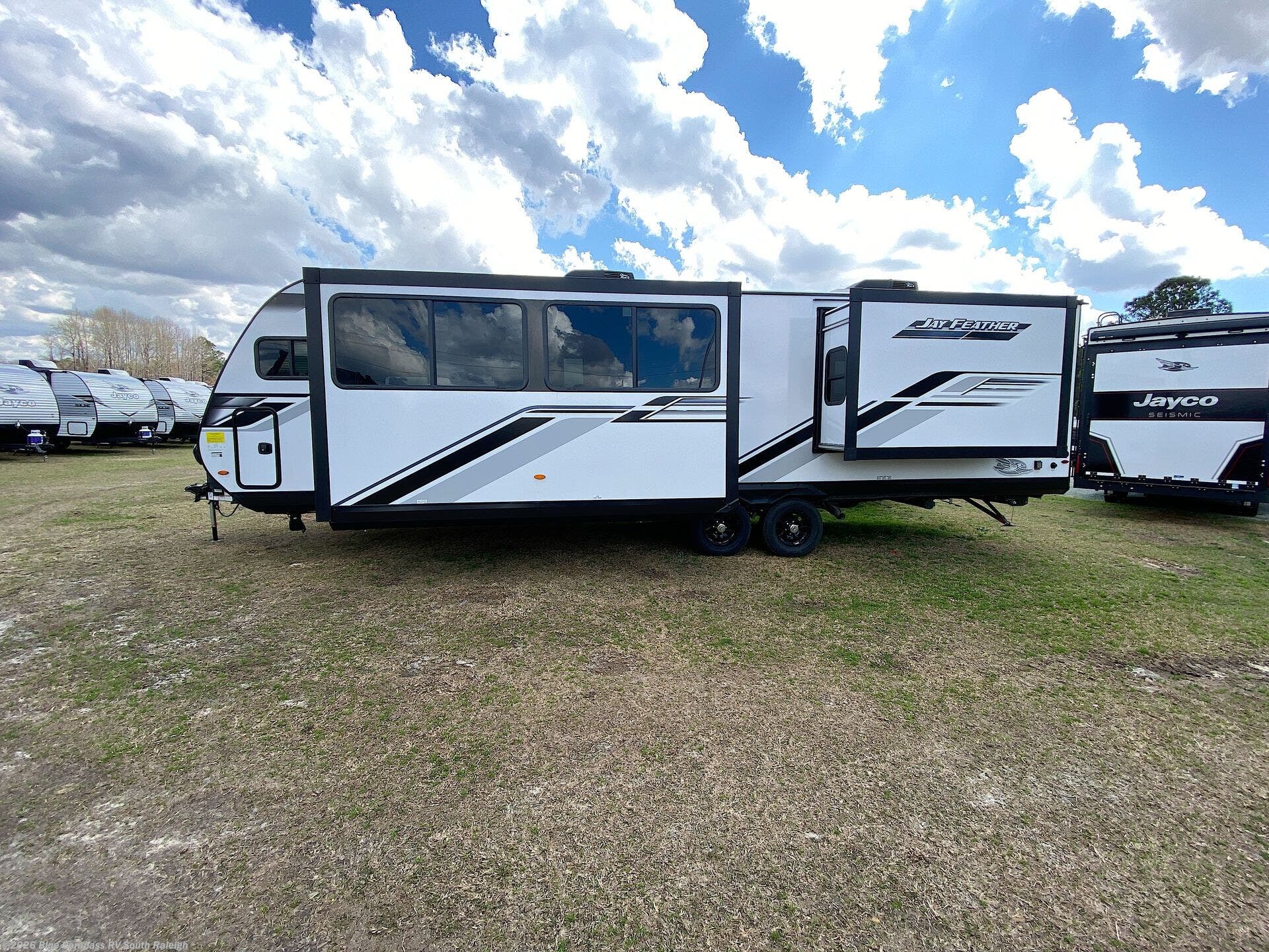 With any Jay Feather travel trailer by Jayco, you will enjoy lightweight towing, convenient exterior amenities, and at-home comforts inside! The Overlander 1 Solar Package included within the Jay Sport Package comes with a 200W solar panel and a 30-amp digital controller so you can enjoy some off-grid camping. There is also a modern graphics package, Solid fold-down step with aluminum tread steps on the main entry doorstep, and Climate Shield 0 -100° F tested weather insulation package that will allow you to camp in various types of climates. The Customer Value Package will make time outdoors easier than ever with a power tongue jack and Automotive-style aluminum rims, plus radial tires with self-adjusting electric brakes. More exterior features include a Keyed-Alike doors, a Magnum Truss roof system, and the list goes on! And we haven't even touched on the interior comforts, like the seamless countertops and Residential vinyl flooring throughout, decorative kitchen backsplash, handcrafted hardwood door/drawer fronts, and multiple USB charging ports to keep you going!