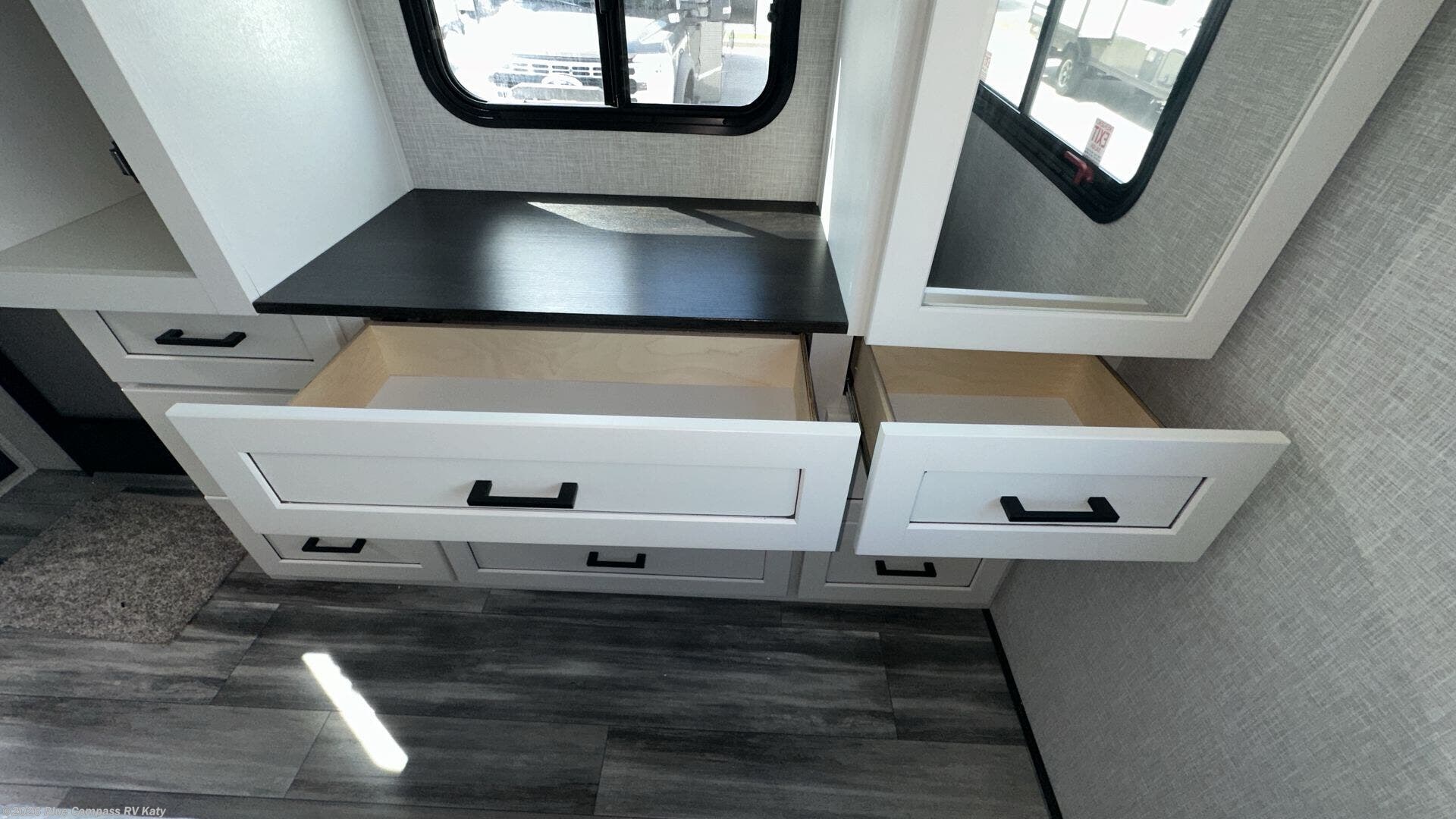 This front kitchen travel trailer will be perfect for camping trips to the lake or woods! The chef will appreciate ample counter space to prep meals plus an 11 cu. ft. 12V refrigerator to store leftovers, the front kitchen also has overhead cabinets and a pantry for storing your snacks and dry goods without worrying about space. Your crew can dine at the booth dinette, then play a game after dinner is cleaned up, this also works as a sleeping space if needed. There is also a theater seat across from the entertainment center with an LED Smart TV to make it a movie night. The bathroom has two entry doors for comfort and easy access along with a radial shower and medicine cabinet. A rear private bedroom is sure to make you feel right at home with a 60" x 80" queen bed, dual wardrobes, and a dresser to keep your things organized. You'll also find one of the dual entry doors here for convenience!