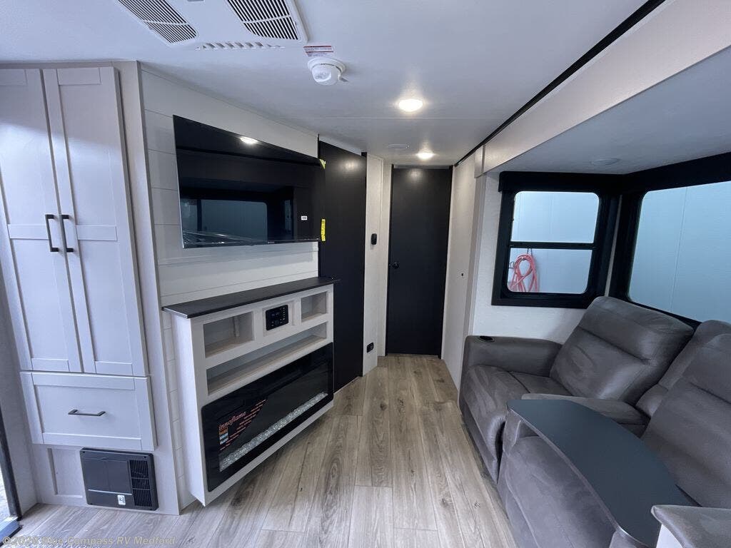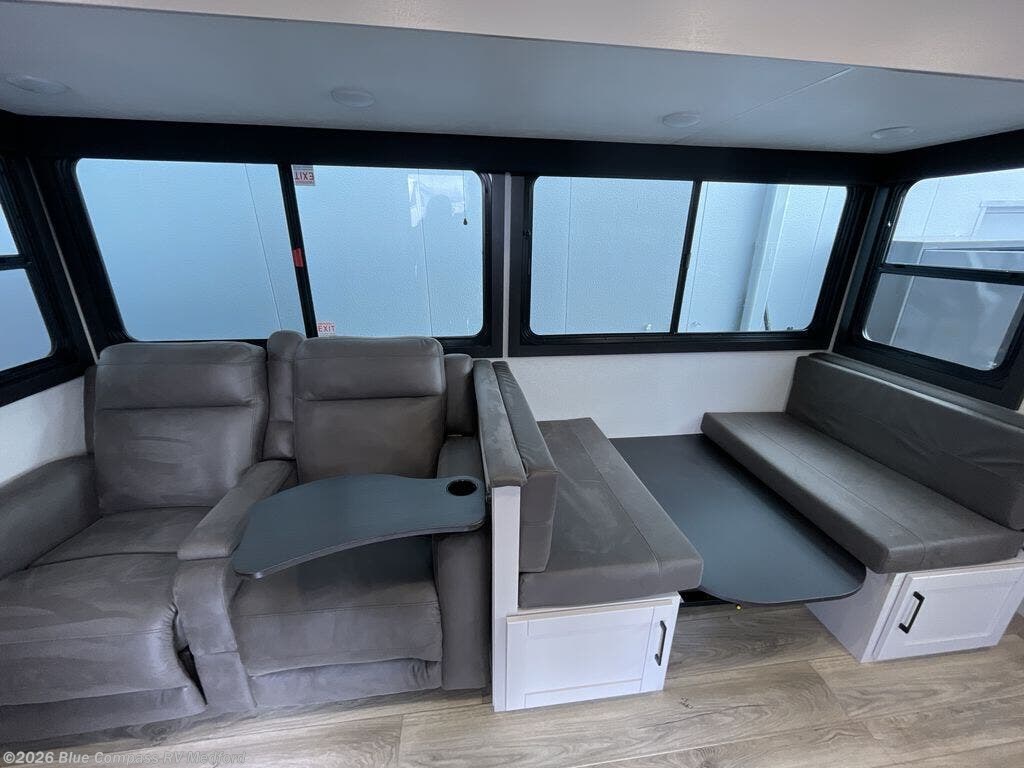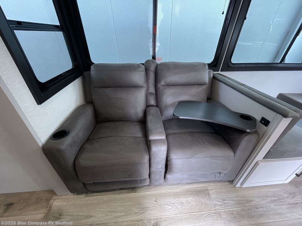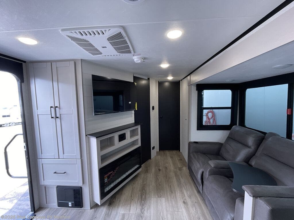 This front kitchen travel trailer will be perfect for camping trips to the lake or woods! The chef will appreciate ample counter space to prep meals plus an 11 cu. ft. 12V refrigerator to store leftovers, the front kitchen also has overhead cabinets and a pantry for storing your snacks and dry goods without worrying about space. Your crew can dine at the booth dinette, then play a game after dinner is cleaned up, this also works as a sleeping space if needed. There is also a theater seat across from the entertainment center with an LED Smart TV to make it a movie night. The bathroom has two entry doors for comfort and easy access along with a radial shower and medicine cabinet. A rear private bedroom is sure to make you feel right at home with a 60" x 80" queen bed, dual wardrobes, and a dresser to keep your things organized. You'll also find one of the dual entry doors here for convenience!
