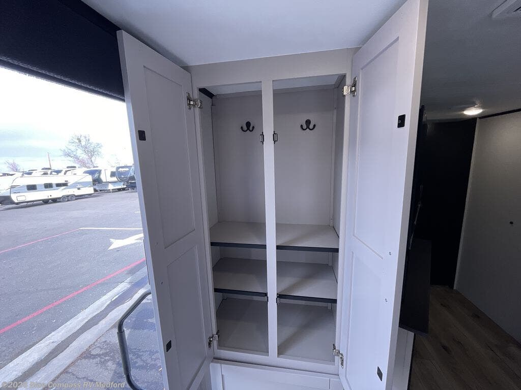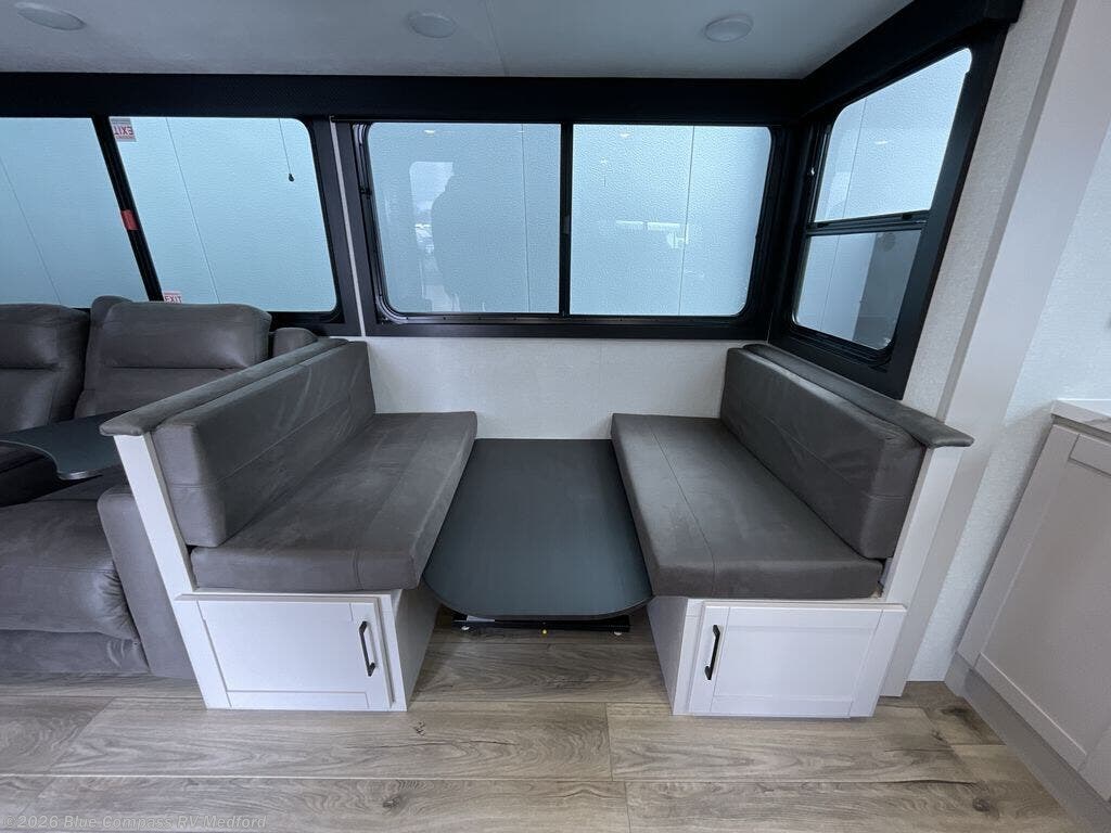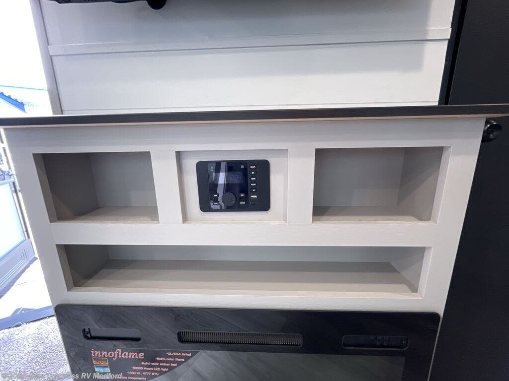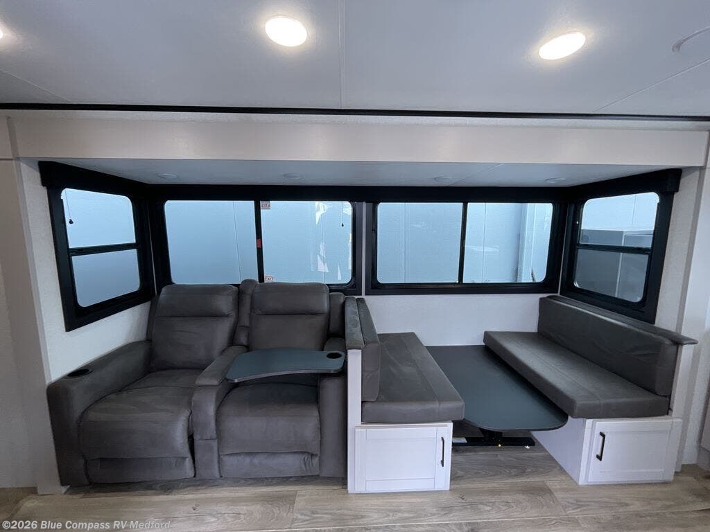 This front kitchen travel trailer will be perfect for camping trips to the lake or woods! The chef will appreciate ample counter space to prep meals plus an 11 cu. ft. 12V refrigerator to store leftovers, the front kitchen also has overhead cabinets and a pantry for storing your snacks and dry goods without worrying about space. Your crew can dine at the booth dinette, then play a game after dinner is cleaned up, this also works as a sleeping space if needed. There is also a theater seat across from the entertainment center with an LED Smart TV to make it a movie night. The bathroom has two entry doors for comfort and easy access along with a radial shower and medicine cabinet. A rear private bedroom is sure to make you feel right at home with a 60" x 80" queen bed, dual wardrobes, and a dresser to keep your things organized. You'll also find one of the dual entry doors here for convenience!