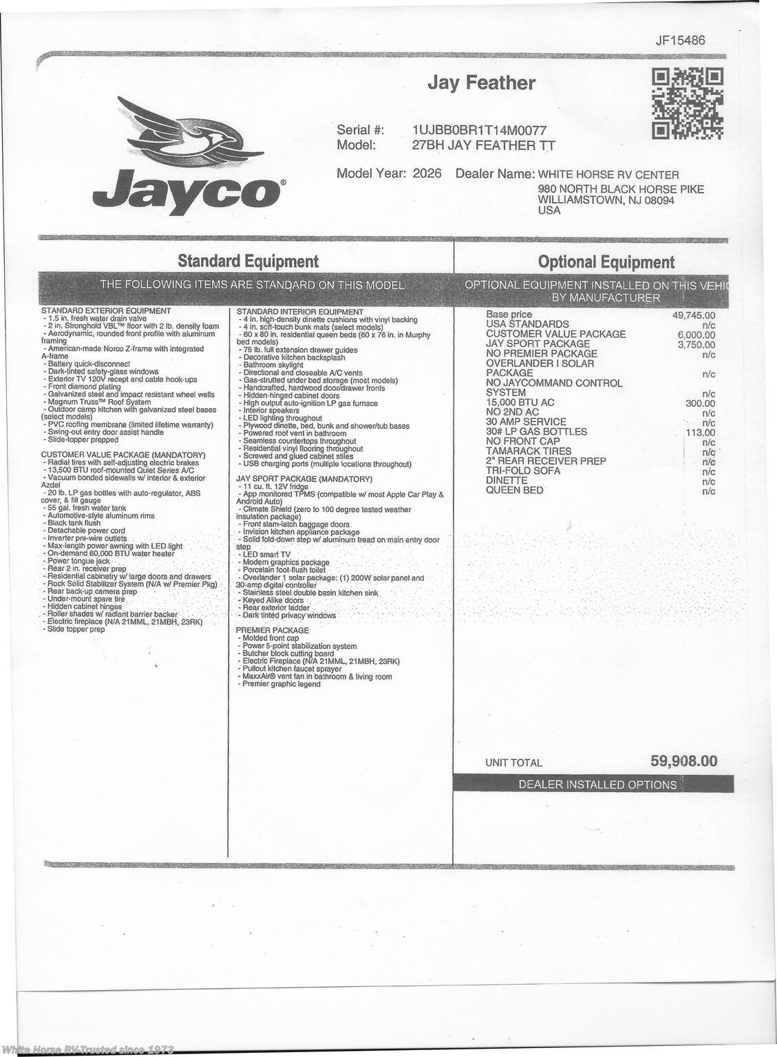 This incoming Stock #JF15486 also has the following factory options included: upgraded 15,000 BTU Air Conditioning & 30lb. LP Tanks... all backed by Jayco’s 2+3 year warranty! MSRP $59,908.