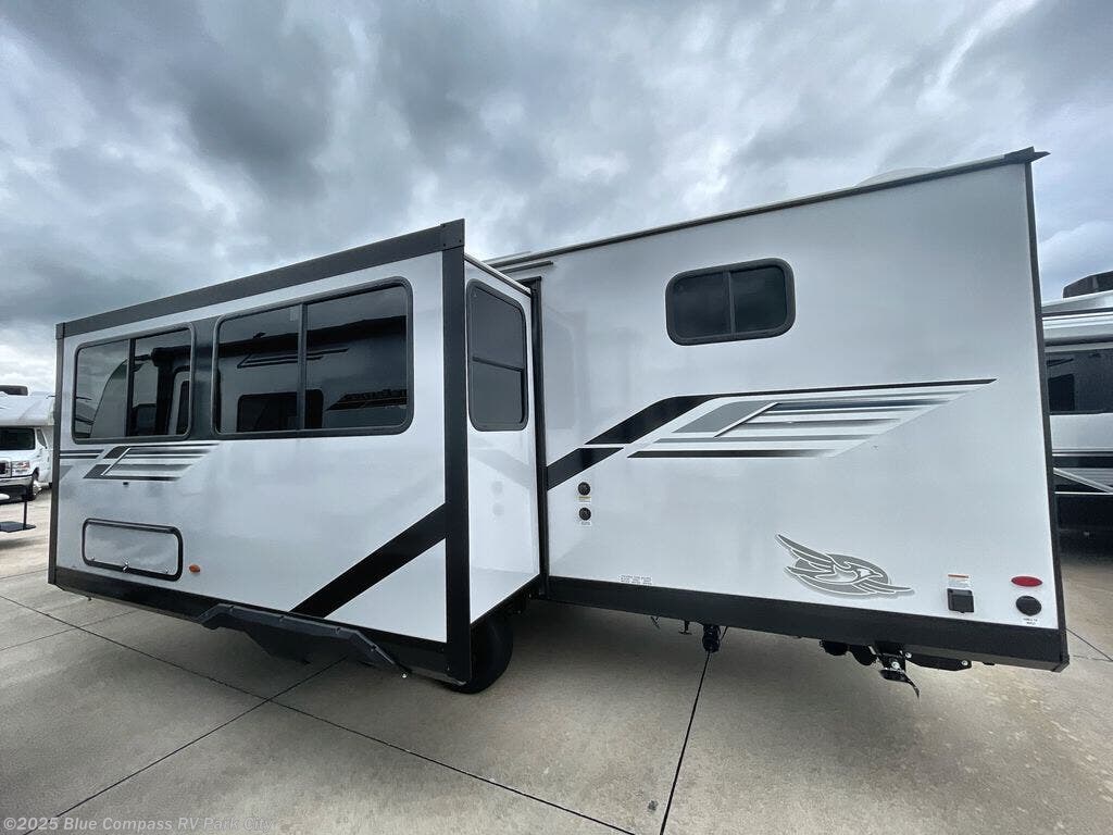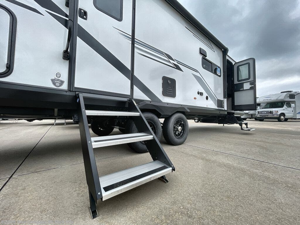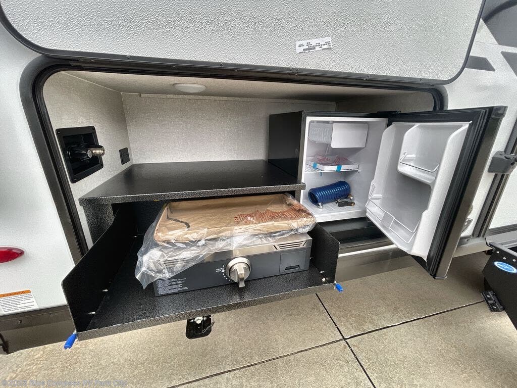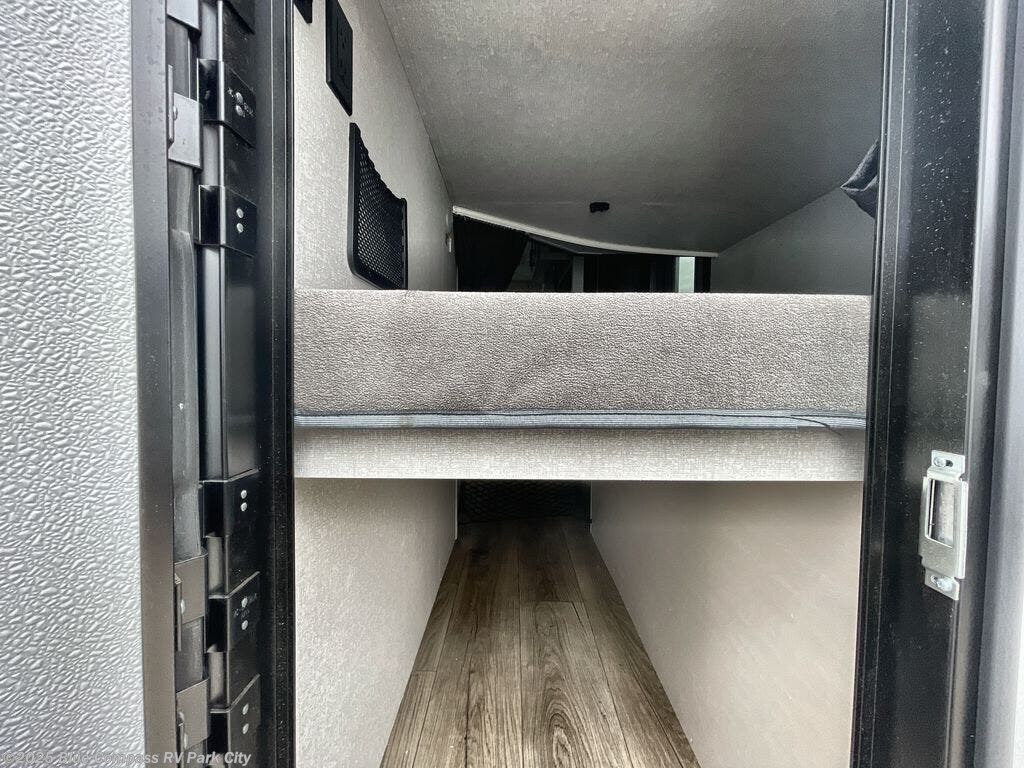 Get out and experience new campgrounds with this spacious trailer that offers a slide out tri-fold sofa and U-shaped dinette giving you dining, relaxing and sleeping space as well as more interior floor space to move from the front to the back. There is even an entertainment center here and an optional fireplace to make it more cozy. The cook will love the choice of making meals inside with full amenities or on the outside kitchen when relaxing under the 21' power awning with LED lights. You will appreciate your own space in the front private bedroom with a queen bed, dual wardrobes and nightstands, plus one of the dual entry doors. This model also includes double-size bunks with flip-up storage and a kayak door to easily pack in camp gear!
