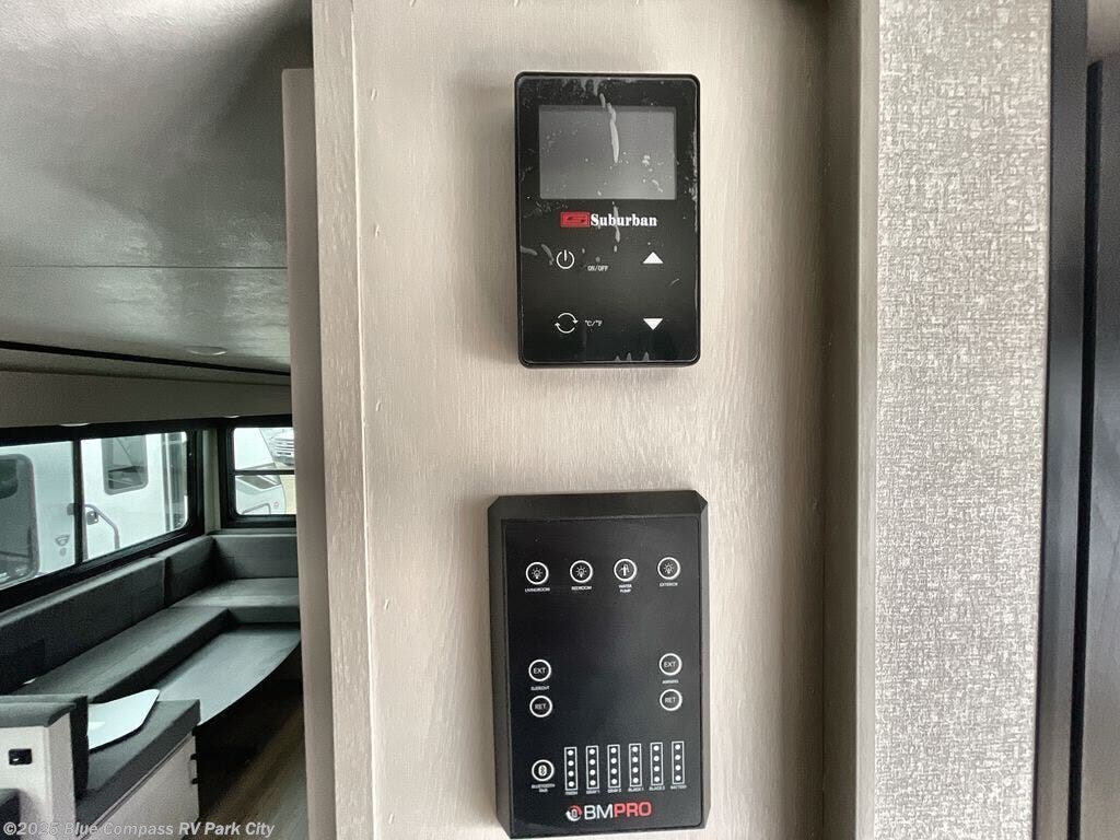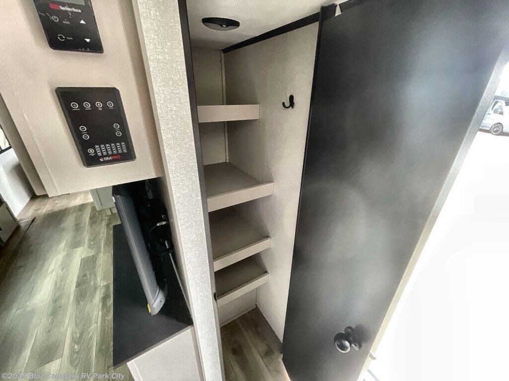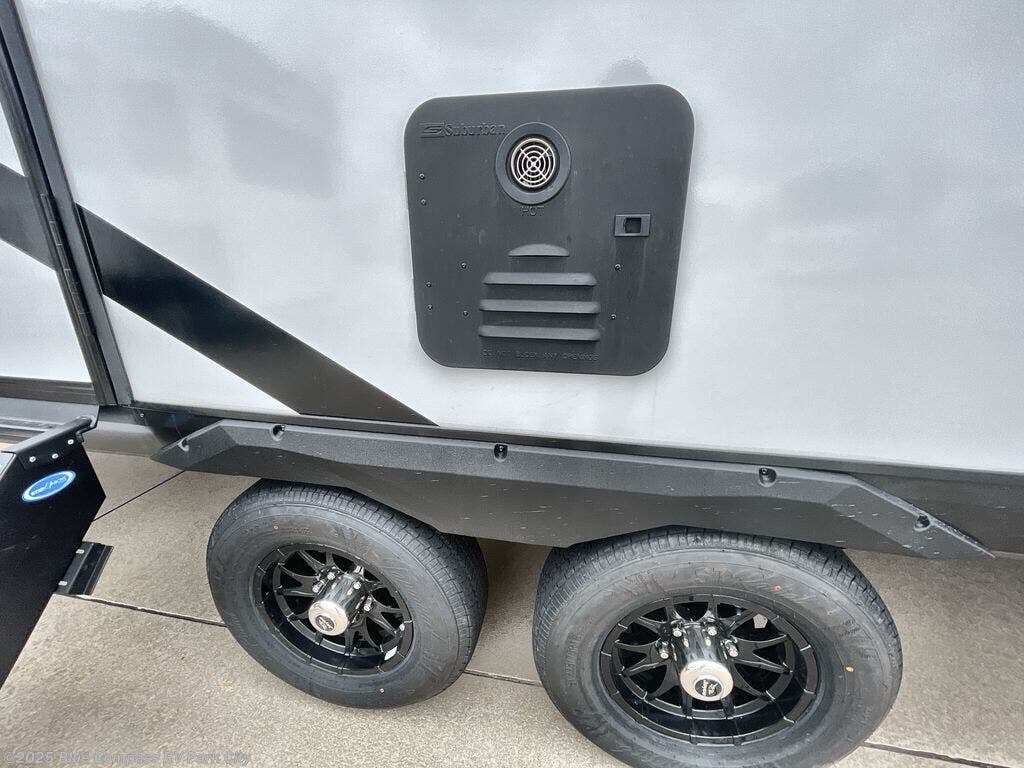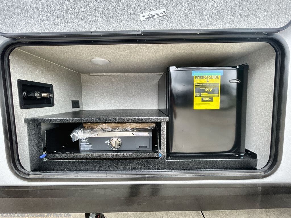 Get out and experience new campgrounds with this spacious trailer that offers a slide out tri-fold sofa and U-shaped dinette giving you dining, relaxing and sleeping space as well as more interior floor space to move from the front to the back. There is even an entertainment center here and an optional fireplace to make it more cozy. The cook will love the choice of making meals inside with full amenities or on the outside kitchen when relaxing under the 21' power awning with LED lights. You will appreciate your own space in the front private bedroom with a queen bed, dual wardrobes and nightstands, plus one of the dual entry doors. This model also includes double-size bunks with flip-up storage and a kayak door to easily pack in camp gear!