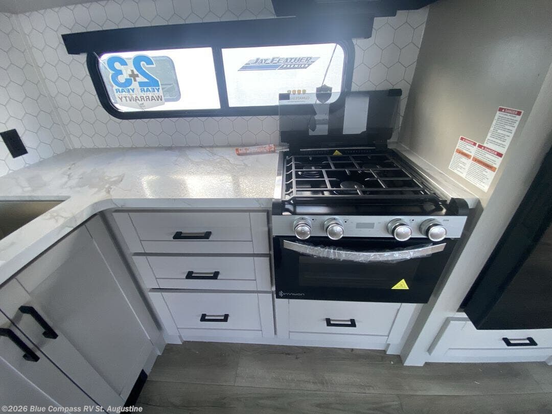 With any Jay Feather travel trailer by Jayco, you will enjoy lightweight towing, convenient exterior amenities, and at-home comforts inside! The Overlander 1 Solar Package included within the Jay Sport Package comes with a 200W solar panel and a 30-amp digital controller so you can enjoy some off-grid camping. There is also a modern graphics package, Solid fold-down step with aluminum tread steps on the main entry doorstep, and Climate Shield 0 -100° F tested weather insulation package that will allow you to camp in various types of climates. The Customer Value Package will make time outdoors easier than ever with a power tongue jack and Automotive-style aluminum rims, plus radial tires with self-adjusting electric brakes. More exterior features include a Keyed-Alike doors, a Magnum Truss roof system, and the list goes on! And we haven't even touched on the interior comforts, like the seamless countertops and Residential vinyl flooring throughout, decorative kitchen backsplash, handcrafted hardwood door/drawer fronts, and multiple USB charging ports to keep you going!
