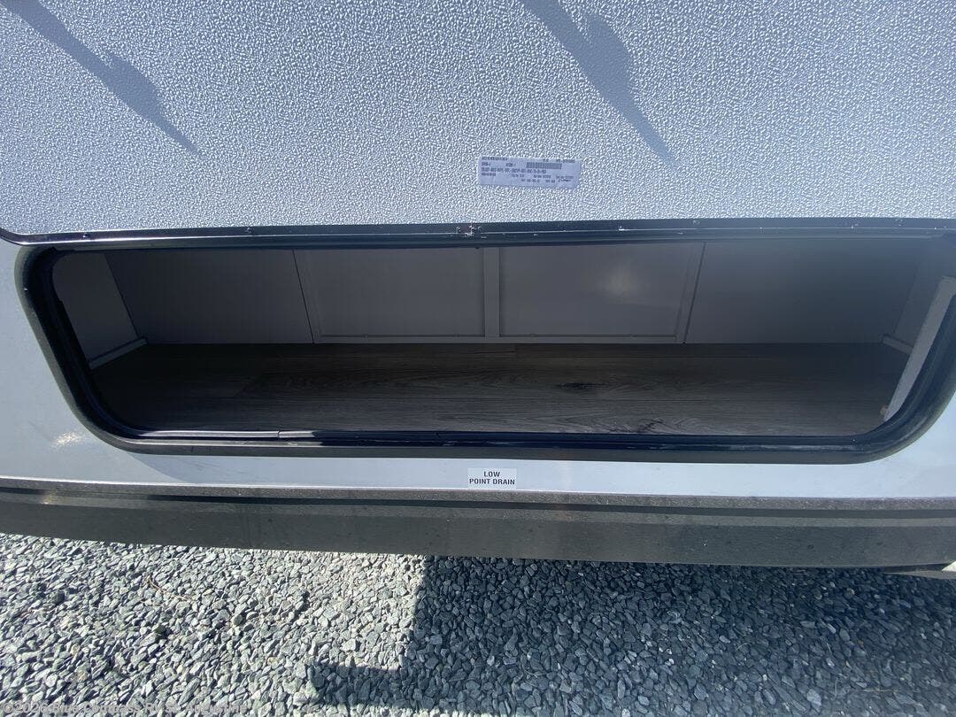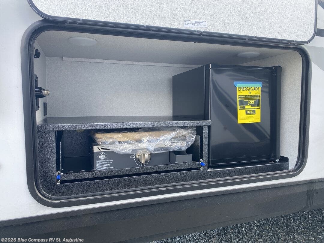 Get out and experience new campgrounds with this spacious trailer that offers a slide out tri-fold sofa and U-shaped dinette giving you dining, relaxing and sleeping space as well as more interior floor space to move from the front to the back. There is even an entertainment center here and a fireplace to make it more cozy. The cook will love the choice of making meals inside with full amenities or on the outdoor kitchen when relaxing under the 20' power awning with LED lights. You will appreciate your own space in the front private bedroom with a queen bed, dual wardrobes and nightstands, plus one of the dual entry doors. This model also includes double-size bunks with flip-up storage and a cargo door to easily pack in camp gear!