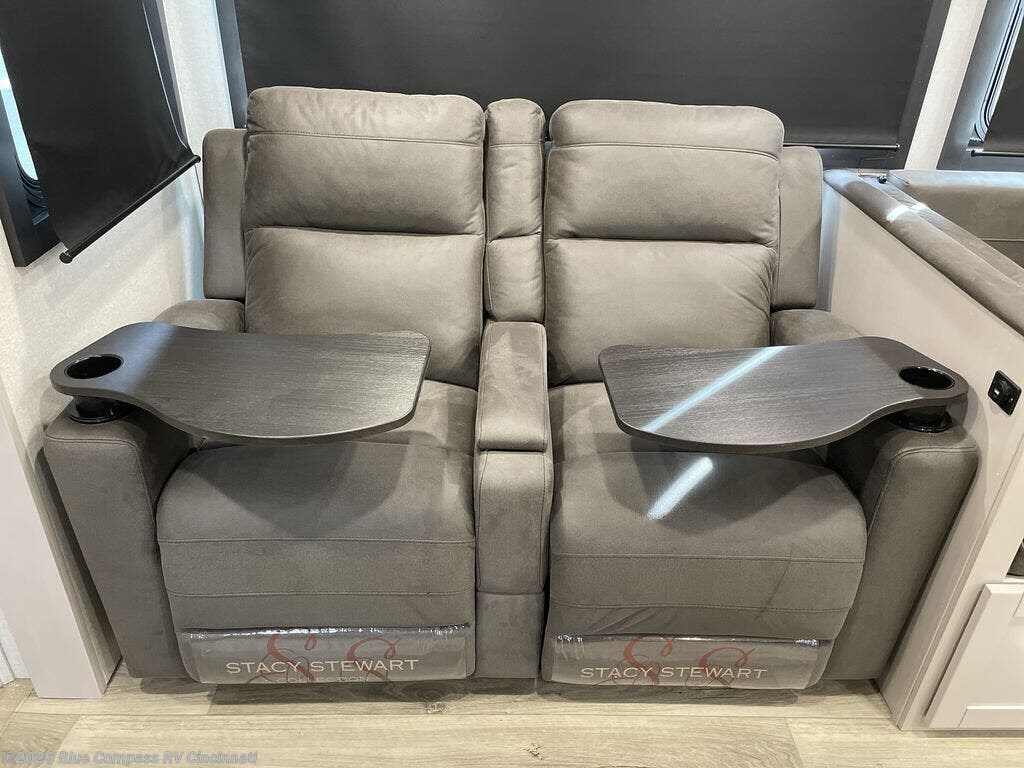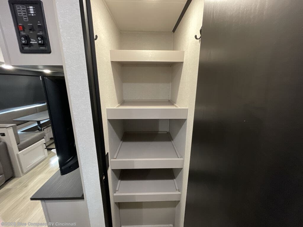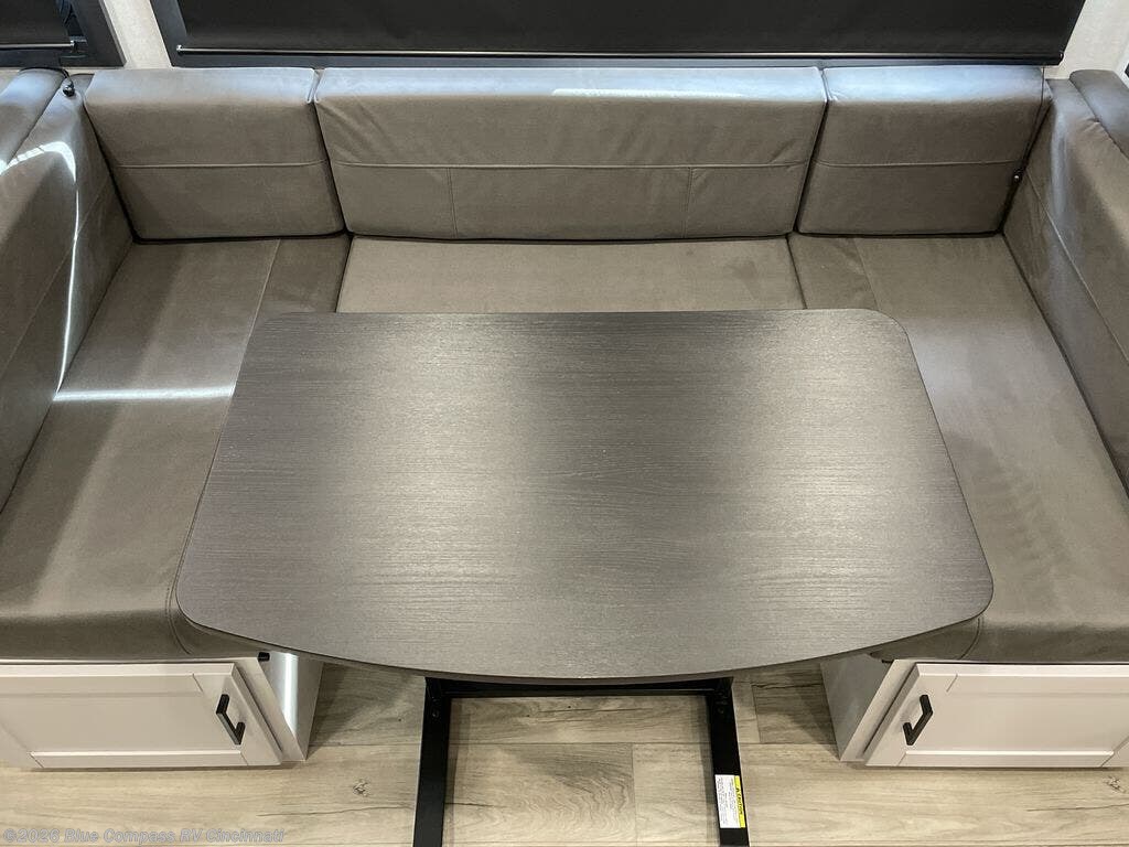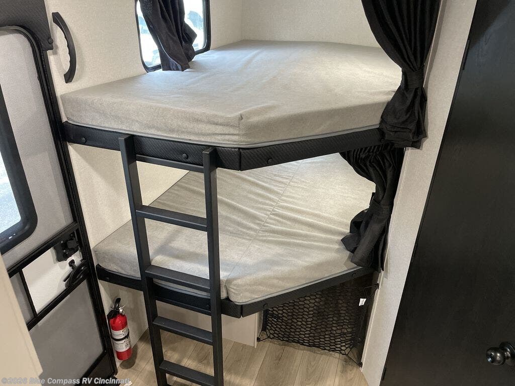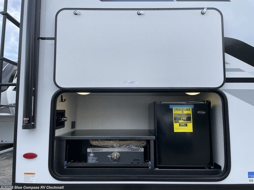 Get out and experience new campgrounds with this spacious trailer that offers a slide out tri-fold sofa and U-shaped dinette giving you dining, relaxing and sleeping space as well as more interior floor space to move from the front to the back. There is even an entertainment center here and a fireplace to make it more cozy. The cook will love the choice of making meals inside with full amenities or on the outdoor kitchen when relaxing under the 20' power awning with LED lights. You will appreciate your own space in the front private bedroom with a queen bed, dual wardrobes and nightstands, plus one of the dual entry doors. This model also includes double-size bunks with flip-up storage and a cargo door to easily pack in camp gear!