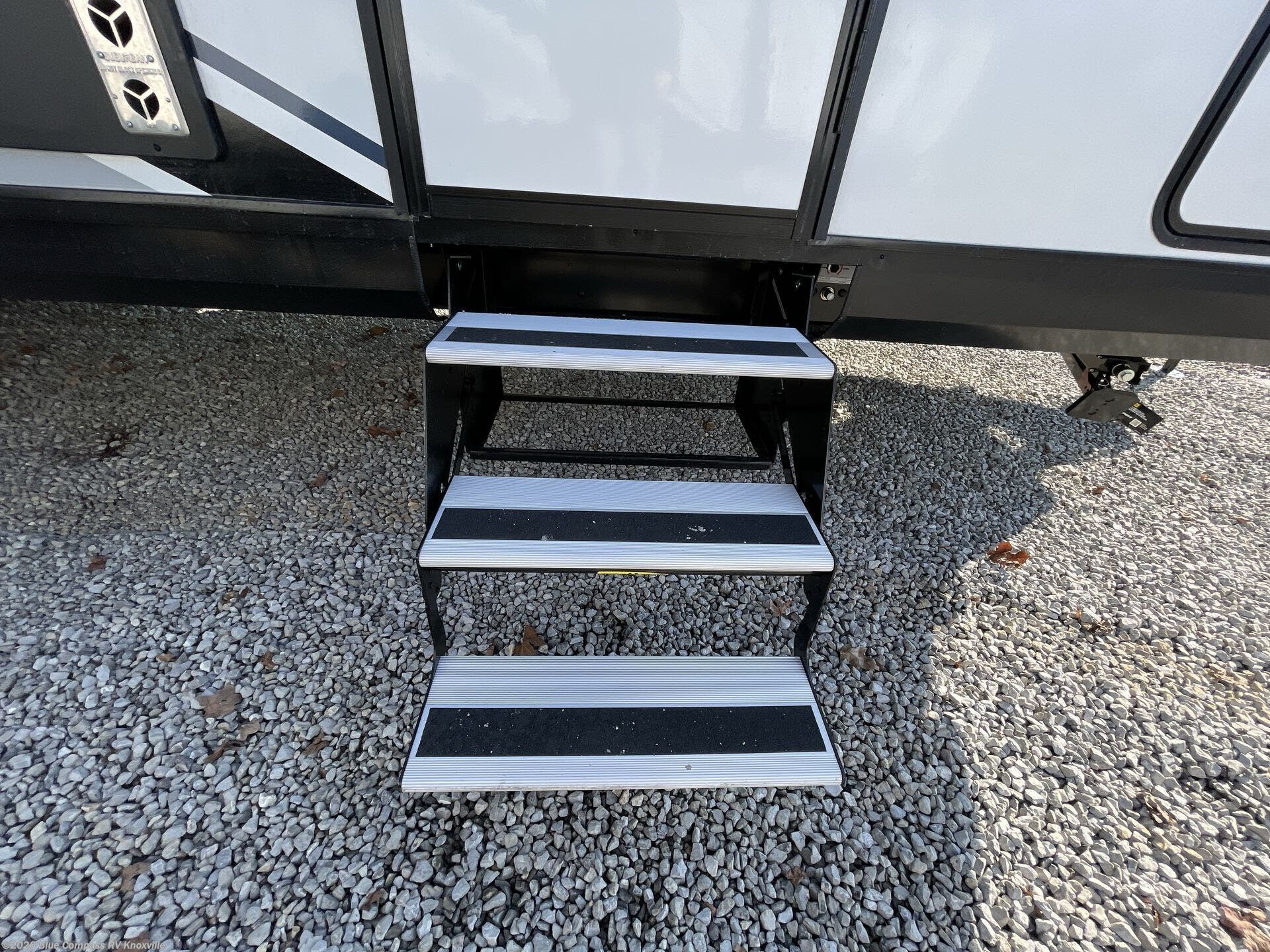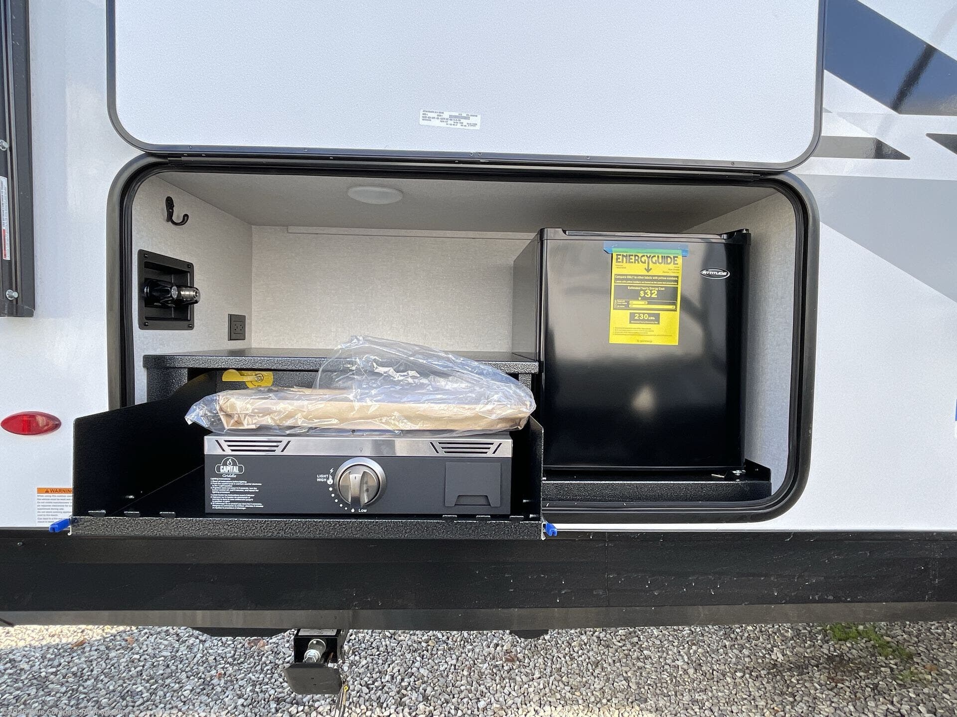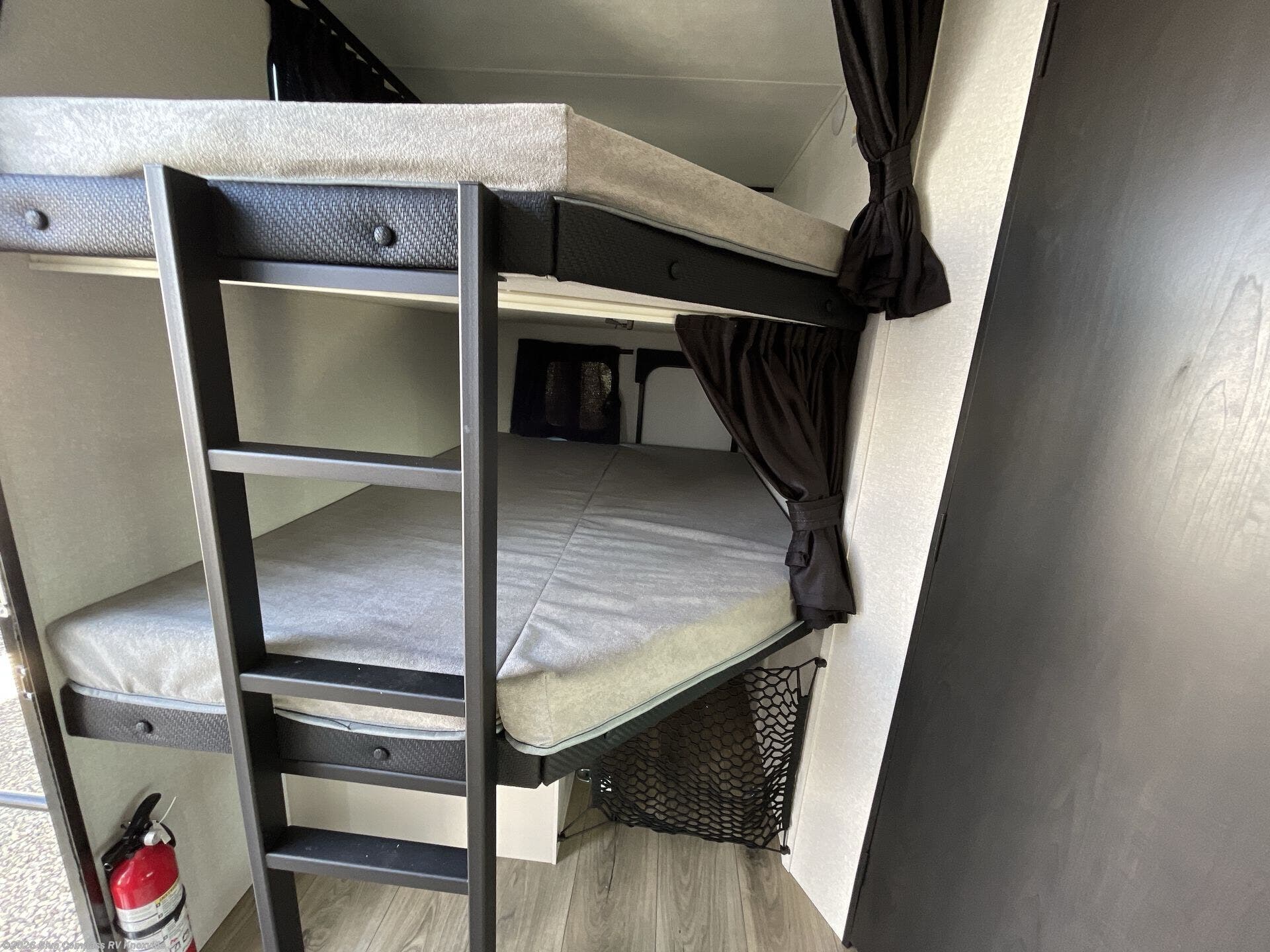 Get out and experience new campgrounds with this spacious trailer that offers a slide out tri-fold sofa and U-shaped dinette giving you dining, relaxing and sleeping space as well as more interior floor space to move from the front to the back. There is even an entertainment center here and a fireplace to make it more cozy. The cook will love the choice of making meals inside with full amenities or on the outdoor kitchen when relaxing under the 20' power awning with LED lights. You will appreciate your own space in the front private bedroom with a queen bed, dual wardrobes and nightstands, plus one of the dual entry doors. This model also includes double-size bunks with flip-up storage and a cargo door to easily pack in camp gear!