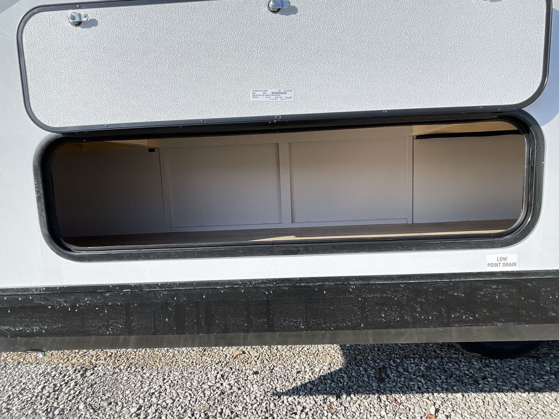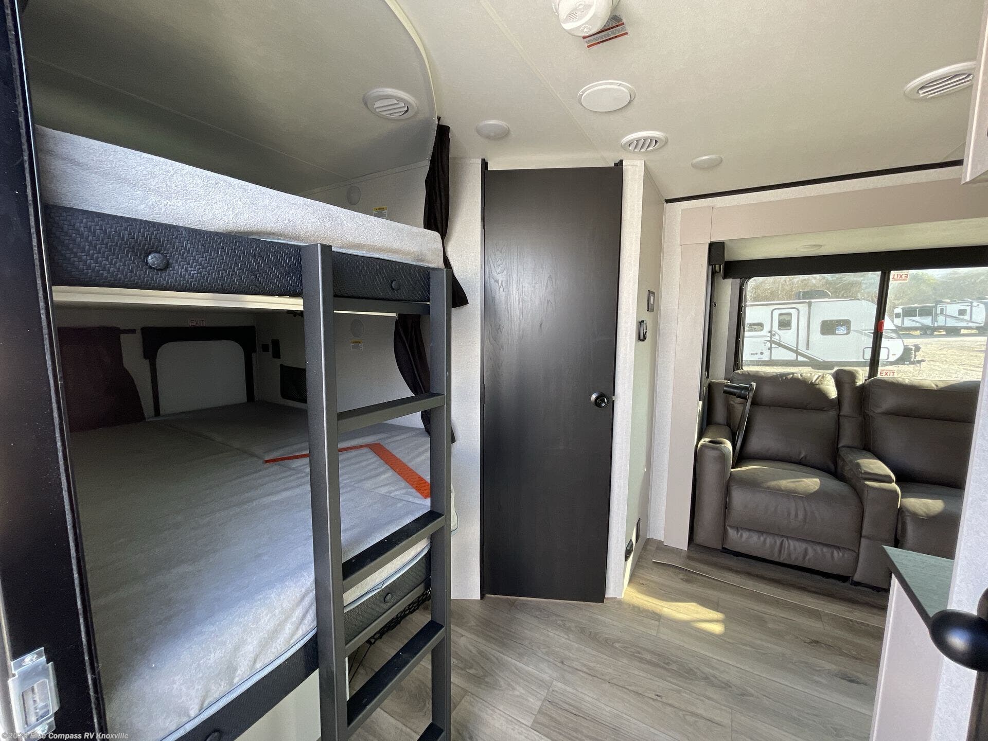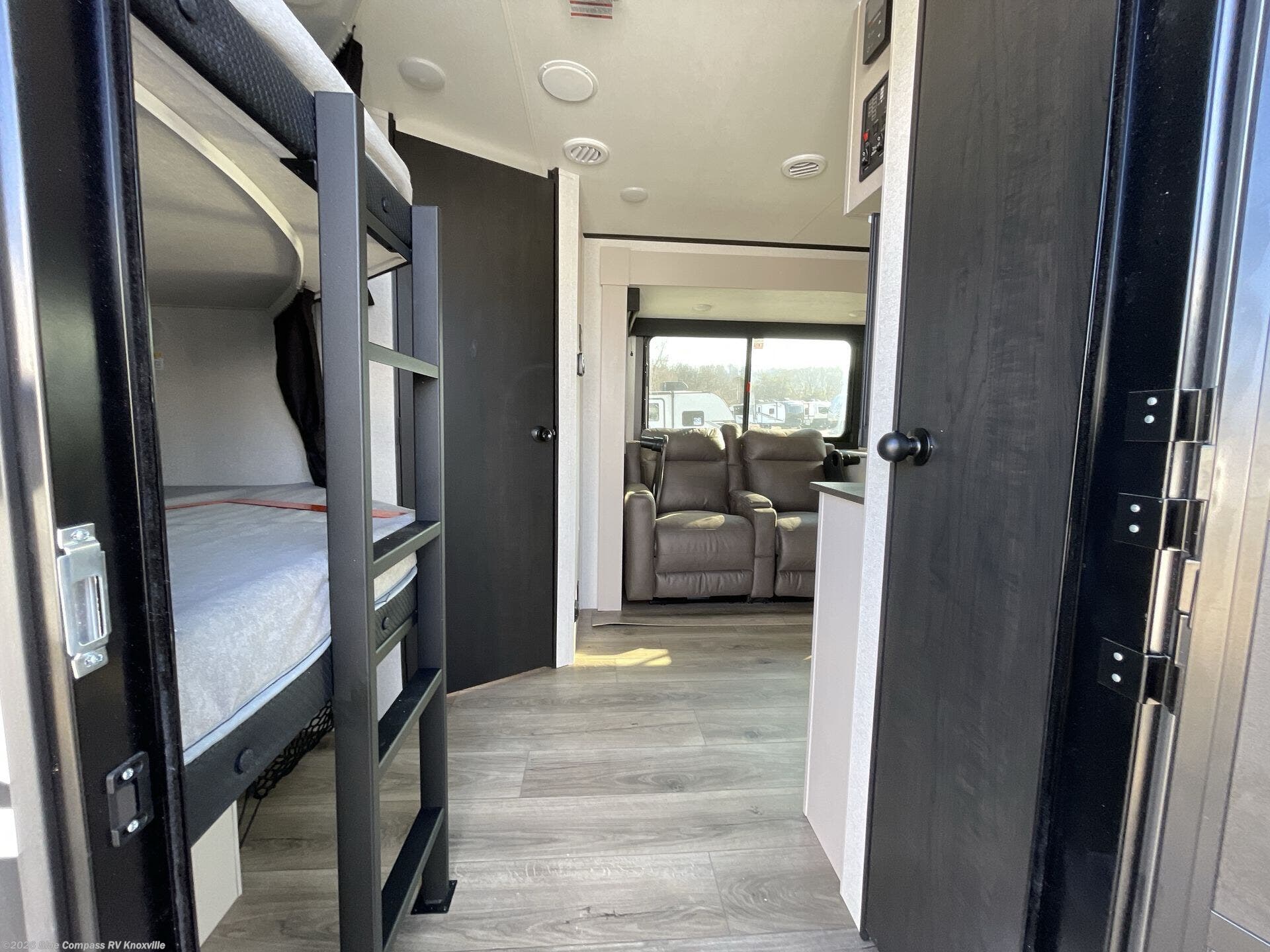 Get out and experience new campgrounds with this spacious trailer that offers a slide out tri-fold sofa and U-shaped dinette giving you dining, relaxing and sleeping space as well as more interior floor space to move from the front to the back. There is even an entertainment center here and a fireplace to make it more cozy. The cook will love the choice of making meals inside with full amenities or on the outdoor kitchen when relaxing under the 20' power awning with LED lights. You will appreciate your own space in the front private bedroom with a queen bed, dual wardrobes and nightstands, plus one of the dual entry doors. This model also includes double-size bunks with flip-up storage and a cargo door to easily pack in camp gear!