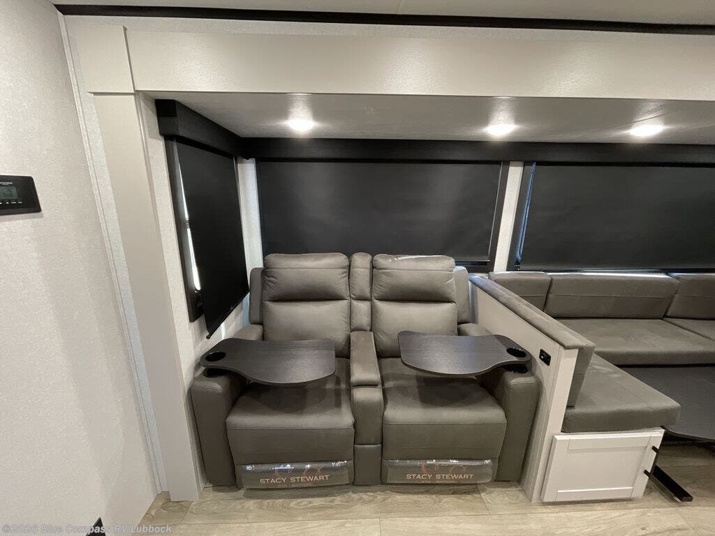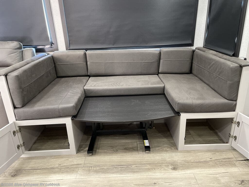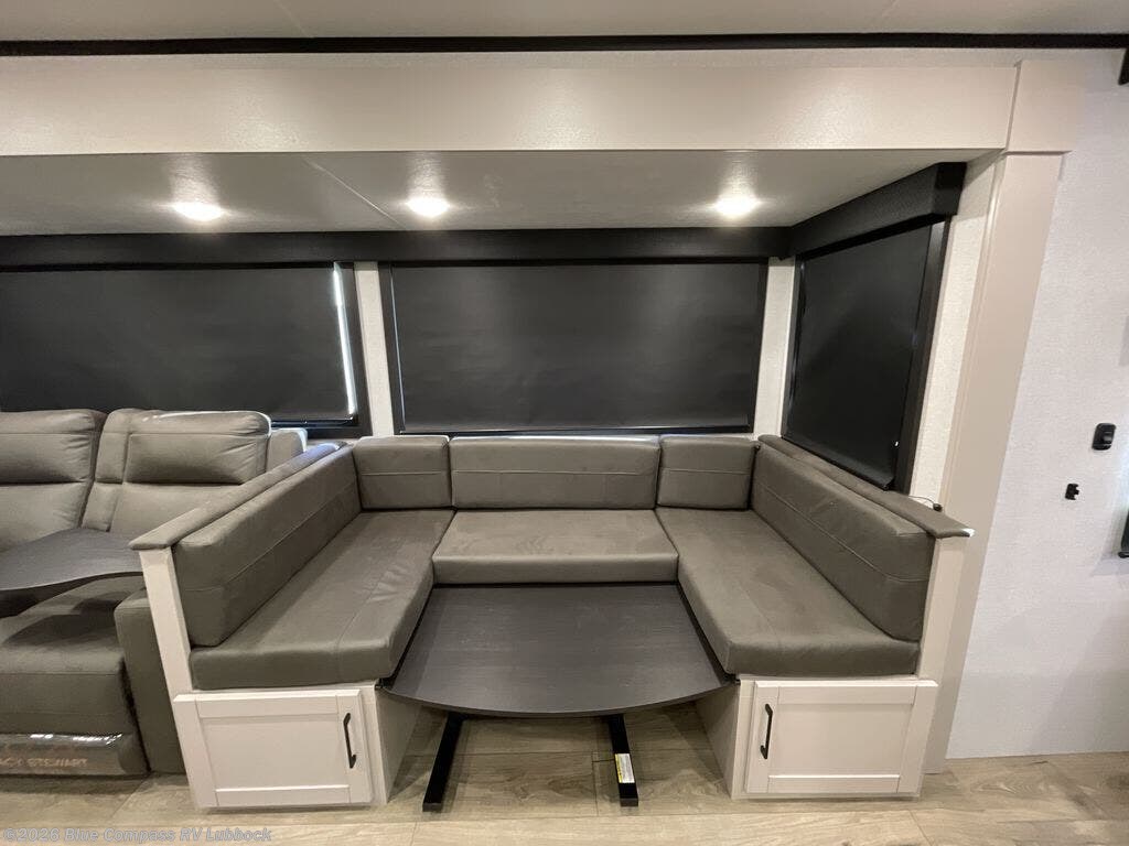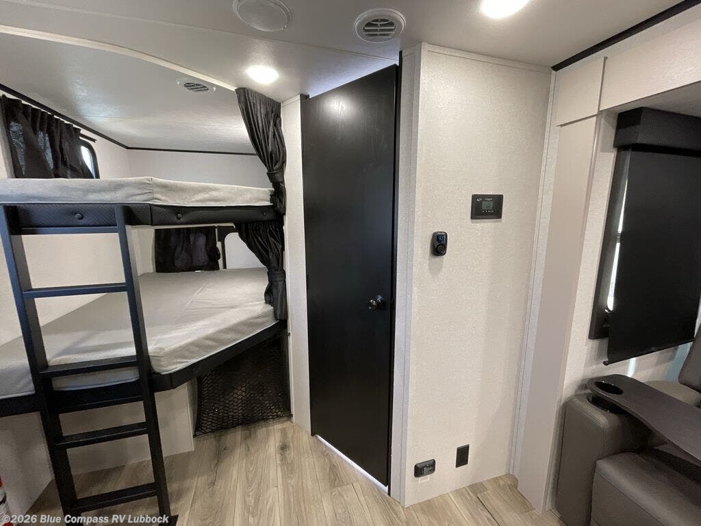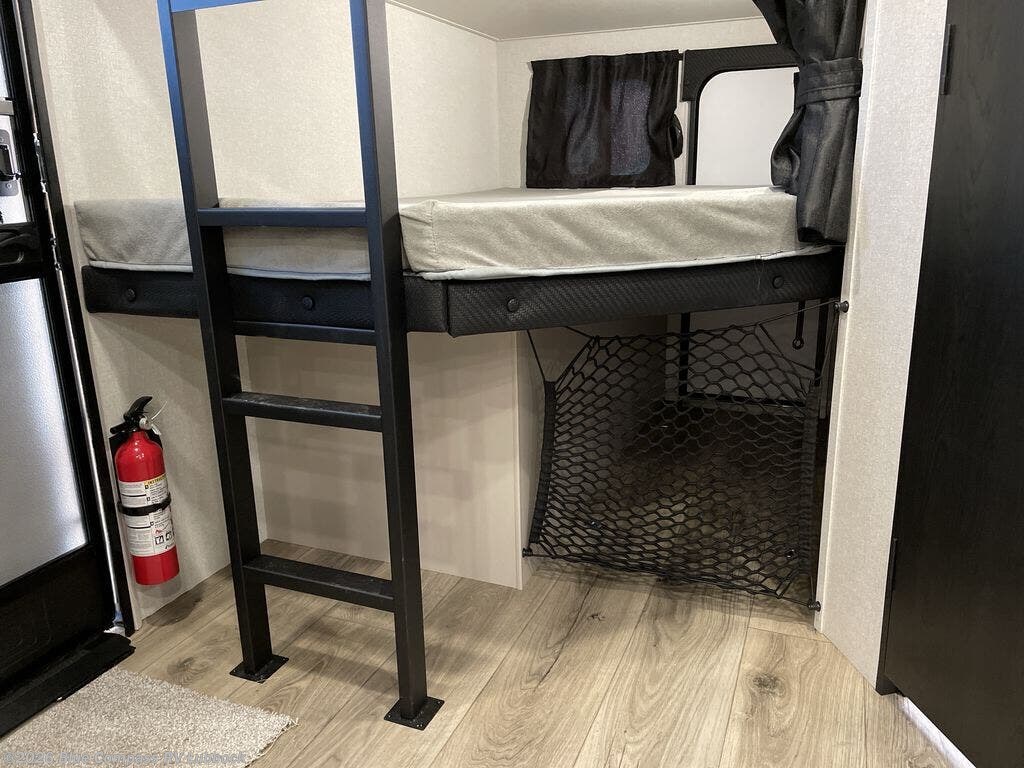 Get out and experience new campgrounds with this spacious trailer that offers a slide out tri-fold sofa and U-shaped dinette giving you dining, relaxing and sleeping space as well as more interior floor space to move from the front to the back. There is even an entertainment center here and a fireplace to make it more cozy. The cook will love the choice of making meals inside with full amenities or on the outdoor kitchen when relaxing under the 20' power awning with LED lights. You will appreciate your own space in the front private bedroom with a queen bed, dual wardrobes and nightstands, plus one of the dual entry doors. This model also includes double-size bunks with flip-up storage and a cargo door to easily pack in camp gear!
