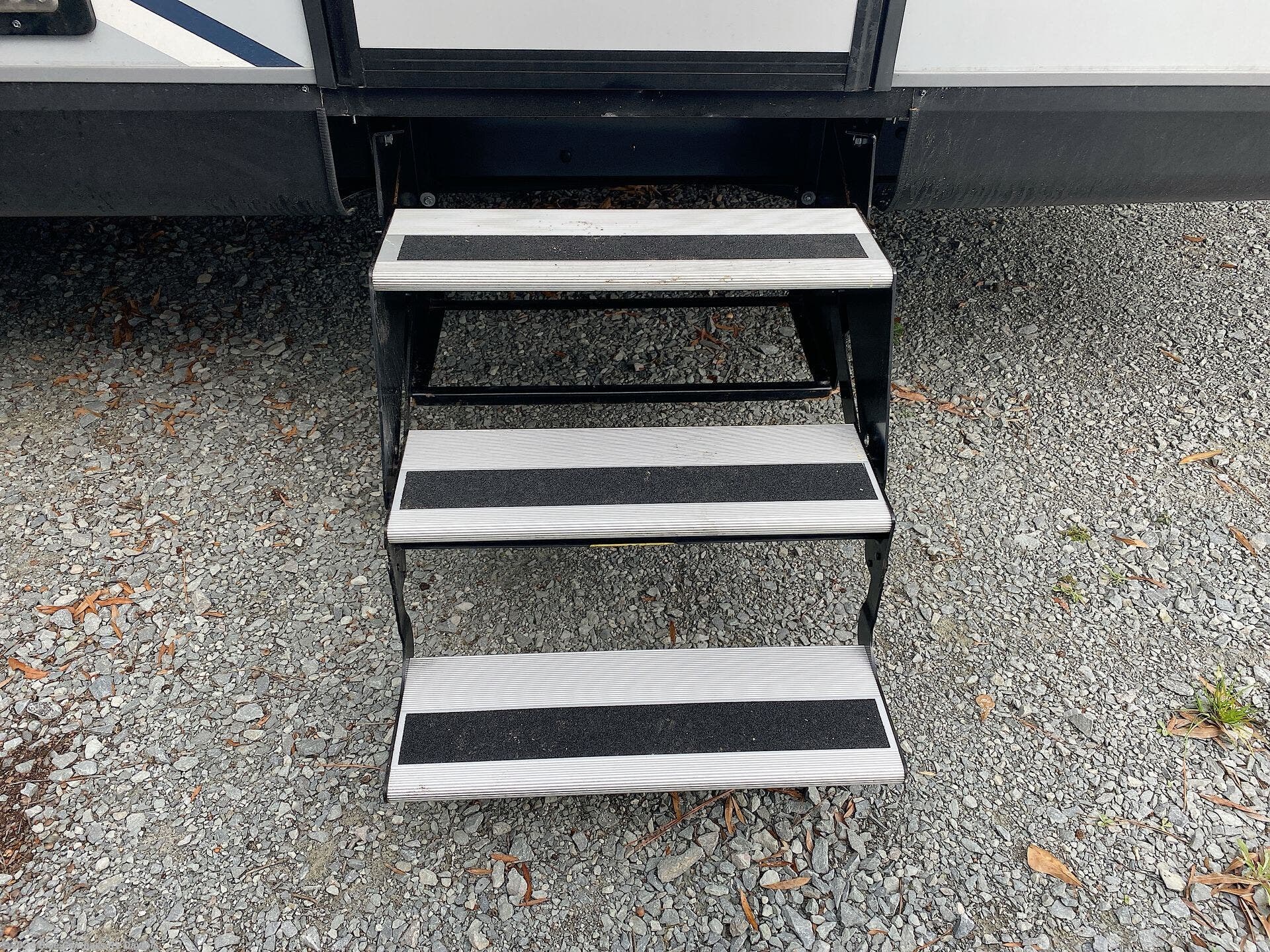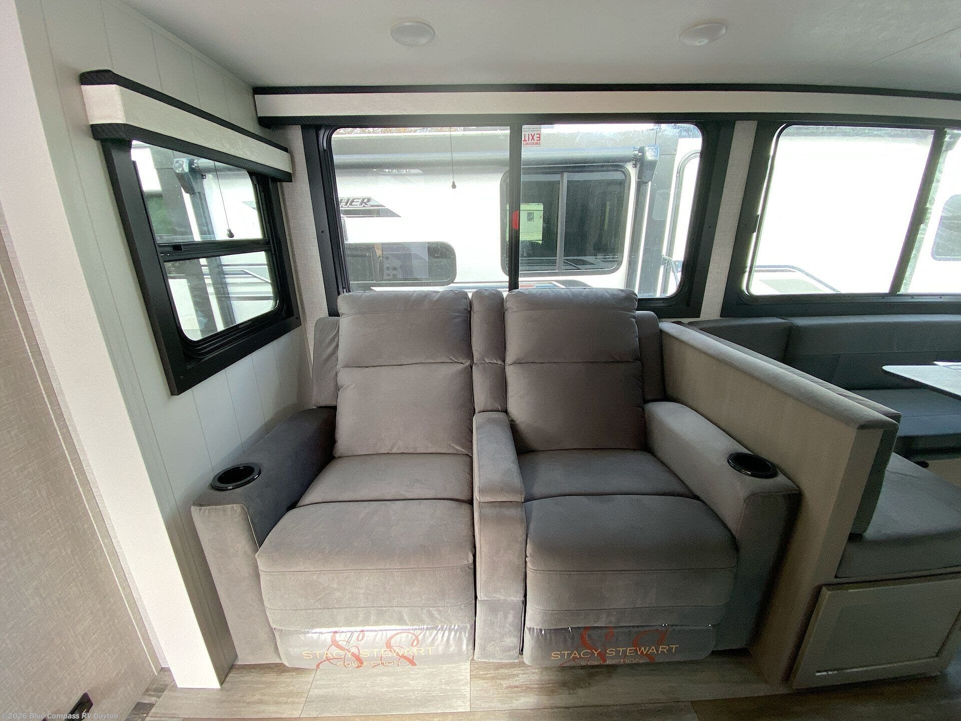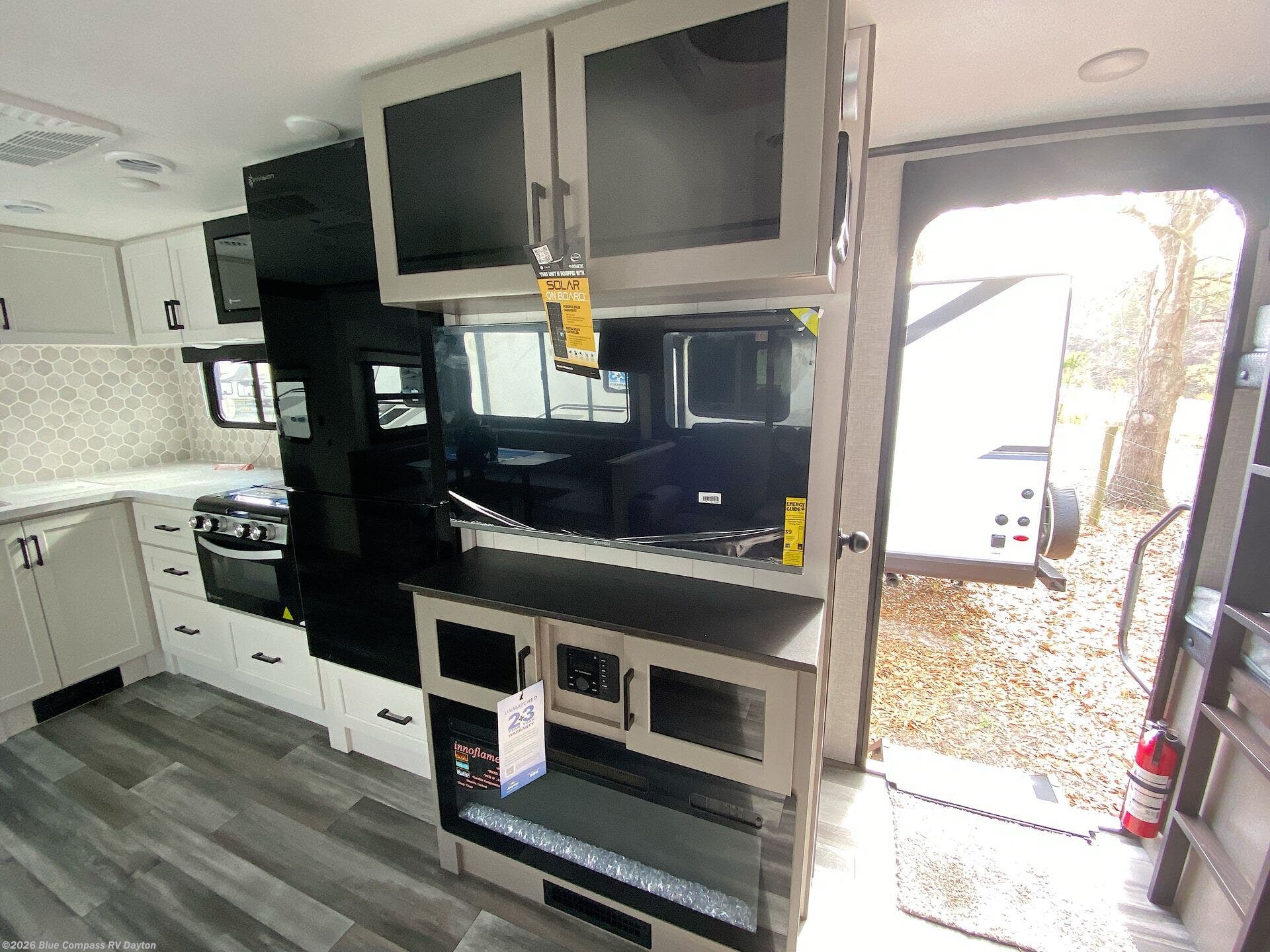 Get out and experience new campgrounds with this spacious trailer that offers a slide out tri-fold sofa and U-shaped dinette giving you dining, relaxing and sleeping space as well as more interior floor space to move from the front to the back. There is even an entertainment center here and a fireplace to make it more cozy. The cook will love the choice of making meals inside with full amenities or on the outdoor kitchen when relaxing under the 20' power awning with LED lights. You will appreciate your own space in the front private bedroom with a queen bed, dual wardrobes and nightstands, plus one of the dual entry doors. This model also includes double-size bunks with flip-up storage and a cargo door to easily pack in camp gear!