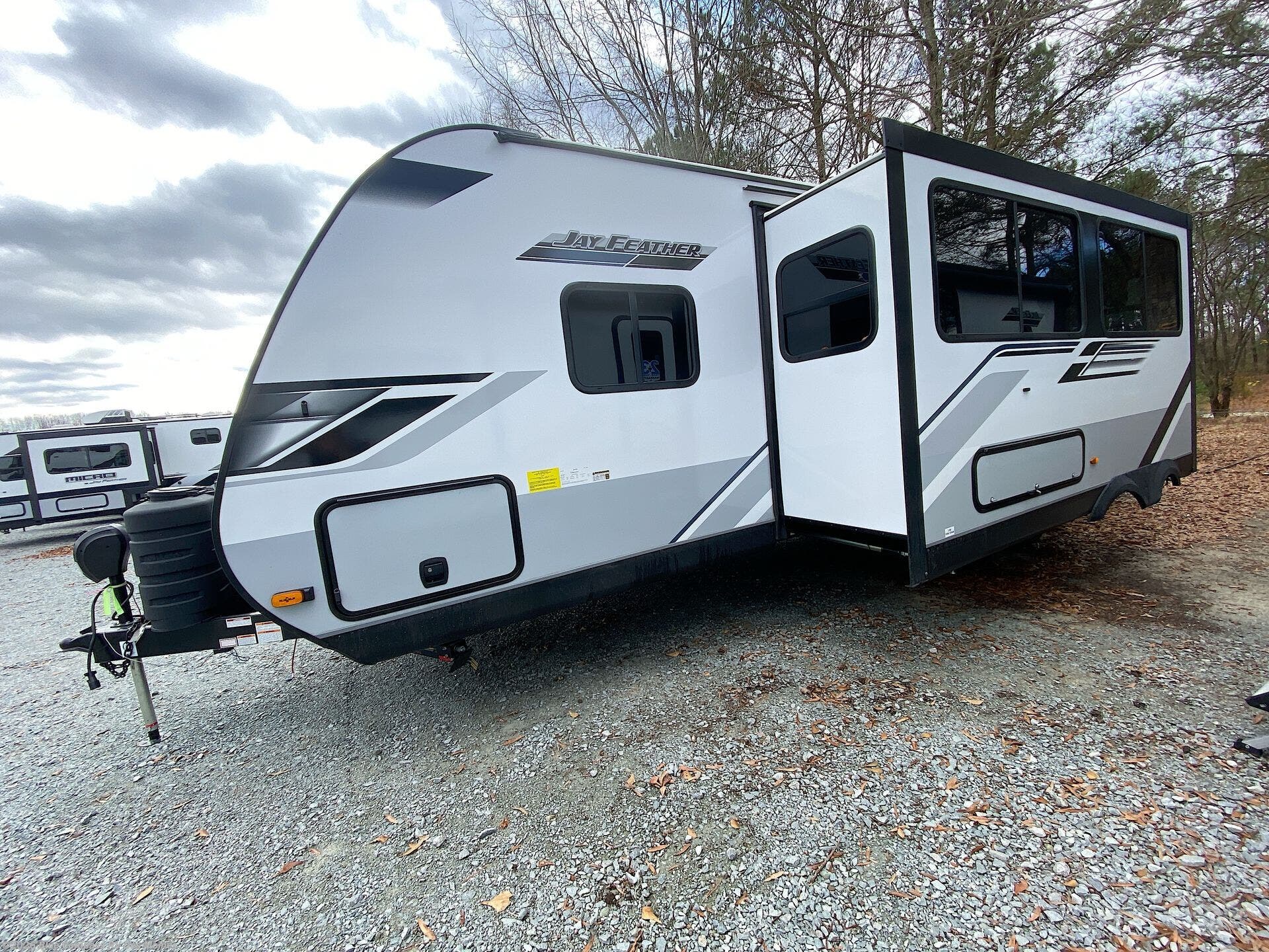 With any Jay Feather travel trailer by Jayco, you will enjoy lightweight towing, convenient exterior amenities, and at-home comforts inside! The Overlander 1 Solar Package included within the Jay Sport Package comes with a 200W solar panel and a 30-amp digital controller so you can enjoy some off-grid camping. There is also a modern graphics package, Solid fold-down step with aluminum tread steps on the main entry doorstep, and Climate Shield 0 -100° F tested weather insulation package that will allow you to camp in various types of climates. The Customer Value Package will make time outdoors easier than ever with a power tongue jack and Automotive-style aluminum rims, plus radial tires with self-adjusting electric brakes. More exterior features include a Keyed-Alike doors, a Magnum Truss roof system, and the list goes on! And we haven't even touched on the interior comforts, like the seamless countertops and Residential vinyl flooring throughout, decorative kitchen backsplash, handcrafted hardwood door/drawer fronts, and multiple USB charging ports to keep you going!