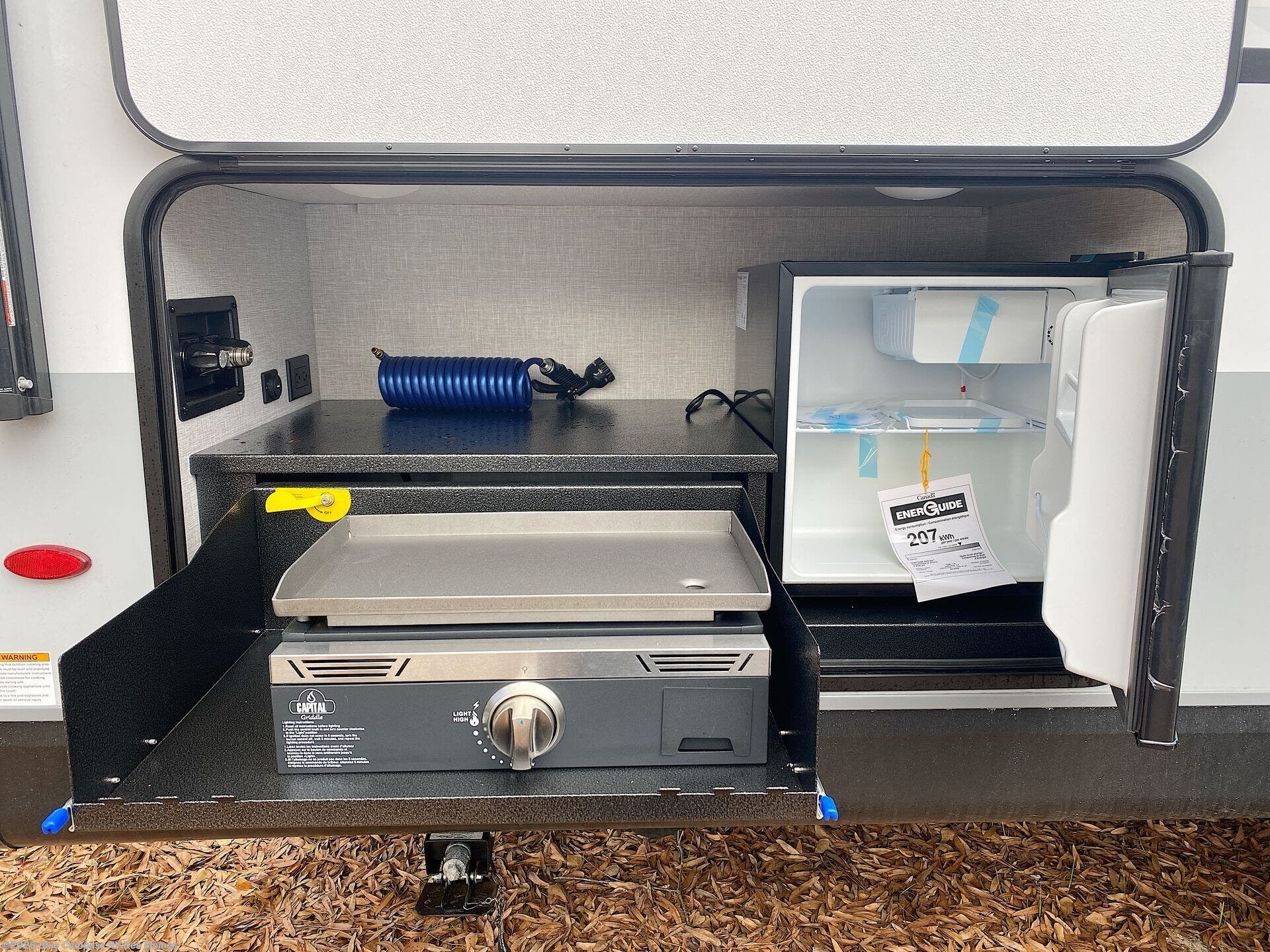 Get out and experience new campgrounds with this spacious trailer that offers a slide out tri-fold sofa and U-shaped dinette giving you dining, relaxing and sleeping space as well as more interior floor space to move from the front to the back. There is even an entertainment center here and a fireplace to make it more cozy. The cook will love the choice of making meals inside with full amenities or on the outdoor kitchen when relaxing under the 20' power awning with LED lights. You will appreciate your own space in the front private bedroom with a queen bed, dual wardrobes and nightstands, plus one of the dual entry doors. This model also includes double-size bunks with flip-up storage and a cargo door to easily pack in camp gear!