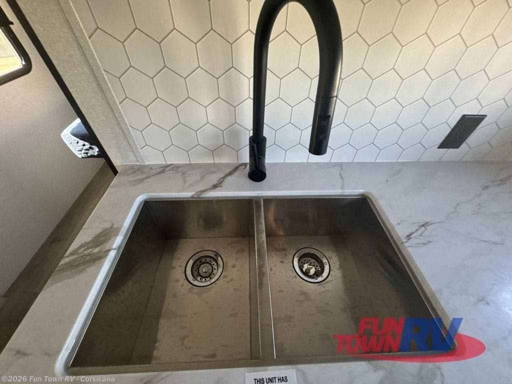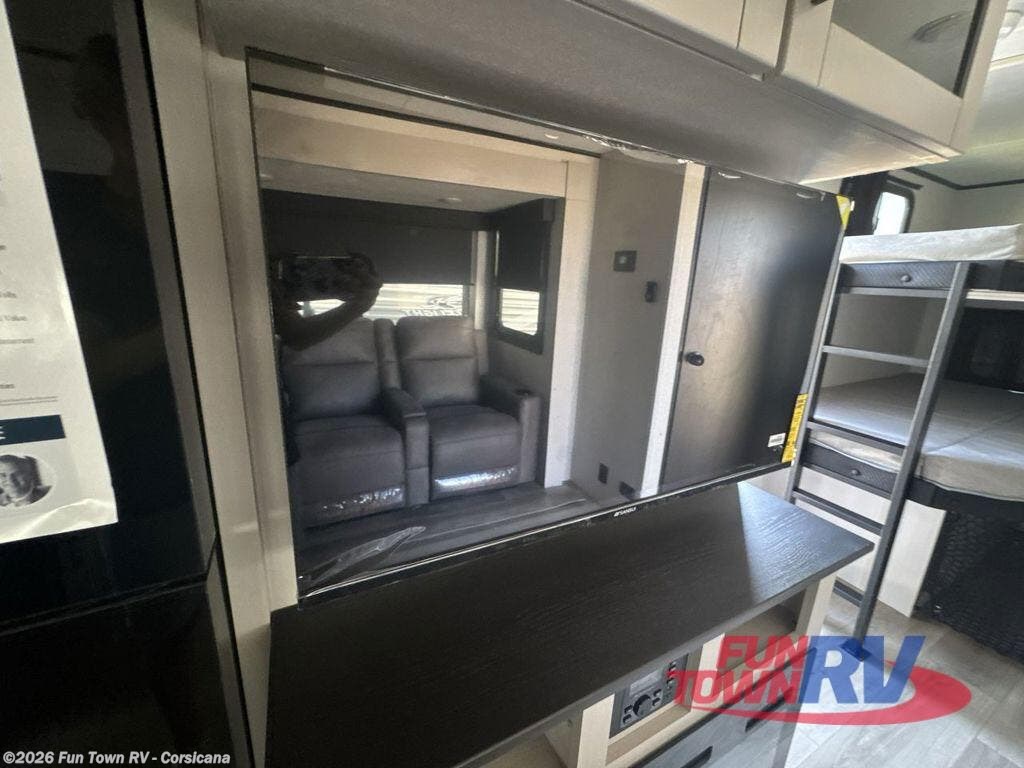 Get out and experience new campgrounds with this spacious trailer that offers a slide out tri-fold sofa and U-shaped dinette giving you dining, relaxing and sleeping space as well as more interior floor space to move from the front to the back. There is even an entertainment center here and an optional fireplace to make it more cozy. The cook will love the choice of making meals inside with full amenities or on the outside kitchen when relaxing under the 21' power awning with LED lights. You will appreciate your own space in the front private bedroom with a queen bed, dual wardrobes and nightstands, plus one of the dual entry doors. This model also includes double-size bunks with flip-up storage and a kayak door to easily pack in camp gear!
