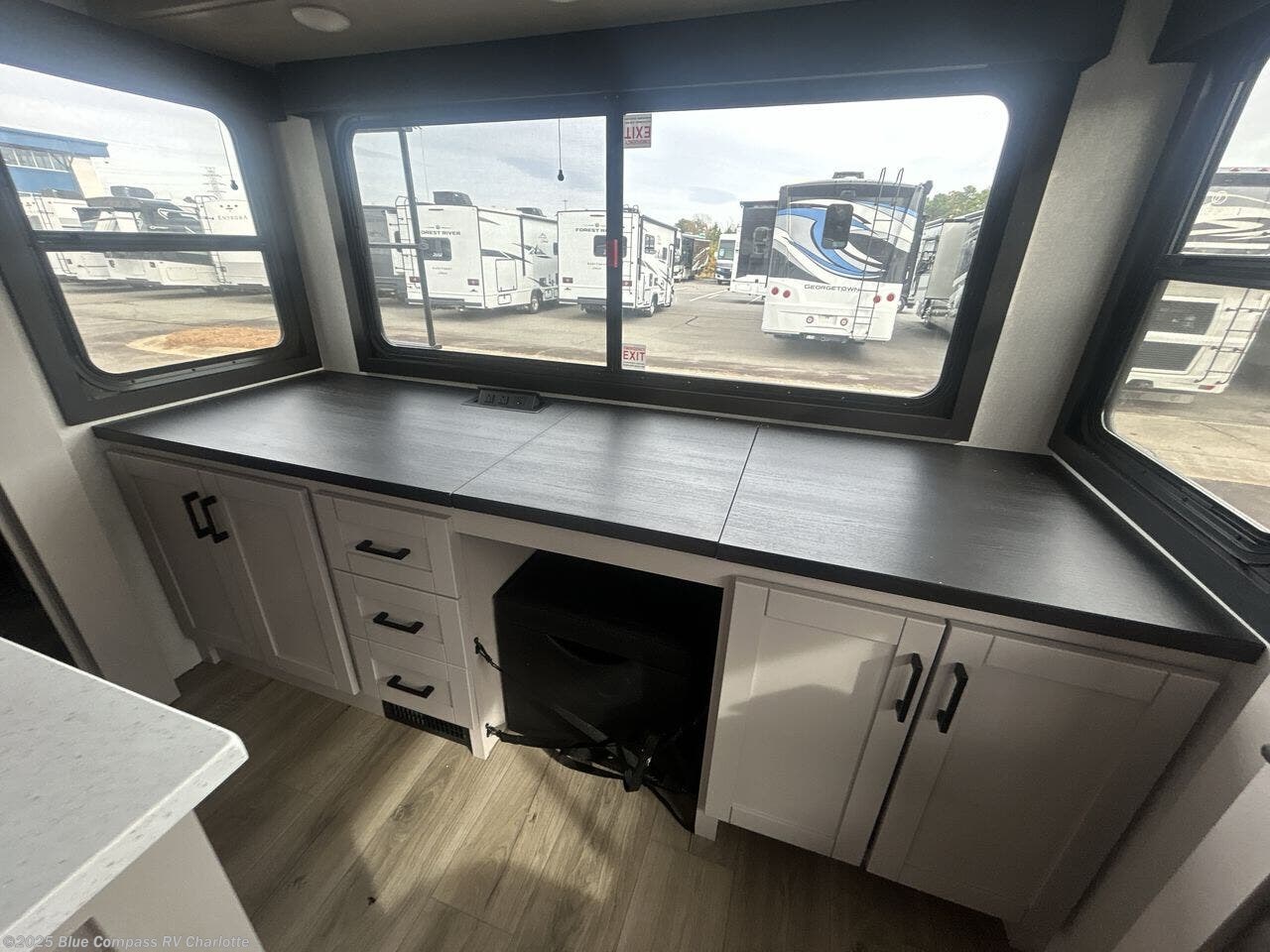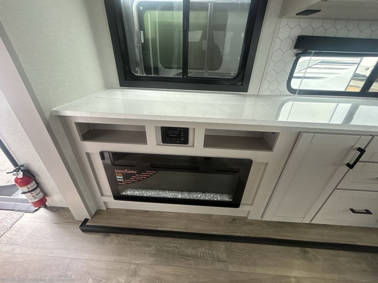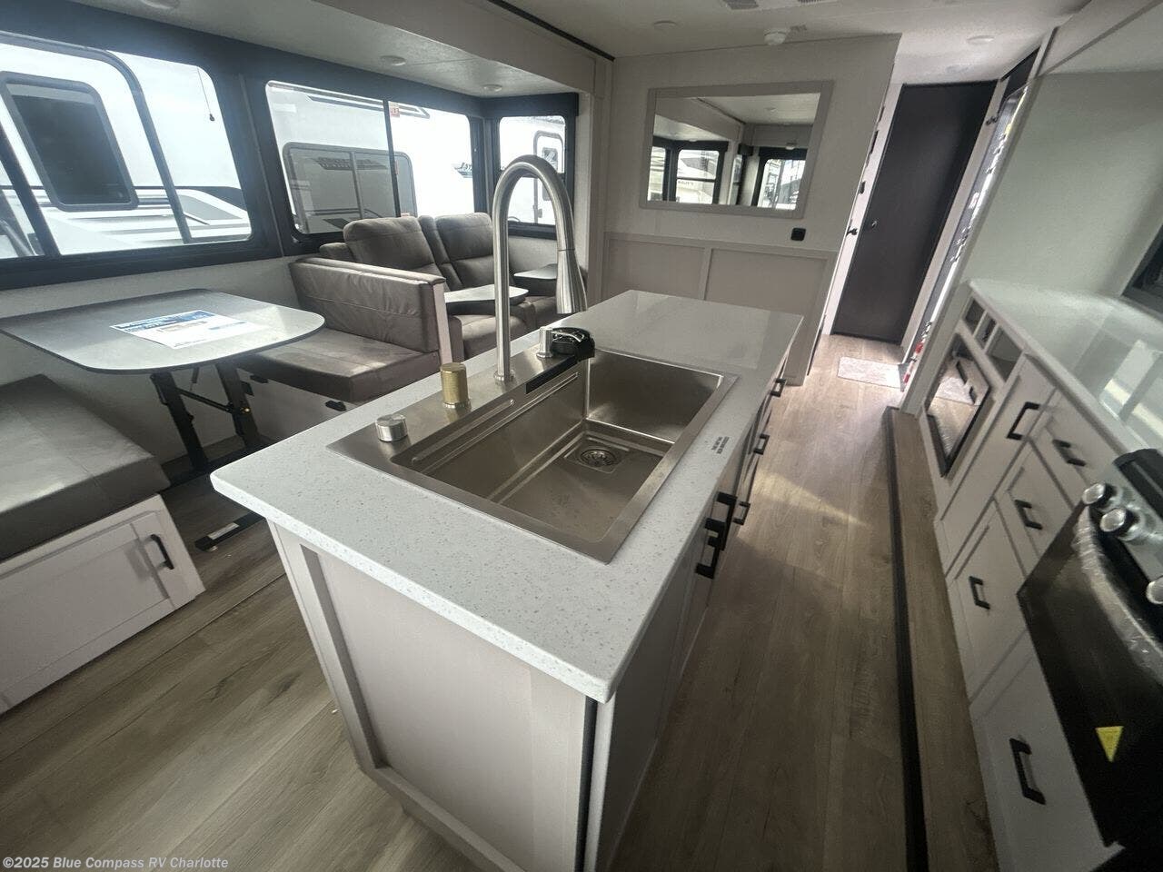 Perfect for weekend trips or extended stays, this travel trailer is the one! You will find a rear desk with an ottoman plus overhead storage if you plan to work while you're away from home. The dual opposing slides in the combined kitchen and living area will create an open floorplan, and the kitchen island will provide the chef of your group with more counter space. There is a tri-fold sofa and booth dinette that double as seating and sleeping space, and the full bath onboard will keep everyone clean. Don't overlook the front private bedroom with a queen bed and plenty of storage space for your belongings!