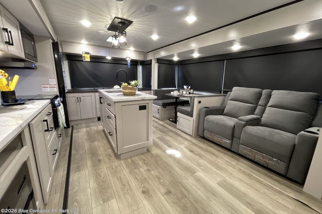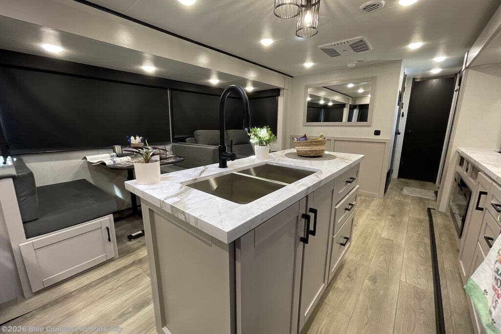 Perfect for weekend trips or extended stays, this travel trailer is the one! You will find a rear desk with an ottoman plus overhead storage if you plan to work while you're away from home. The dual opposing slides in the combined kitchen and living area will create an open floorplan, and the kitchen island will provide the chef of your group with more counter space. There is a tri-fold sofa and booth dinette that double as seating and sleeping space, and the full bath onboard will keep everyone clean. Don't overlook the front private bedroom with a queen bed and plenty of storage space for your belongings!