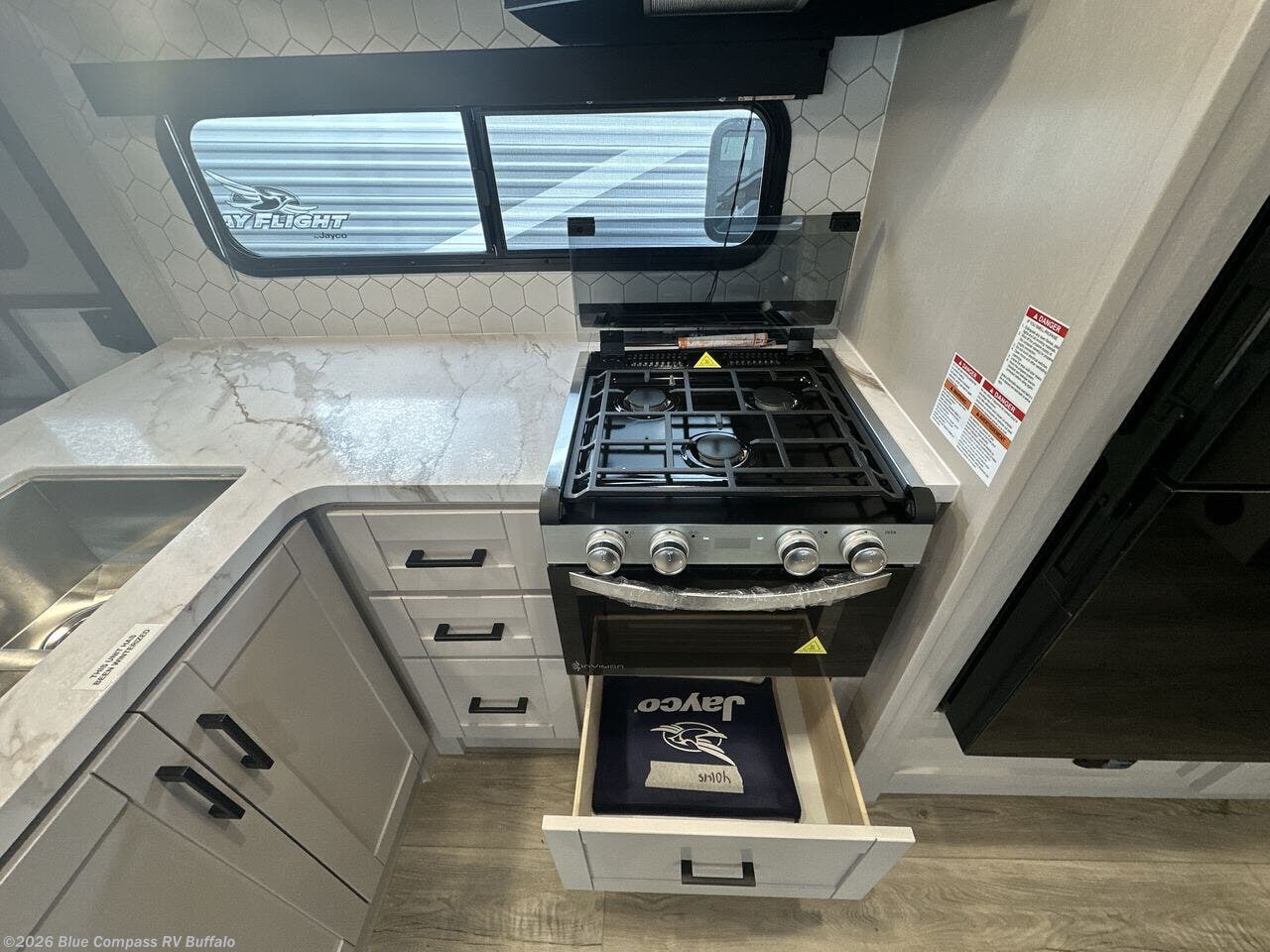 With any Jay Feather travel trailer by Jayco, you will enjoy lightweight towing, convenient exterior amenities, and at-home comforts inside! The Overlander 1 Solar Package included within the Jay Sport Package comes with a 200W solar panel and a 30-amp digital controller so you can enjoy some off-grid camping. There is also a modern graphics package, Solid fold-down step with aluminum tread steps on the main entry doorstep, and Climate Shield 0 -100° F tested weather insulation package that will allow you to camp in various types of climates. The Customer Value Package will make time outdoors easier than ever with a power tongue jack and Automotive-style aluminum rims, plus radial tires with self-adjusting electric brakes. More exterior features include a Keyed-Alike doors, a Magnum Truss roof system, and the list goes on! And we haven't even touched on the interior comforts, like the seamless countertops and Residential vinyl flooring throughout, decorative kitchen backsplash, handcrafted hardwood door/drawer fronts, and multiple USB charging ports to keep you going!