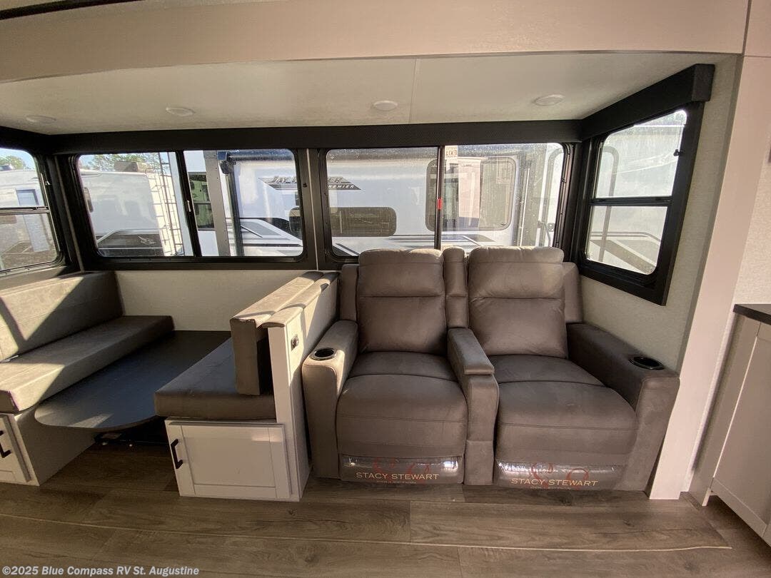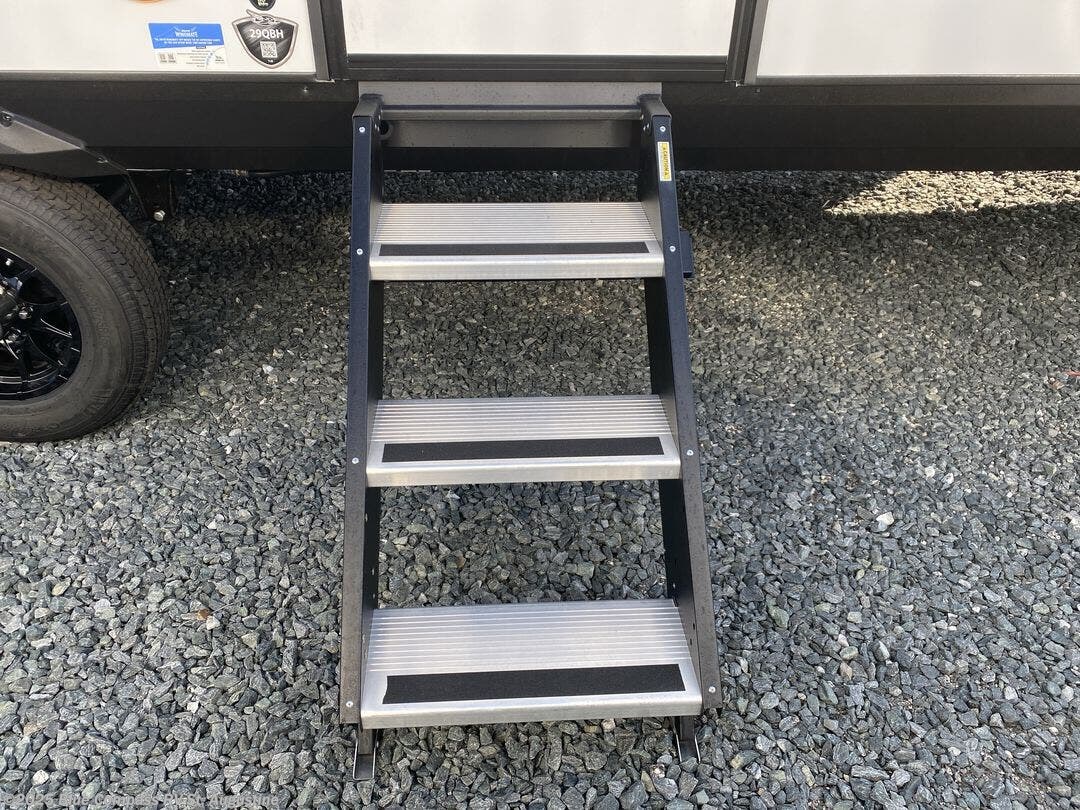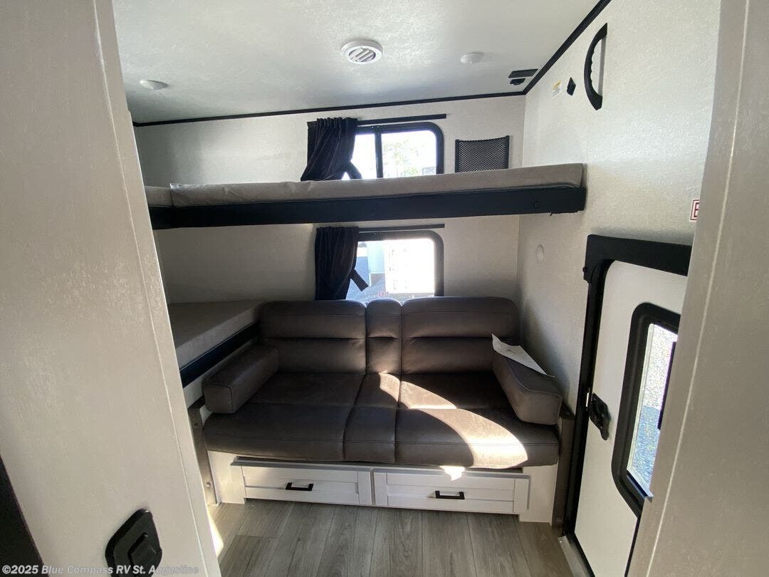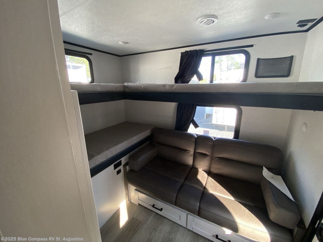 If you've been searching for a travel trailer that will fit your whole gang, this is the one! Because there is a rear private bunkhouse with three bunks and a jackknife sofa, your guests or kids will have their own space each night. There is also an exterior cargo door so you can pack camp gear directly into the bunkhouse for convenience! The combined living area and kitchen is open and spacious thanks to the large slide out, and here you'll enjoy the tri-fold sofa and booth dinette that can also serve as even more sleeping space if needed. There is also a pantry plus additional storage, along with a stainless-steel sink and a 11 cubic ft refrigerator to store your groceries. There is an entertainment center with an LED Smart TV, and a full bath with a 30" x 36" where you can clean up after lake swimming. You will love the front private bedroom with a queen bed, a wardrobe, dual nightstands, and overhead storage so everything has its place!