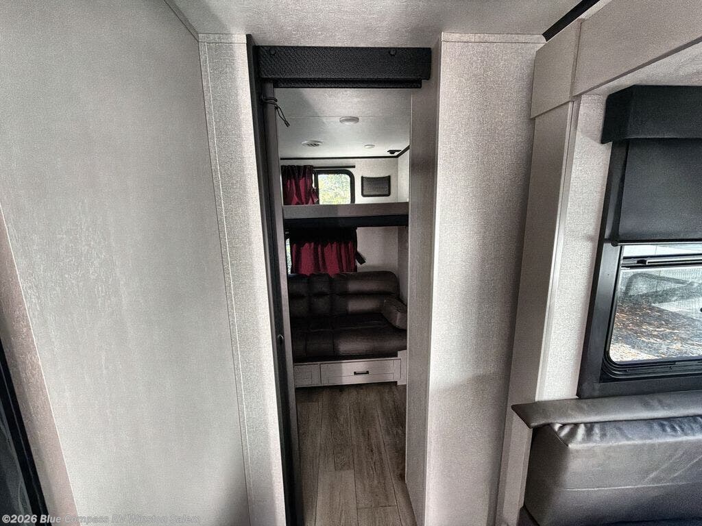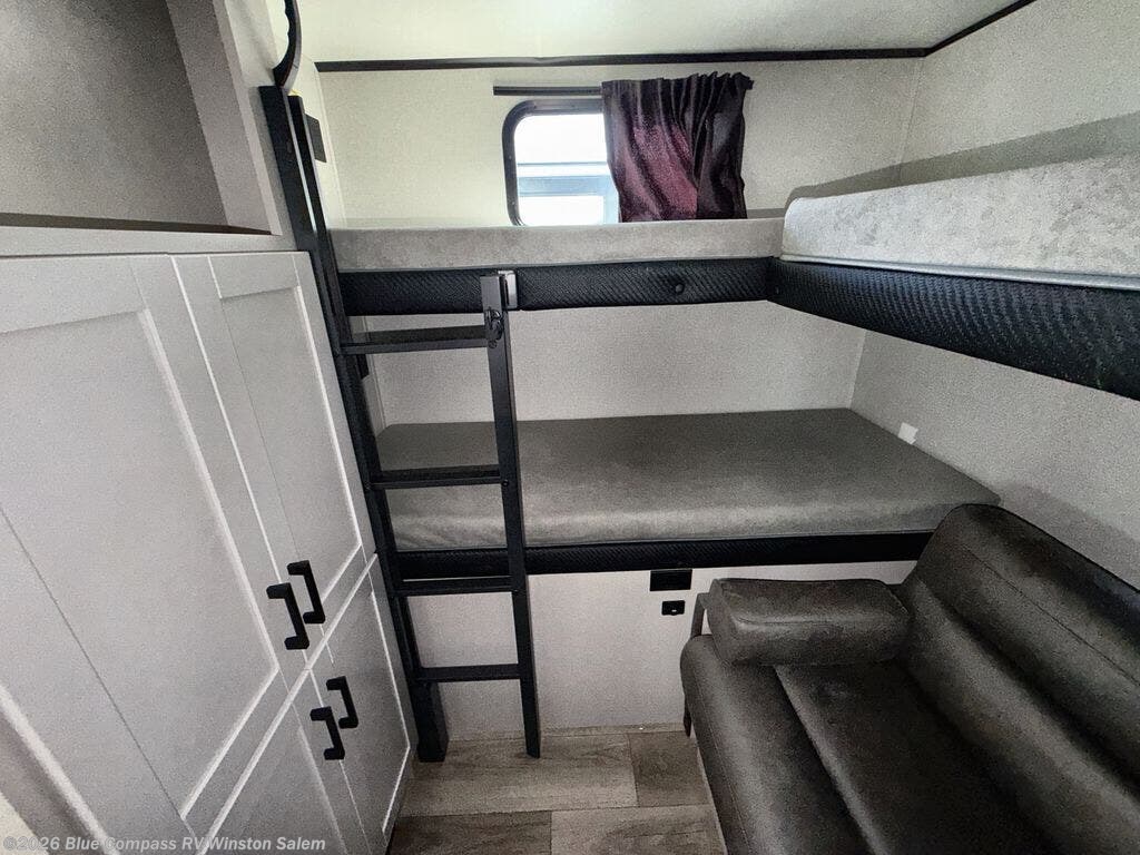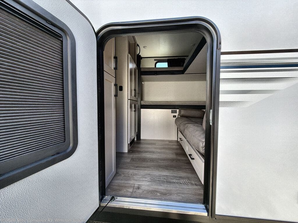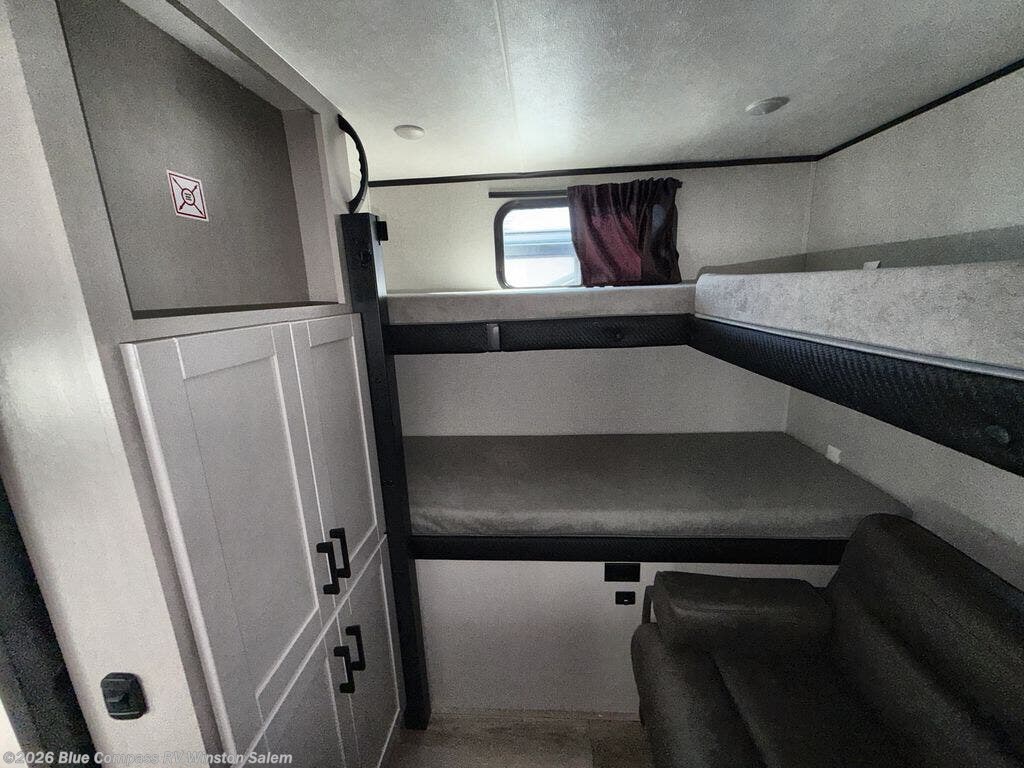 If you've been searching for a travel trailer that will fit your whole gang, this is the one! Because there is a rear private bunkhouse with three bunks and a jackknife sofa, your guests or kids will have their own space each night. There is also an exterior cargo door so you can pack camp gear directly into the bunkhouse for convenience! The combined living area and kitchen is open and spacious thanks to the large slide out, and here you'll enjoy the tri-fold sofa and booth dinette that can also serve as even more sleeping space if needed. There is also a pantry plus additional storage, along with a stainless-steel sink and a 11 cubic ft refrigerator to store your groceries. There is an entertainment center with an LED Smart TV, and a full bath with a 30" x 36" where you can clean up after lake swimming. You will love the front private bedroom with a queen bed, a wardrobe, dual nightstands, and overhead storage so everything has its place!