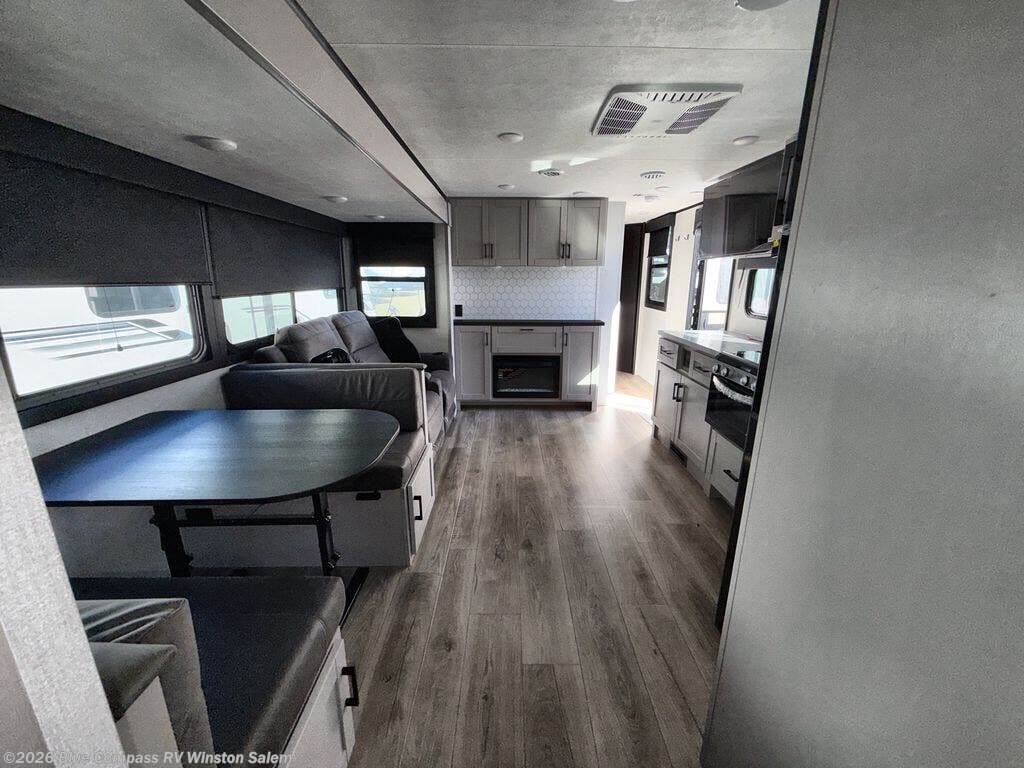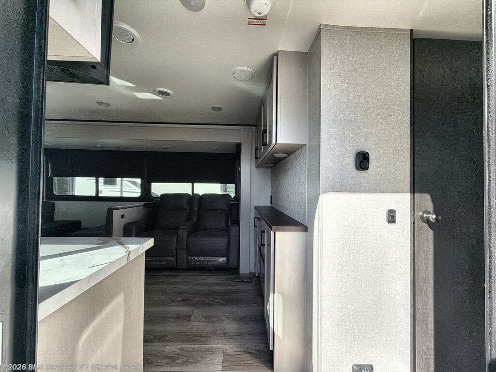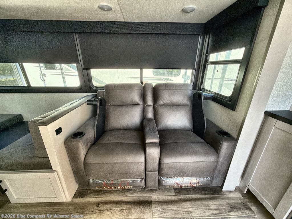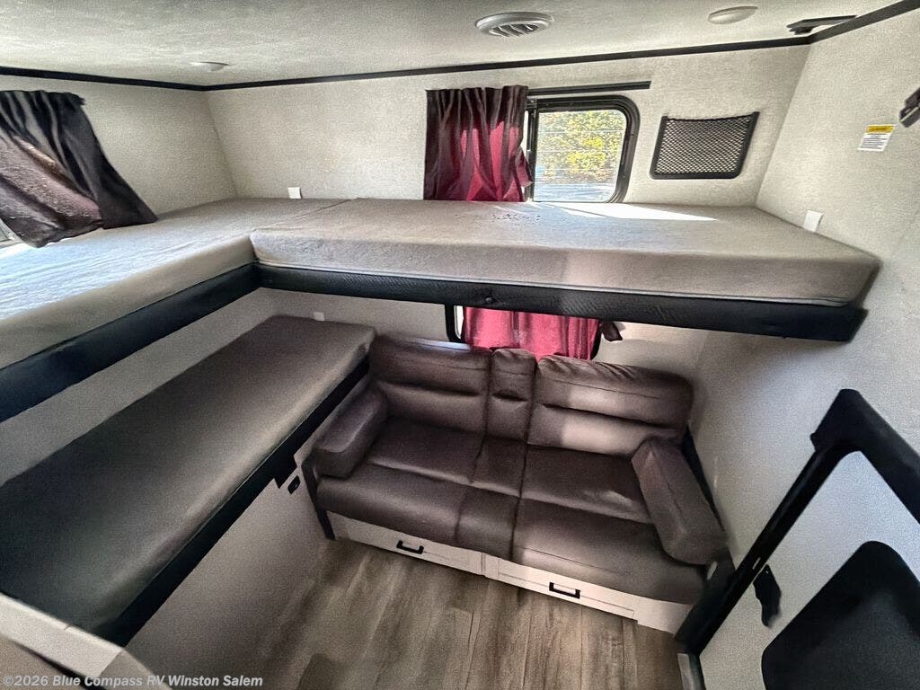 If you've been searching for a travel trailer that will fit your whole gang, this is the one! Because there is a rear private bunkhouse with three bunks and a jackknife sofa, your guests or kids will have their own space each night. There is also an exterior cargo door so you can pack camp gear directly into the bunkhouse for convenience! The combined living area and kitchen is open and spacious thanks to the large slide out, and here you'll enjoy the tri-fold sofa and booth dinette that can also serve as even more sleeping space if needed. There is also a pantry plus additional storage, along with a stainless-steel sink and a 11 cubic ft refrigerator to store your groceries. There is an entertainment center with an LED Smart TV, and a full bath with a 30" x 36" where you can clean up after lake swimming. You will love the front private bedroom with a queen bed, a wardrobe, dual nightstands, and overhead storage so everything has its place!