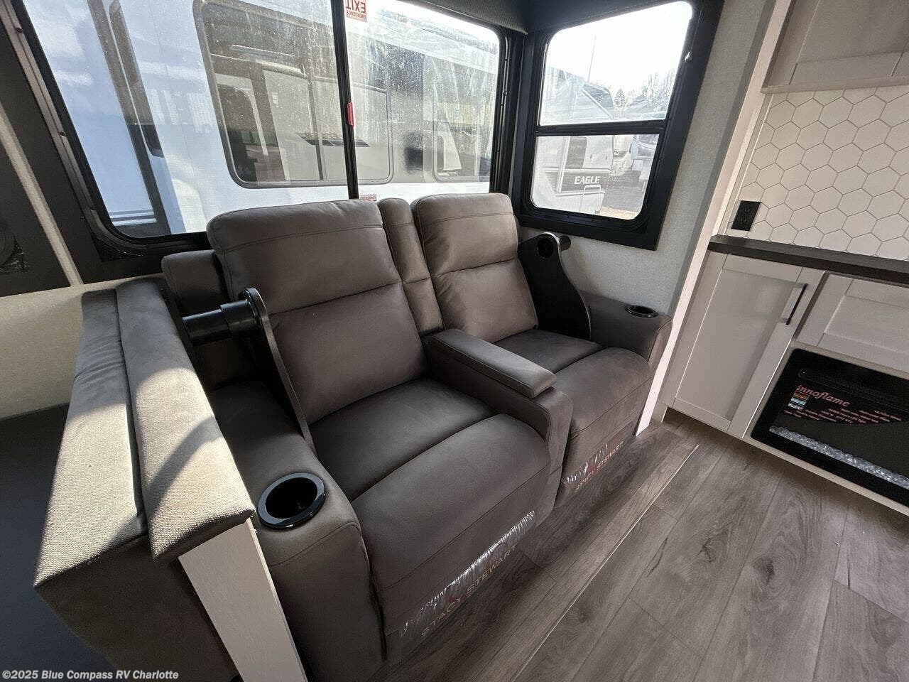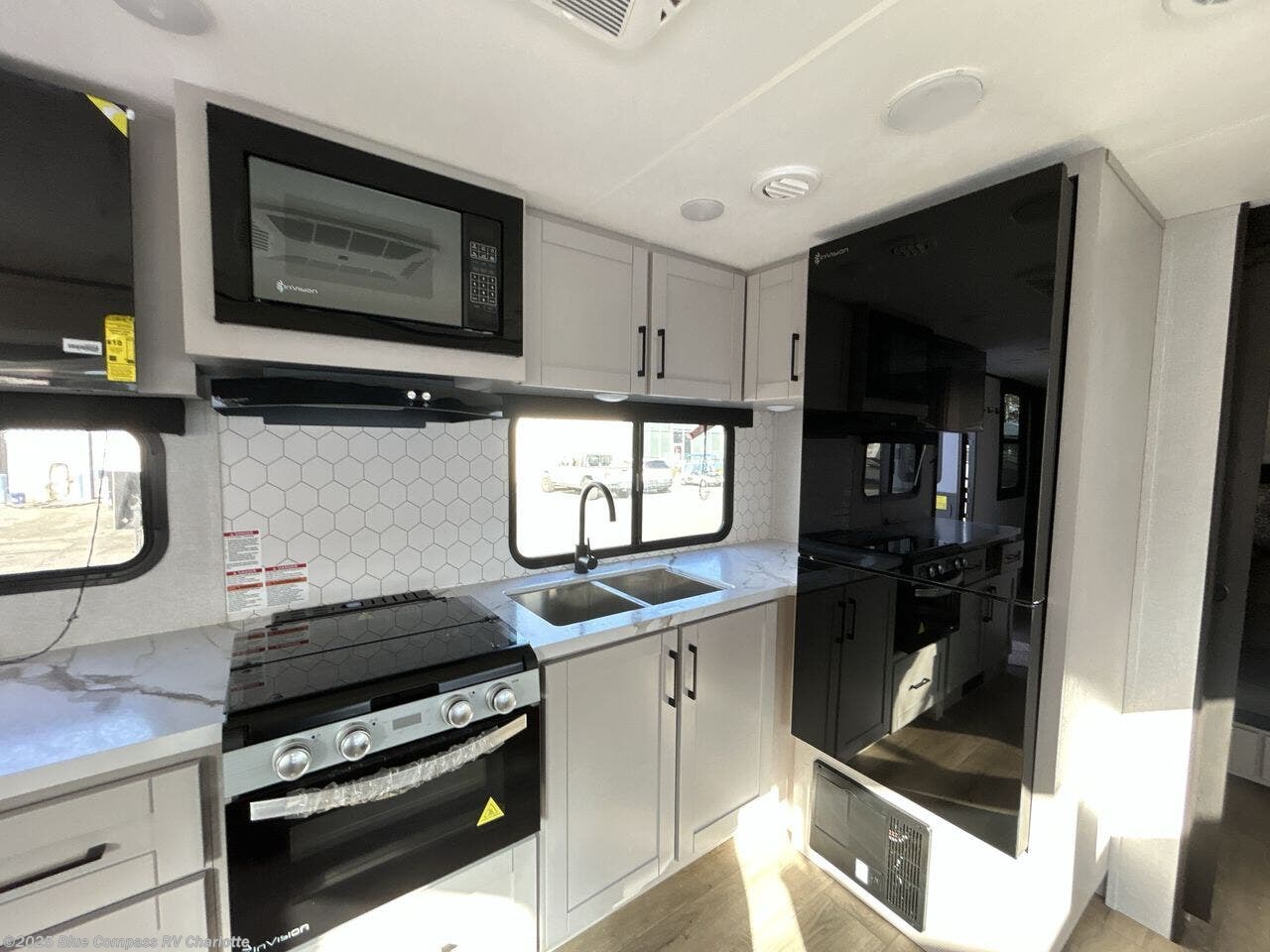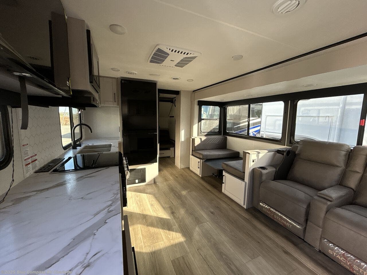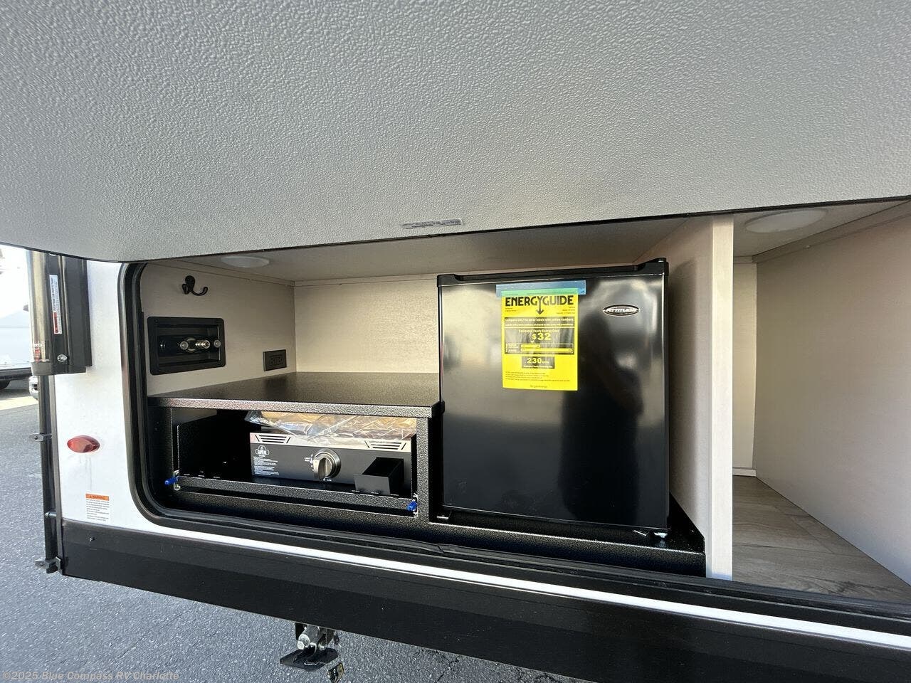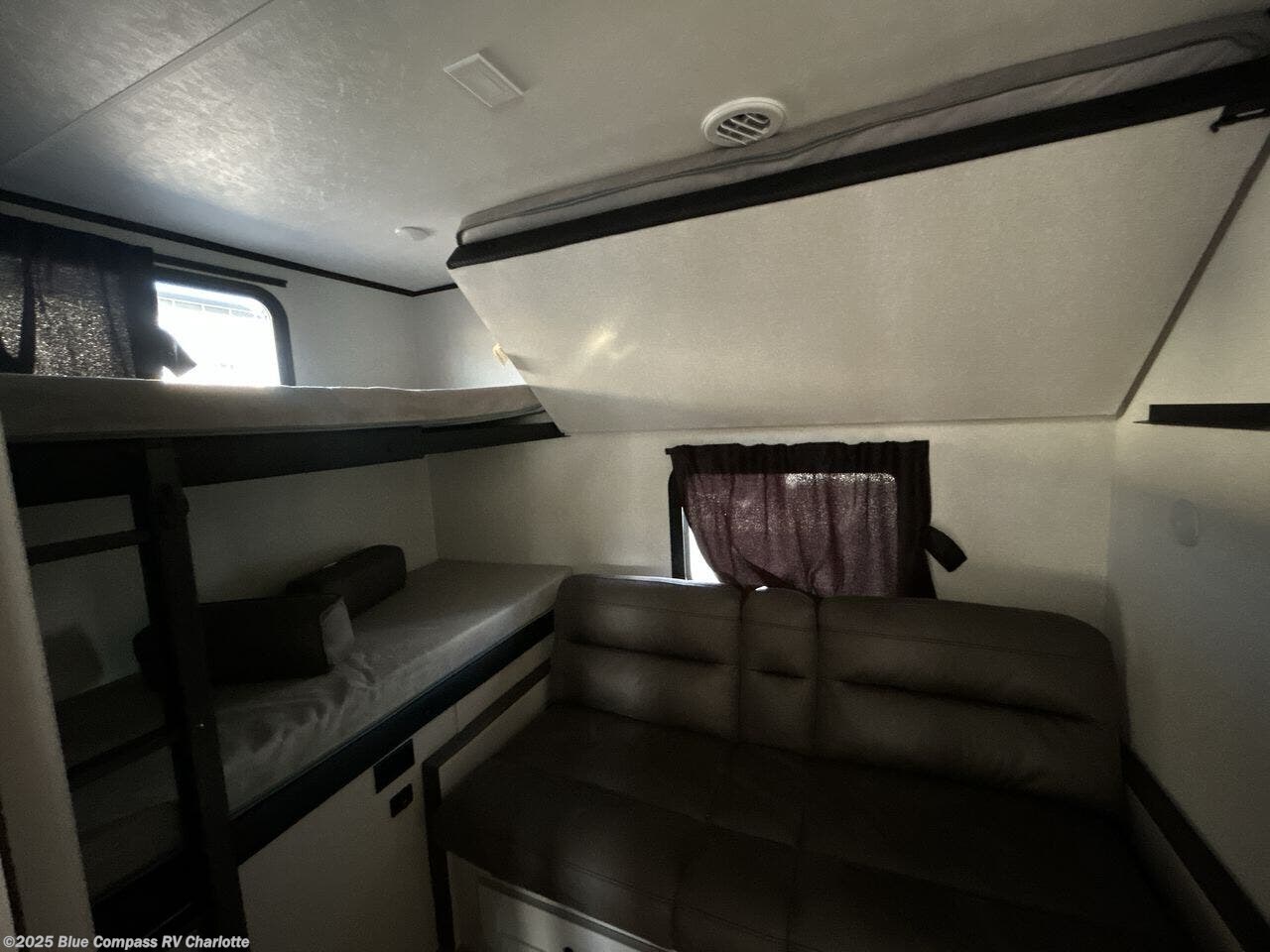 If you've been searching for a travel trailer that will fit your whole gang, this is the one! Because there is a rear private bunkhouse with three bunks and a jackknife sofa, your guests or kids will have their own space each night. There is also an exterior cargo door so you can pack camp gear directly into the bunkhouse for convenience! The combined living area and kitchen is open and spacious thanks to the large slide out, and here you'll enjoy the tri-fold sofa and booth dinette that can also serve as even more sleeping space if needed. There is also a pantry plus additional storage, along with a stainless-steel sink and a 11 cubic ft refrigerator to store your groceries. There is an entertainment center with an LED Smart TV, and a full bath with a 30" x 36" where you can clean up after lake swimming. You will love the front private bedroom with a queen bed, a wardrobe, dual nightstands, and overhead storage so everything has its place!