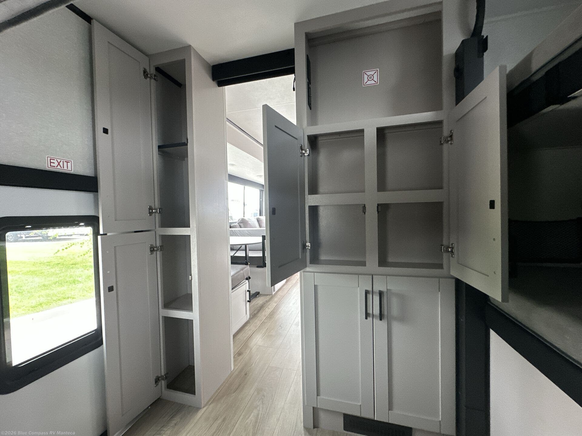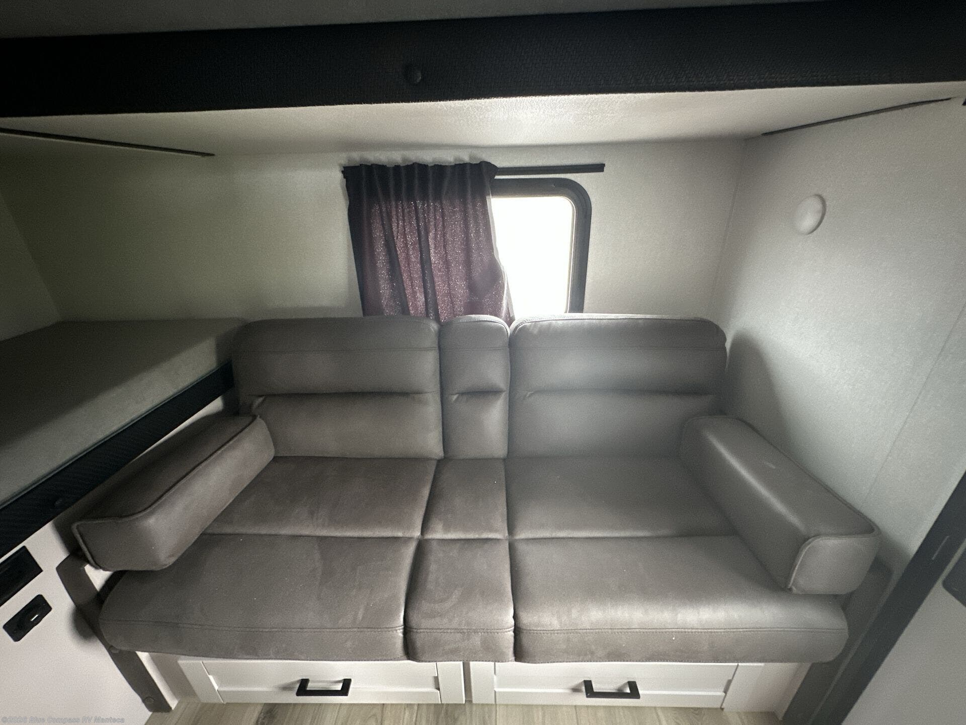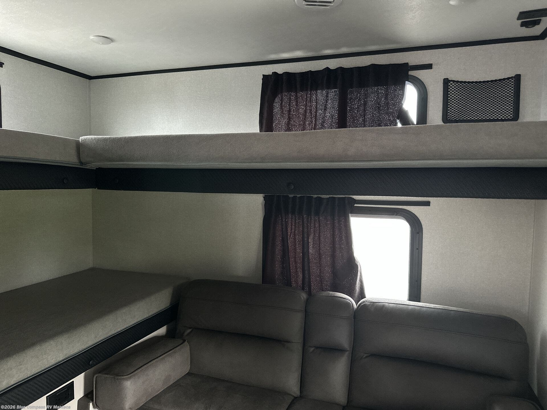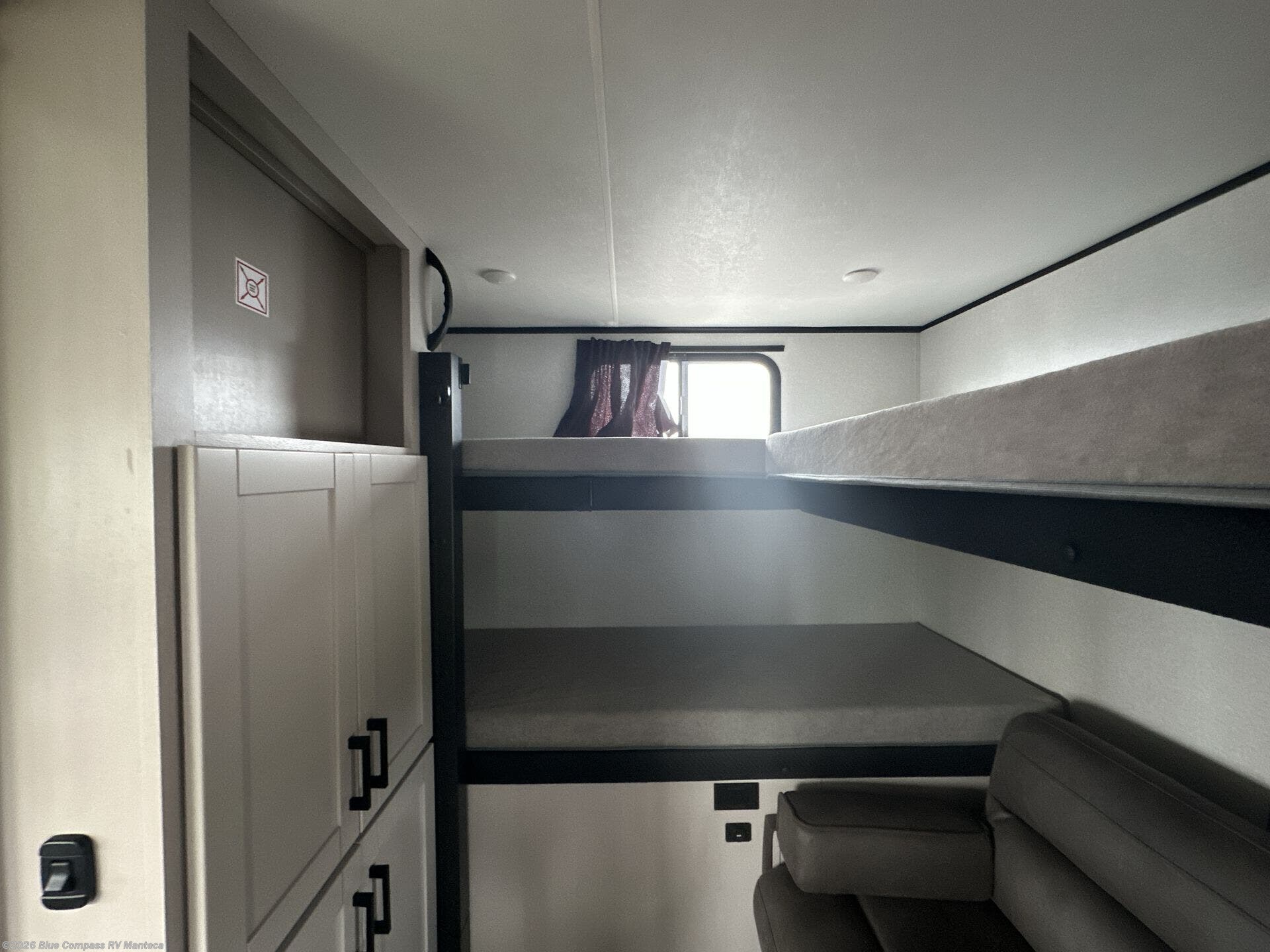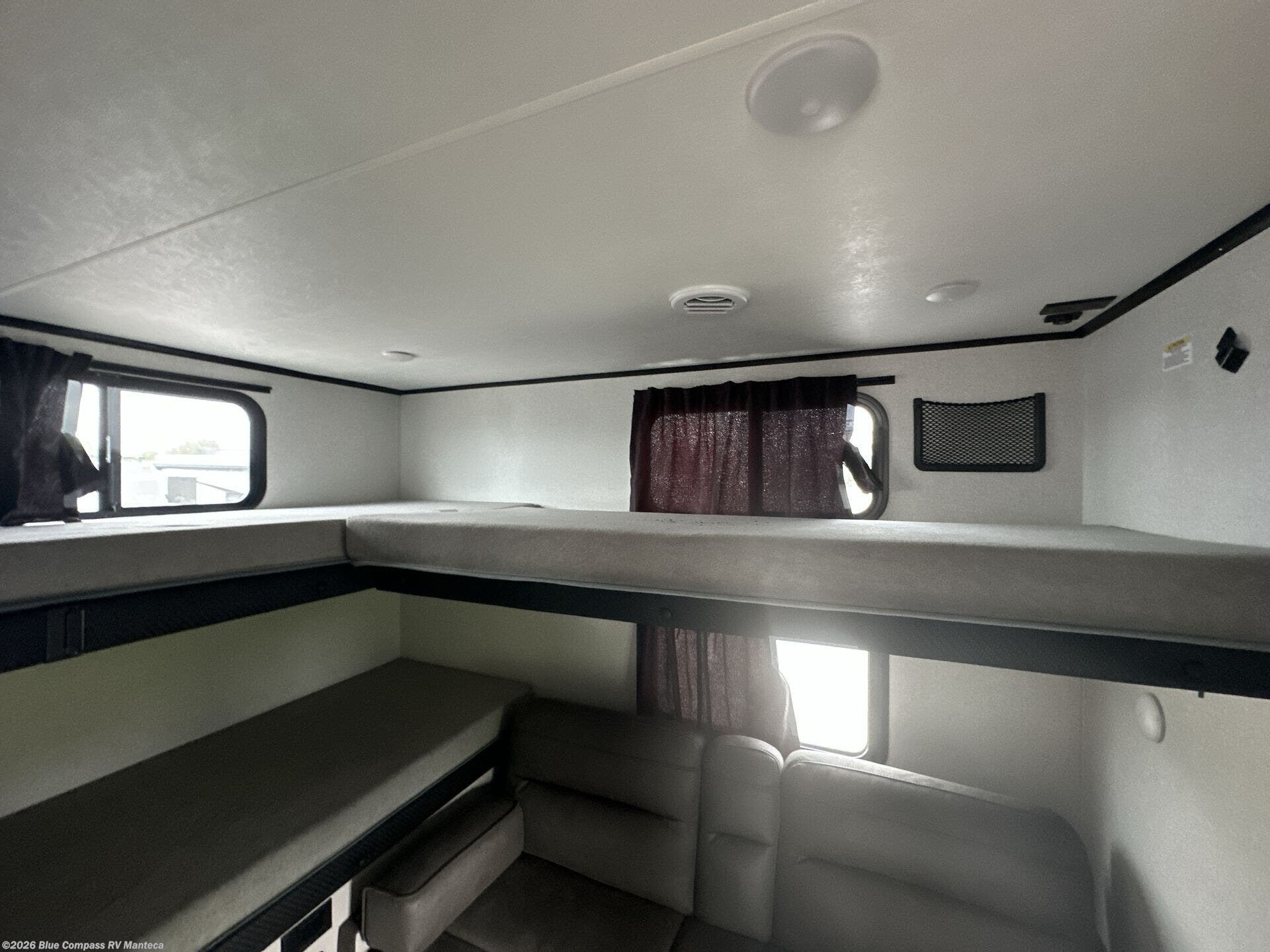 If you've been searching for a travel trailer that will fit your whole gang, this is the one! Because there is a rear private bunkhouse with three bunks and a jackknife sofa, your guests or kids will have their own space each night. There is also an exterior cargo door so you can pack camp gear directly into the bunkhouse for convenience! The combined living area and kitchen is open and spacious thanks to the large slide out, and here you'll enjoy the tri-fold sofa and booth dinette. There is also a pantry plus additional storage, an entertainment center with an LED Smart TV, and a full bath where you can clean up after lake swimming. The owners will love the front private bedroom with a queen bed, a wardrobe, dual nightstands, and overhead storage so everything has its place!