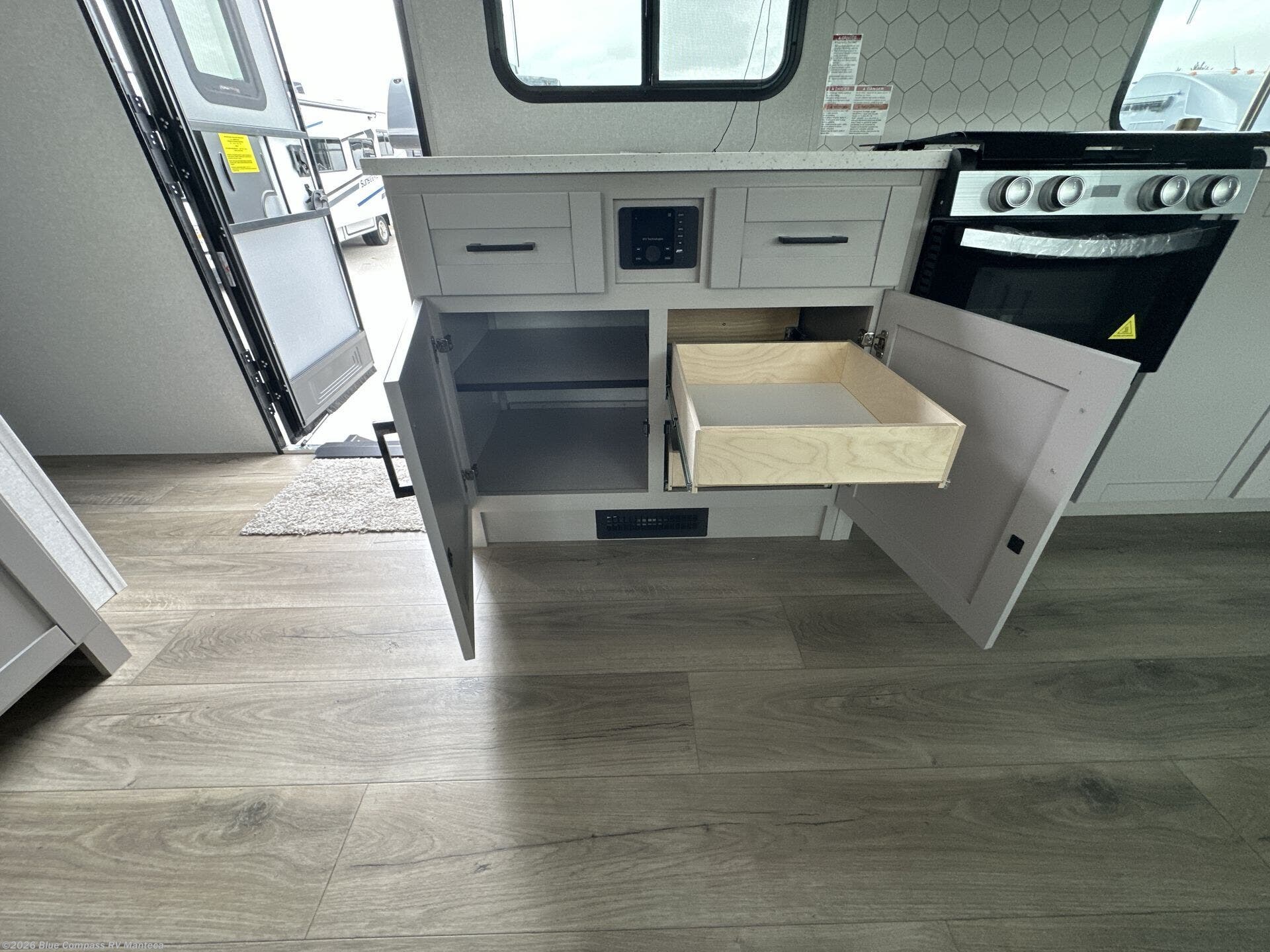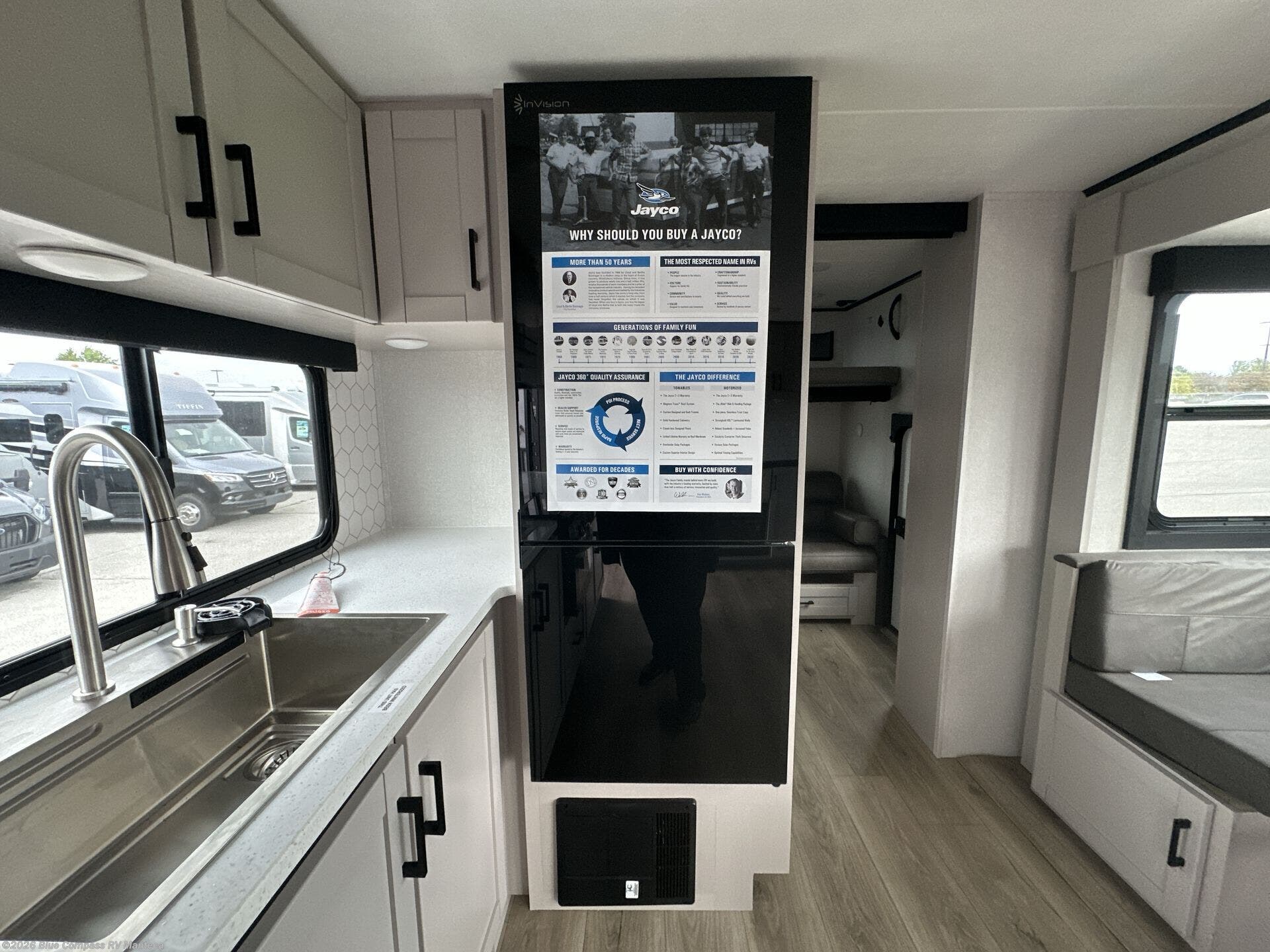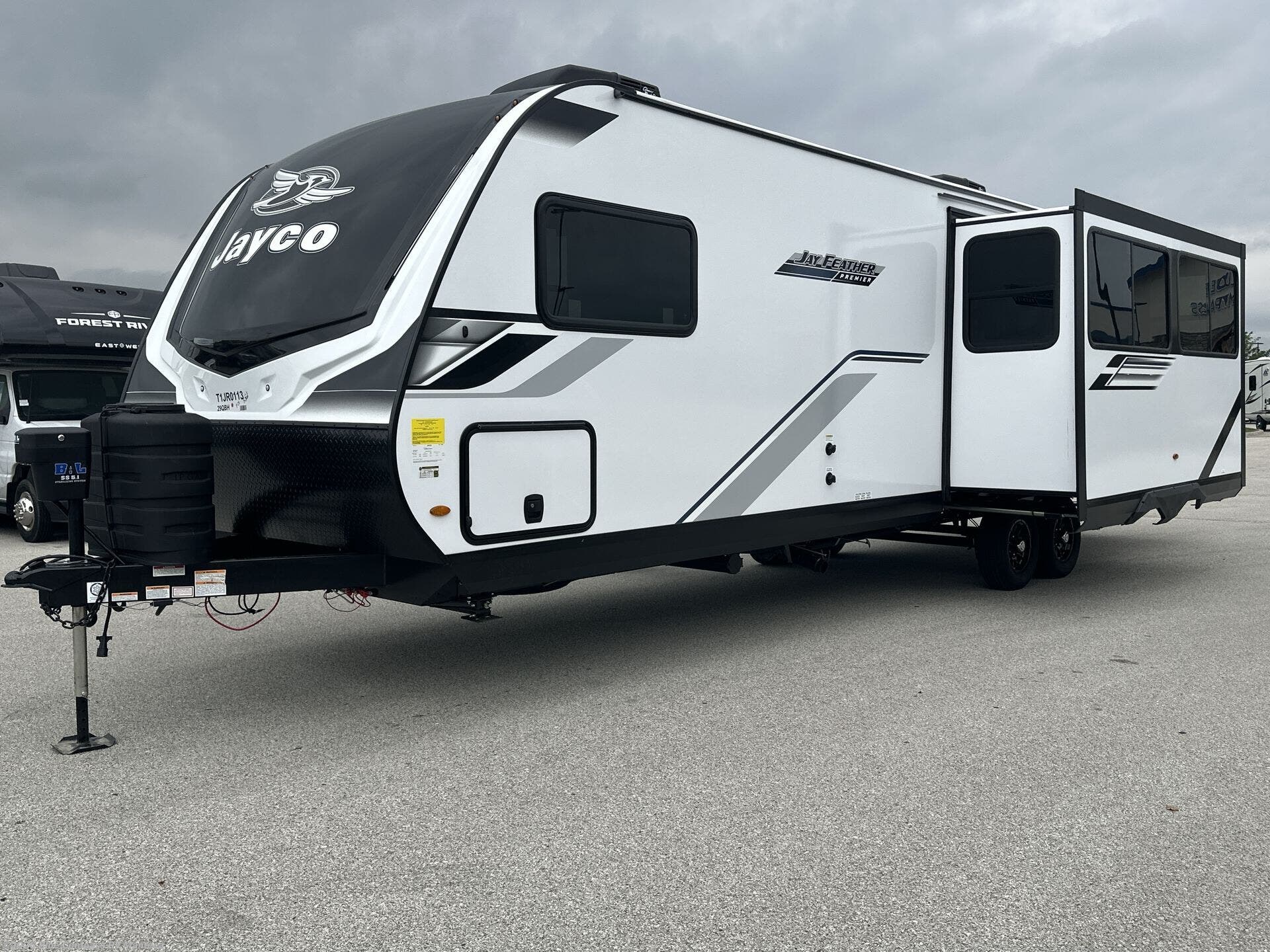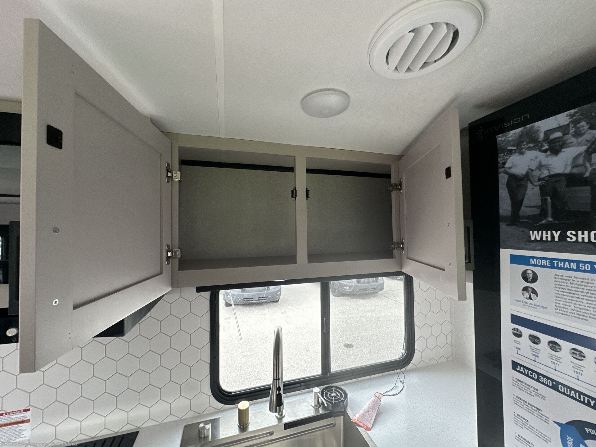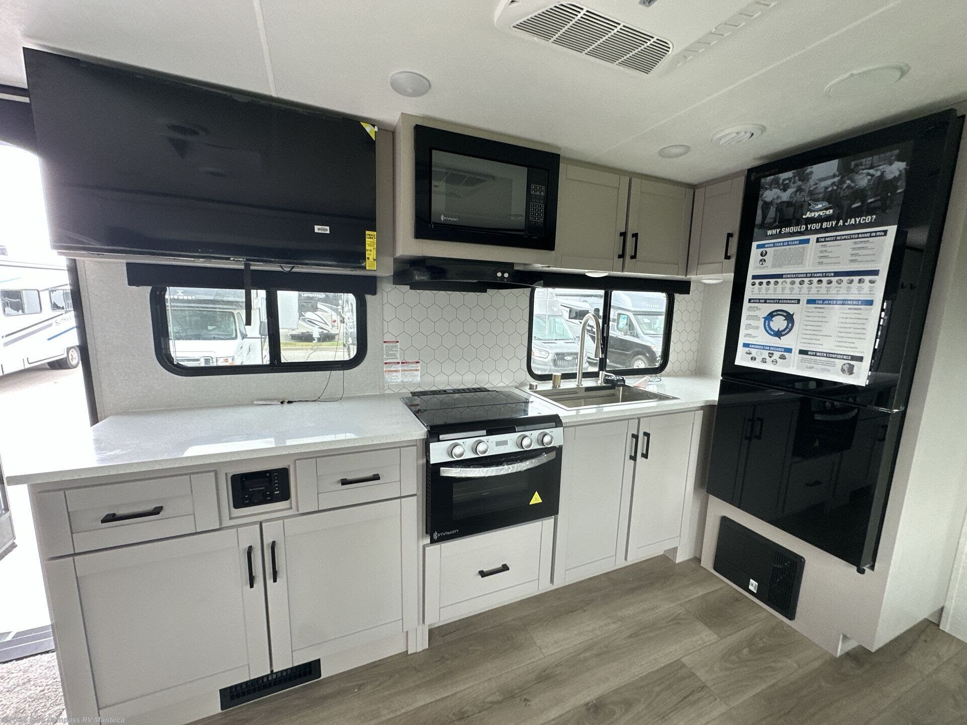 With any Jay Feather travel trailer by Jayco, you will enjoy lightweight towing, convenient exterior amenities, and at-home comforts inside! The Overlander 1 Solar Package included within the Jay Sport Package comes with a 200W solar panel and a 30-amp digital controller so you can enjoy some off-grid camping. There is also a modern graphics package with a dual-colored sidewall, LCI Solid Step fold-down aluminum tread steps on the main entry door, and Climate Shield 0 -100° F tested weather insulation package that will allow you to camp in all sorts of climates. The Customer Value Package will make time outdoors easier than ever with a power tongue jack and a Rock Solid stabilizer system, plus American-made nitro-filled Goodyear tires with self-adjusting electric brakes. More exterior features include a Keyed-Alike locking system, marine grade exterior speakers, a Magnum Truss roof system, and the list goes on! And we haven't even touched on the interior comforts, like the residential style seamless countertops and vinyl flooring throughout, decorative backsplash, handcrafted hardwood door/drawer fronts, and multiple USB charging ports to keep you going!