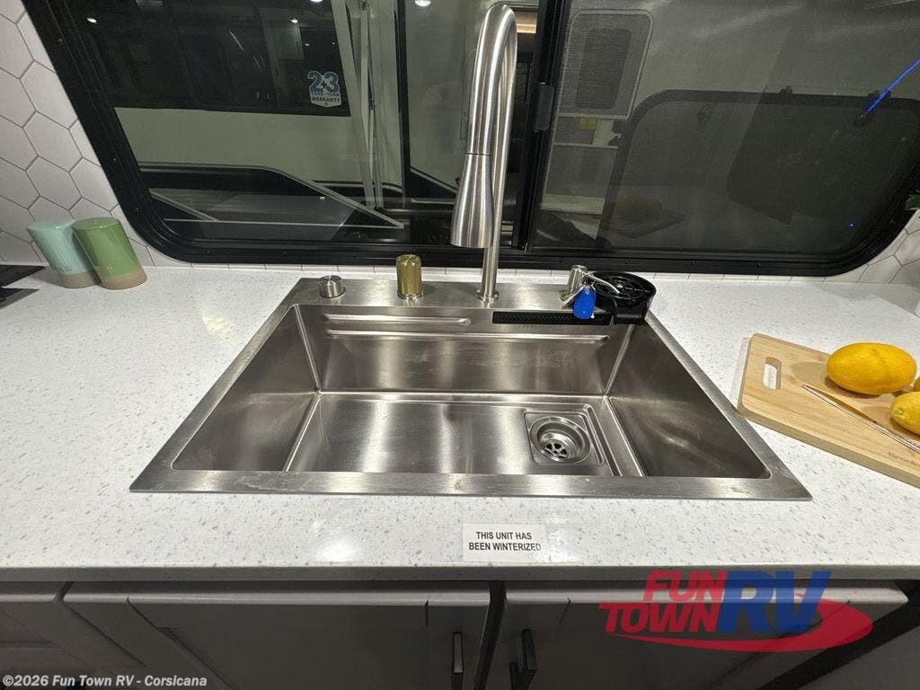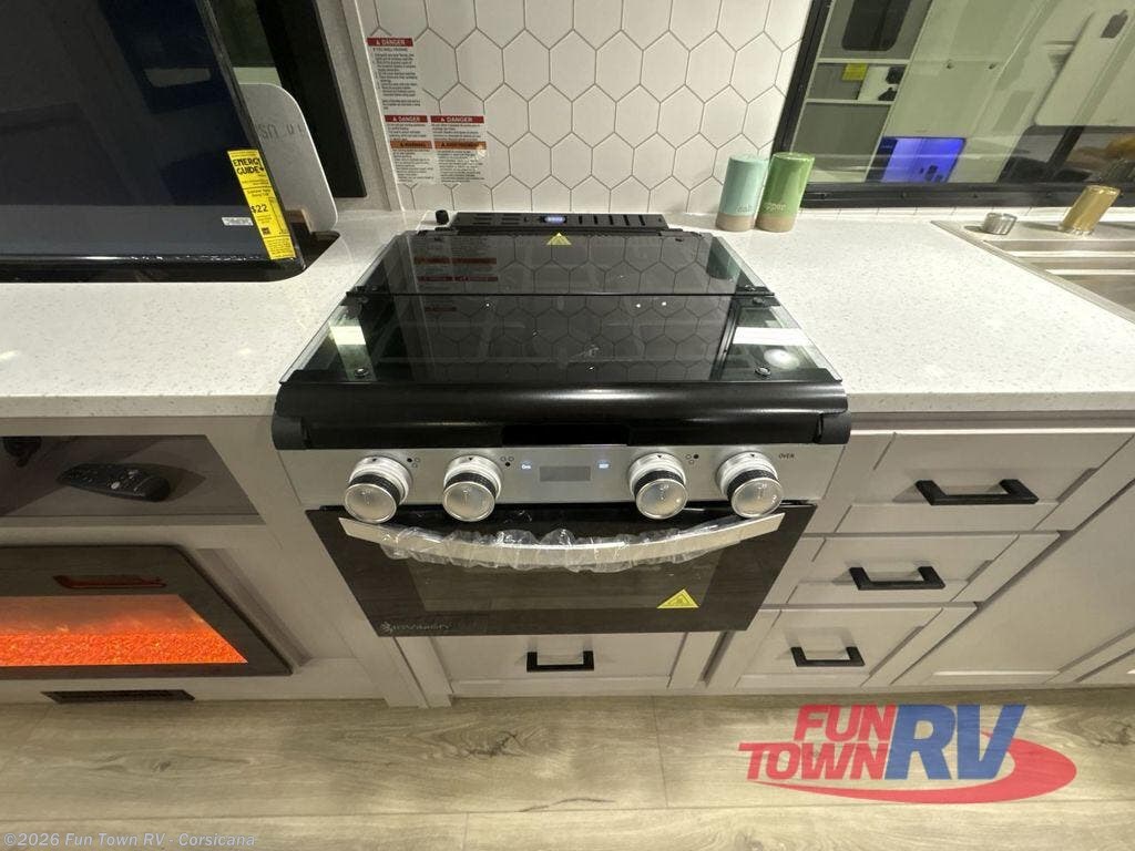 Experience the ultimate in RV living with our luxurious travel trailer, featuring a spacious rear kitchen perfect for meal prep. The pantry and fridge provide ample grocery storage, and the overhead cabinets add extra space for cookware and dishes. Plus, the microwave makes cooking and reheating meals a breeze, and the dinette is a great spot to enjoy meals or play games with family and friends. In the nice living room, you will find a trifold sofa, a perfect place to relax and unwind, and an entertainment center with a fireplace adding warmth and ambiance to the space. The full bathroom is beautifully appointed and provides all the essentials for a comfortable stay. Furthermore, the front bedroom is a serene retreat, featuring a spacious queen bed, dresser, wardrobe, and nightstands beside the bed for ultimate convenience. This travel trailer also features washer and dryer prep, making it easy to hook up to laundry facilities on the go, and with an outside kitchen, you can cook up a storm while enjoying the fresh air and scenery.