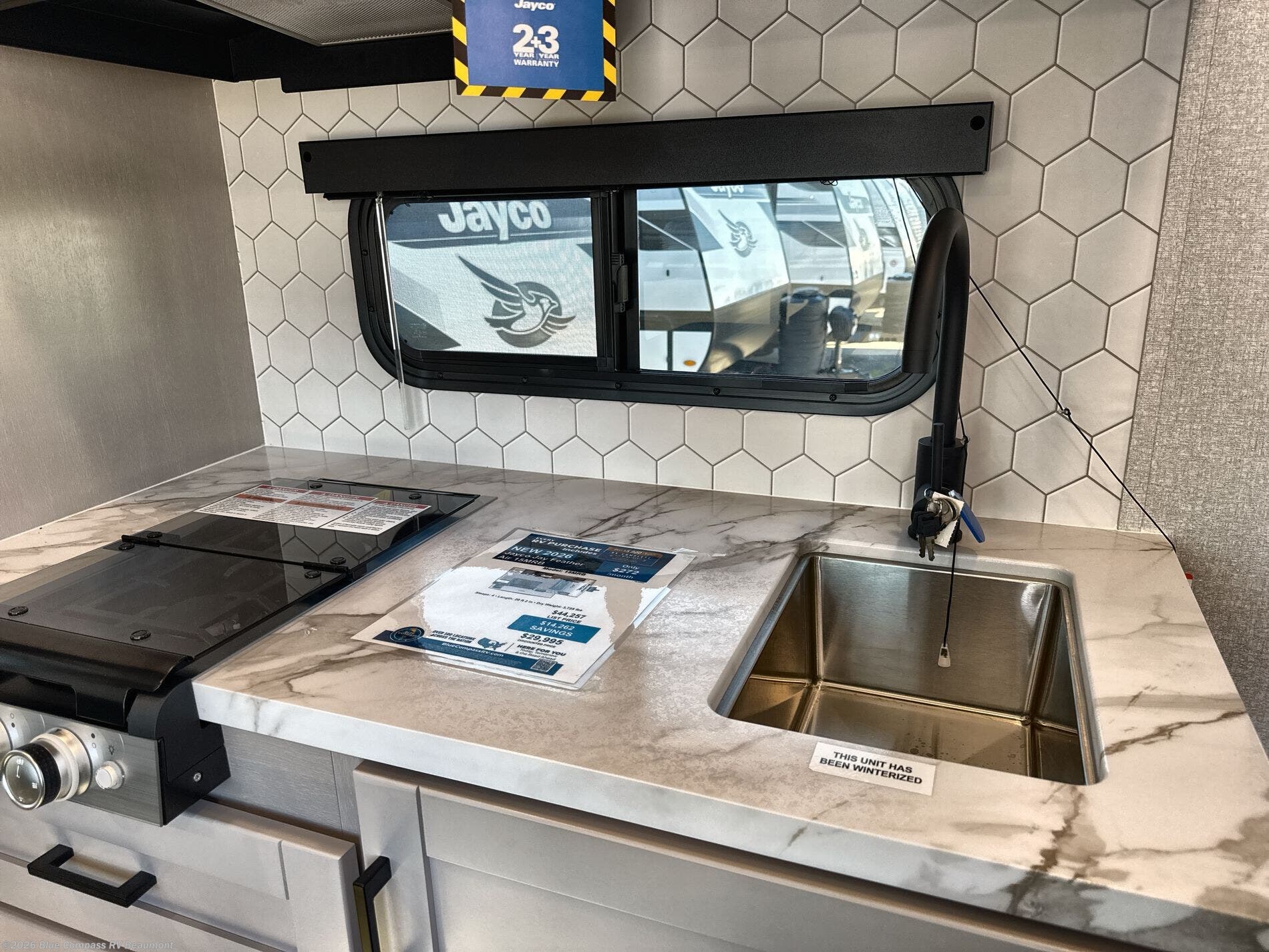 With any Jay Feather Air travel trailer by Jayco, you will enjoy lightweight towing and a variety of features to make each camping trip count! The Climate Shield insulation system helps extend your camping season by keeping you comfortable even in extreme weather conditions, and the Rock Solid stabilizer system means set up will be a breeze. An 18" rear roof ladder lets you easily clean the top of your Magnum Truss roof, and the 2" receiver will be perfect for your bike rack. The Overland 1 Solar Package with a 200W solar panel and 30-amp controller will provide off-grid capabilities, or you can can choose the optional Overland 2 Solar Package with two panels instead! Each Jay Feather Air includes residential-style seamless countertops inside, along with stainless steel sinks, decorative backsplash, and decorative roller shades with a reflective barrier to help keep the sun's rays out.