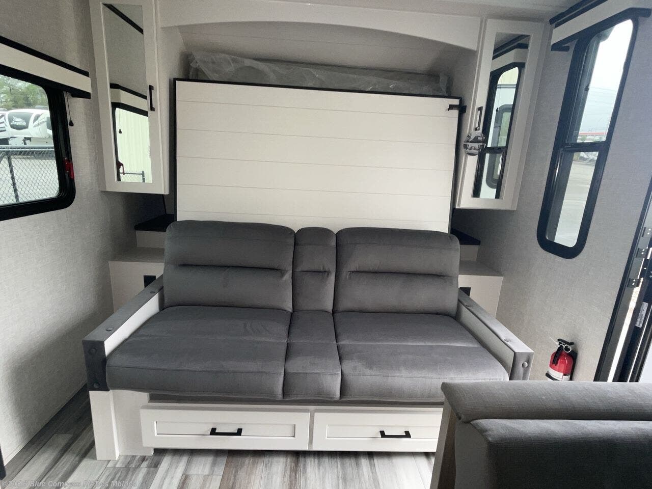 This is the perfect travel trailer for two to three campers! You'll have plenty of space during the day since there is a sofa up front, with a Murphy bed that can be folded down when you're ready for bed. There are also dual bedside wardrobes and nightstands to keep your space tidy. Breakfast can be made on the two-burner cooktop or in the convection microwave, and there is a booth dinette where you can dine together. If the weather is nice, you may just find yourselves cooking on the exterior griddle and dining under the 13' awning! The full rear bath is sure to come in handy, and there is plenty of storage throughout to keep all your belongings put away!