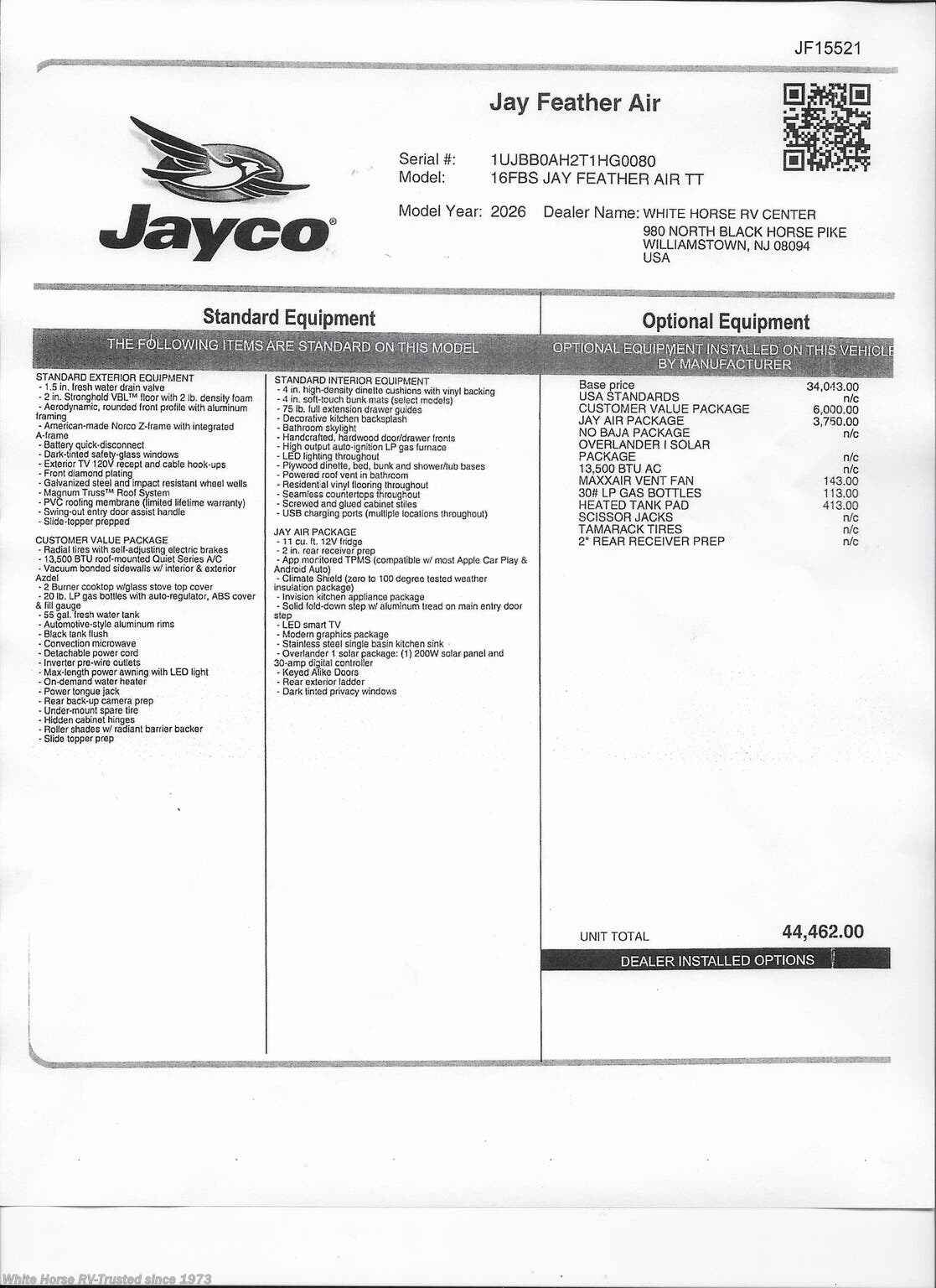 This Stock #JF15521 also has the following factory options included: Maxx Air Vent Fan, 120V Heated Tank Pads and 30# LP gas bottles (2).... all backed by Jayco’s 2+3 year warranty! MSRP $44,462.